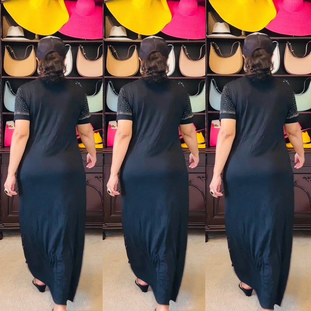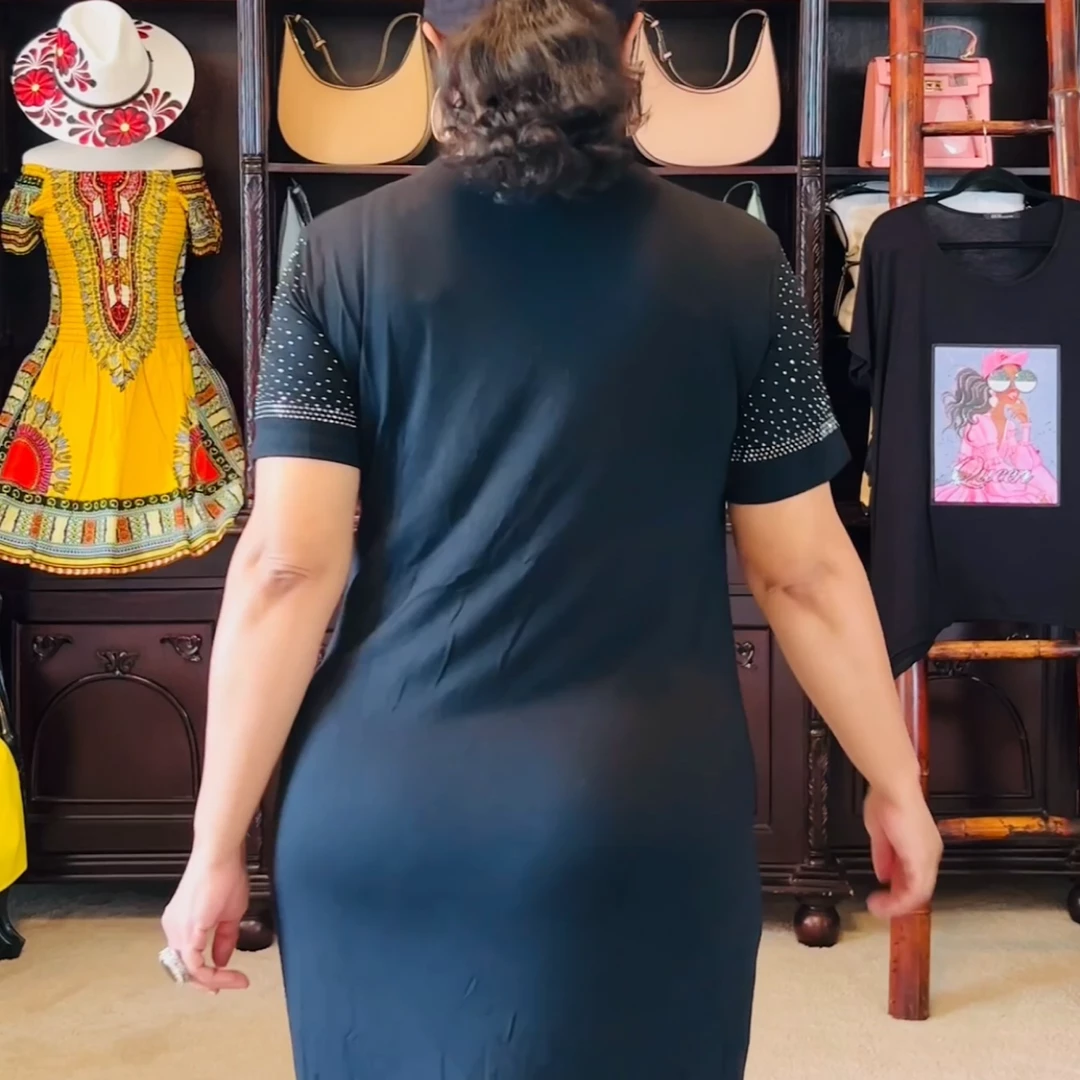 Dress fabric is super super soft cotton with spandex for great stretch. Dress runs true to size and will stretch to fit but you will want to order your size to keep the front of the dress from over stretching since the stones are on the front. Dress is comfortable and it feels cool against your skin. I so love this dress and did not want to take it off because it was so soft on. If you are looking for the ultimate level of comfort in the next dress you buy, get this soft light weight dress and you’ll wish you could wear it every day. Dress is 57 inches long and model is 5 feet 6 inches tall with 2 inch heels on and she is wearing size 14-16 XL. Model’s bust measures 42 inches and waist measures 36 inches and hips 47 inches. Fabric does stretch. Model wore knee length spanxs for smoothness in the back of the dress. You could also wear biker shorts like leggings underneath the dress as well. Care instructions dry clean to protect your stones. Bling cap is sold separately on the website. To find the cap on our website, just scroll down towards the end of this page. Ships from Houston, Texas by Social Butterfly Collection.
