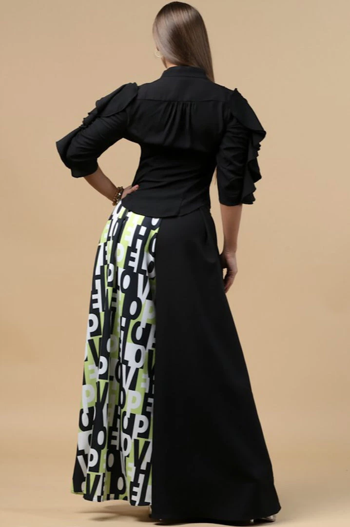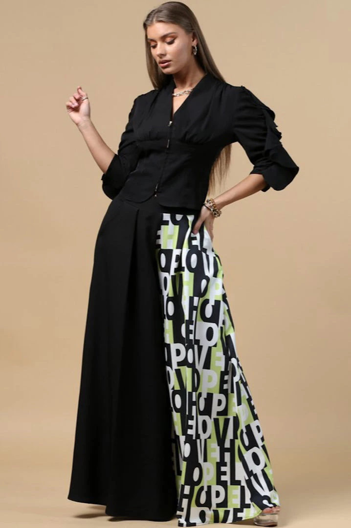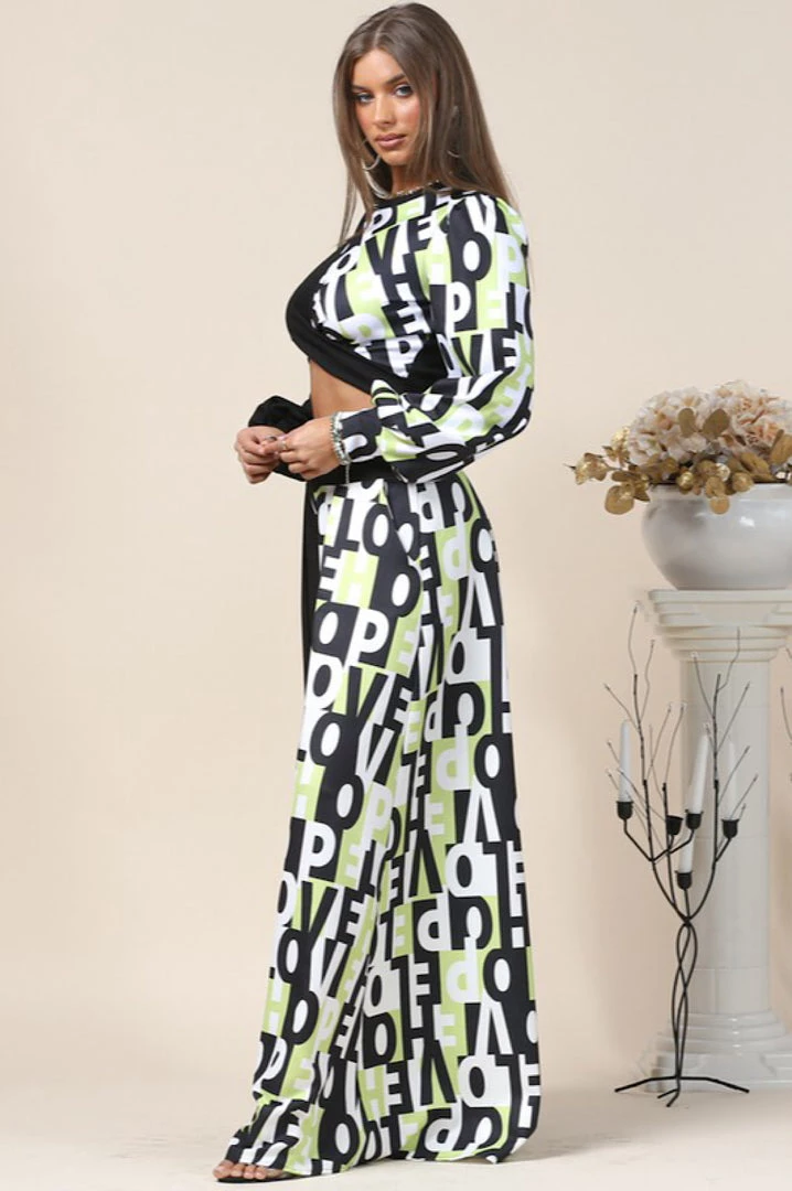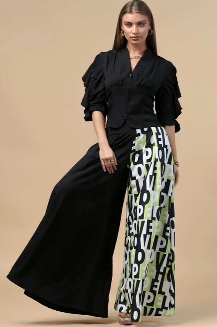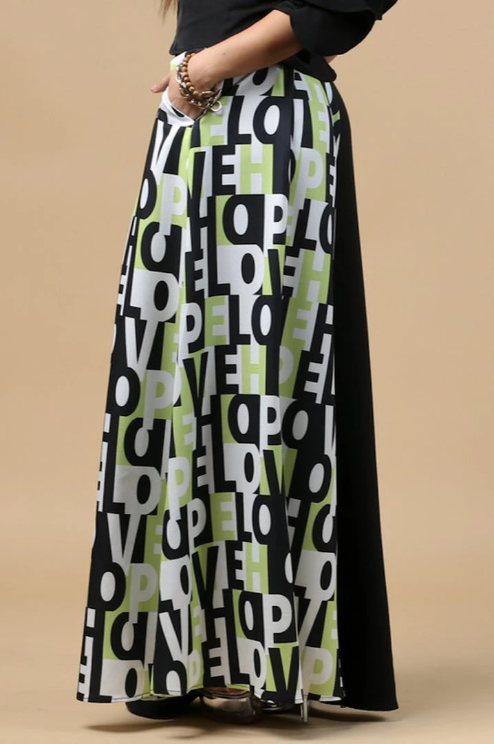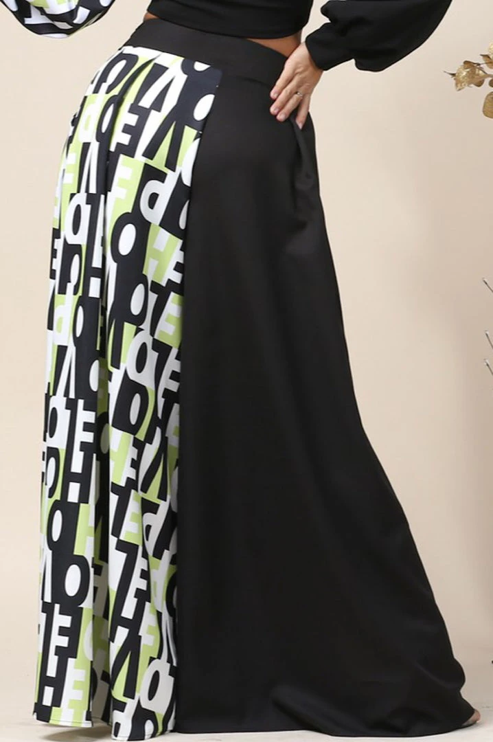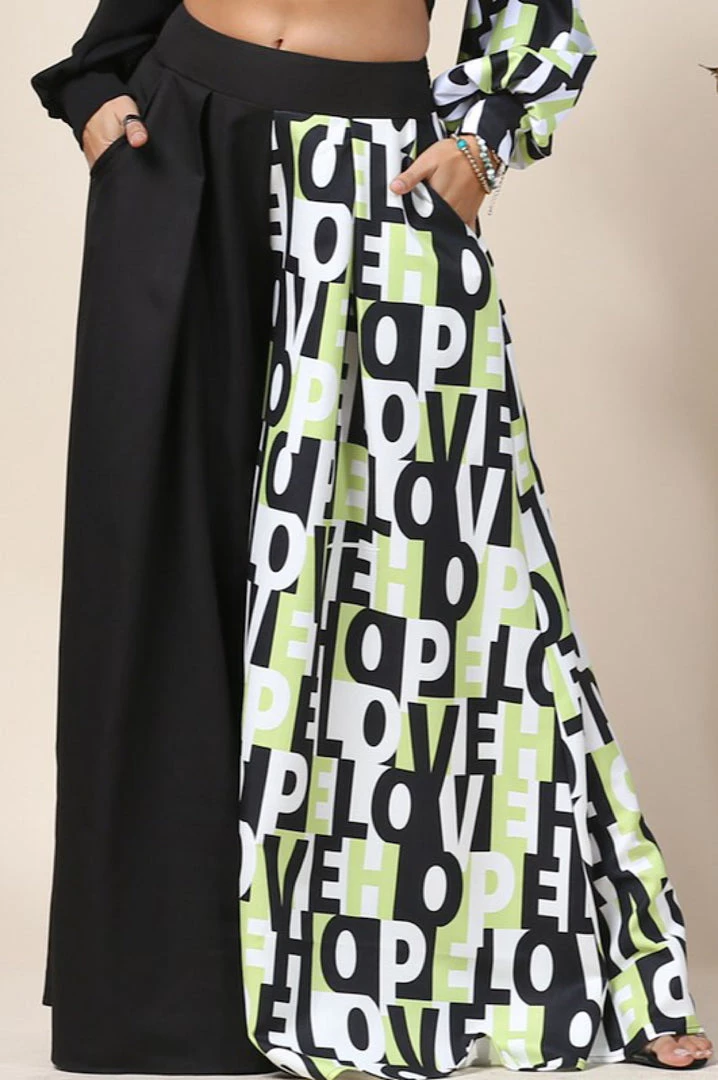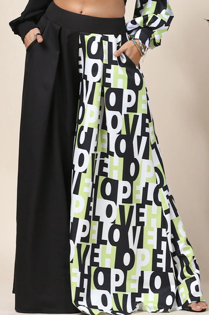 The modern day wide leg palazzo pants in a black print color block Hope & Love print. The print section is black, white and green. The pants have a side zipper with hook side closure. These pants are super long at 45 inches long and and inseam of 33 inches. The models are between 5 feet 9 inches tall and 5 feet 8 inches tall and they have on very high heels about 4 and 5 inch heels. The pants are ideal if you are really tall but most will have to have them hemmed or wear really high heels if you are petite or shorter. Polyester and spandex blend with plenty of stretch. The waistband has elastic and will stretch to fit you comfortably. The pants have side pockets. Beautiful feel and look to this fabric. Made in the USA. Ships from Houston, Texas by Social Butterfly Collection.