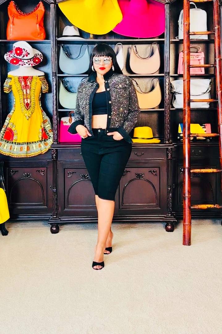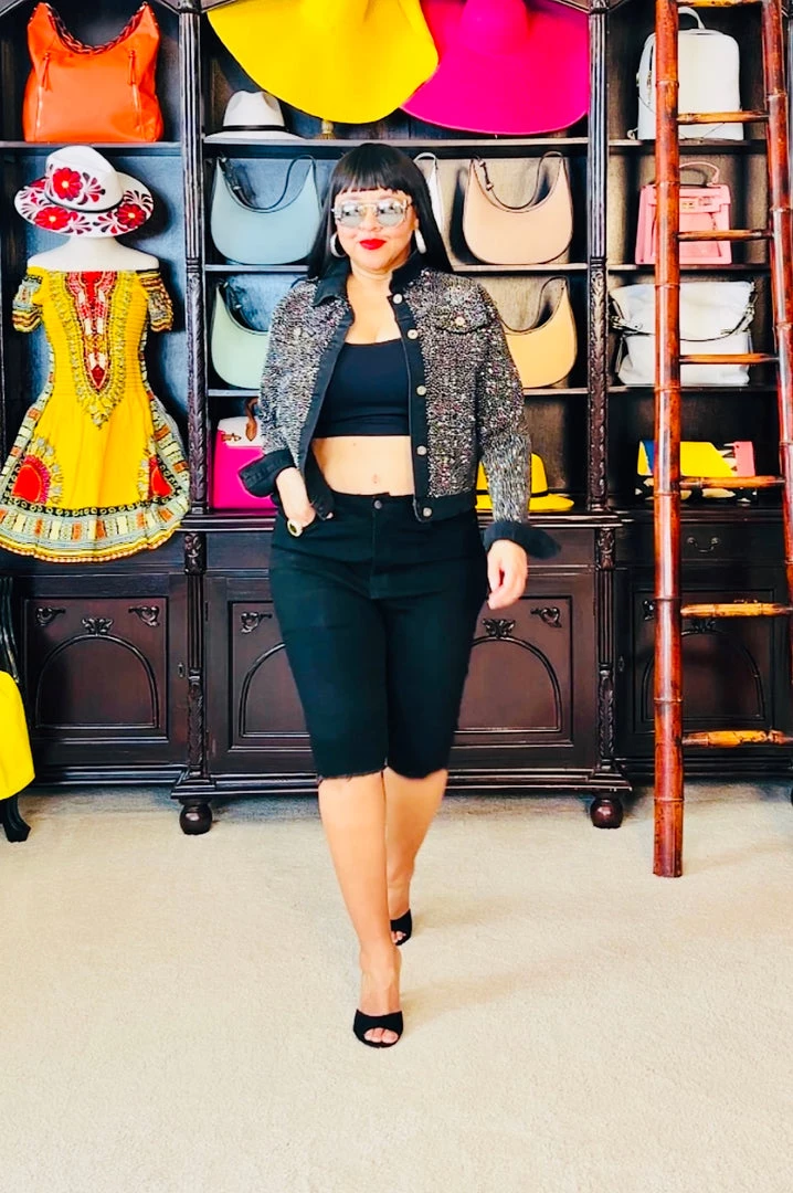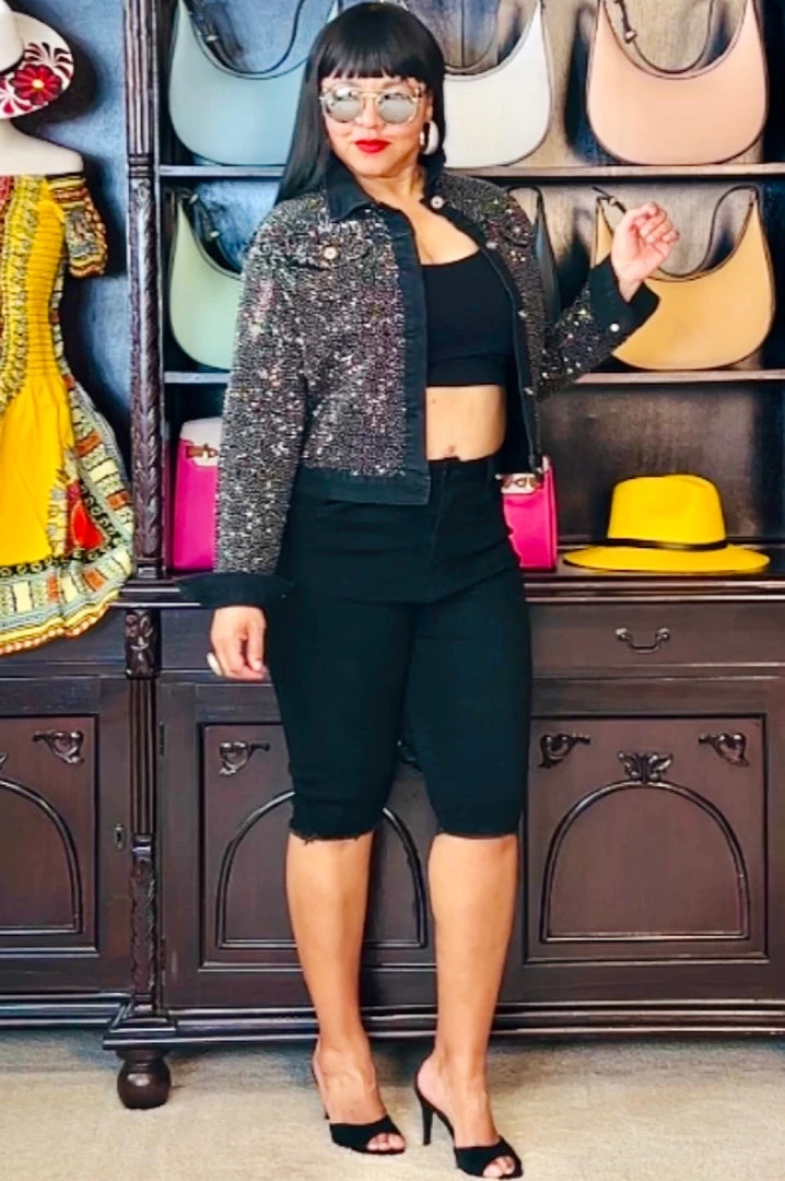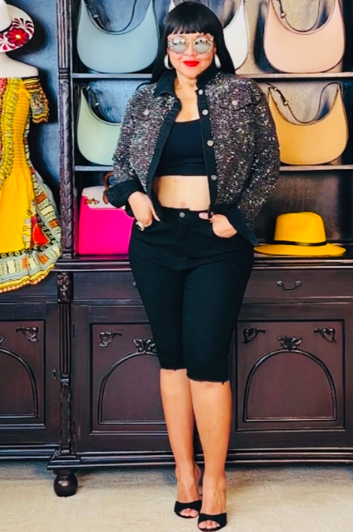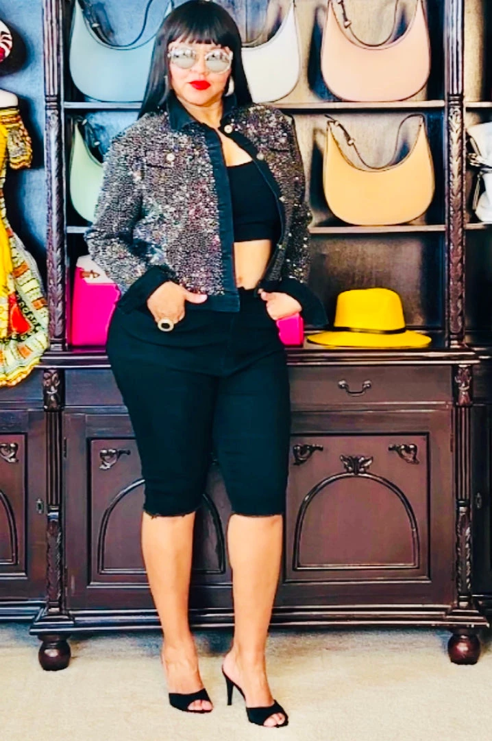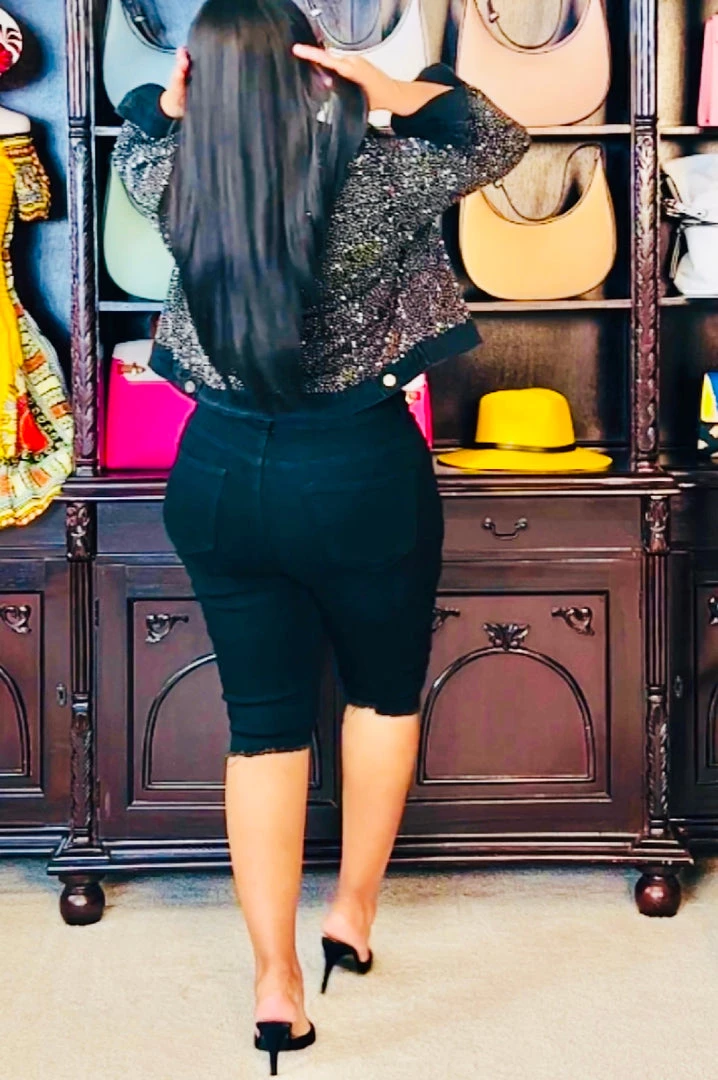 Shorts only. Jacket sold separately. These stretchy black or blue denim shorts will be your best add to your Wardrobe this summer. The shorts are super comfortable and they stretch all over. They are designed to fall at your knee or you could easily fold or roll them up. Fabric is soft spandex and cotton denim blend. The waistband also has great stretch as well. The front of the shorts have zipper button closure. They measure 23 inches long and 13 inches inseam. They will look great with a wide variety of tops from dressy casual to a basic tee. Shorts only. Model has on size 14-16 and she is 5 feet 6 inches tall. Her waist is 34 inches and hips are 46 inches. Ships from Houston, Texas by Social Butterfly Collection.