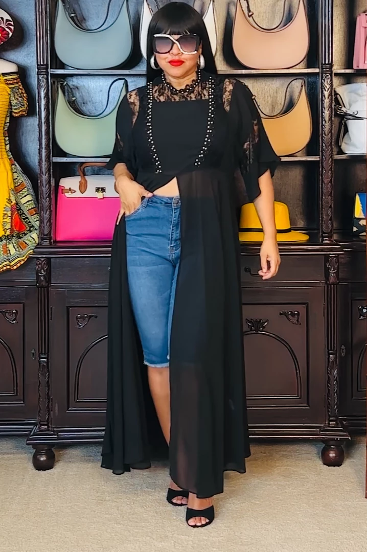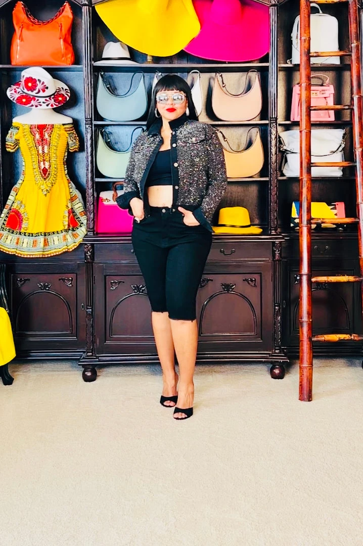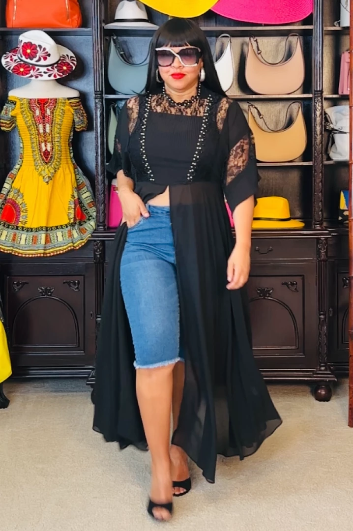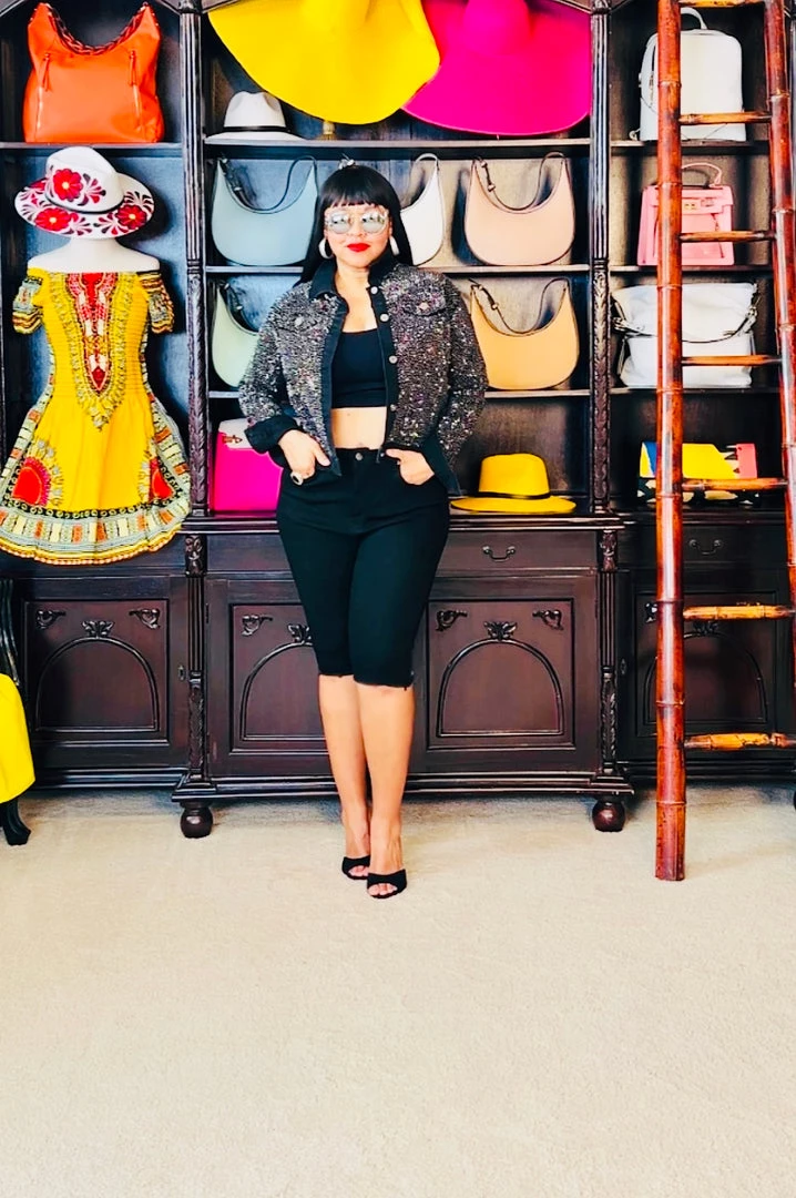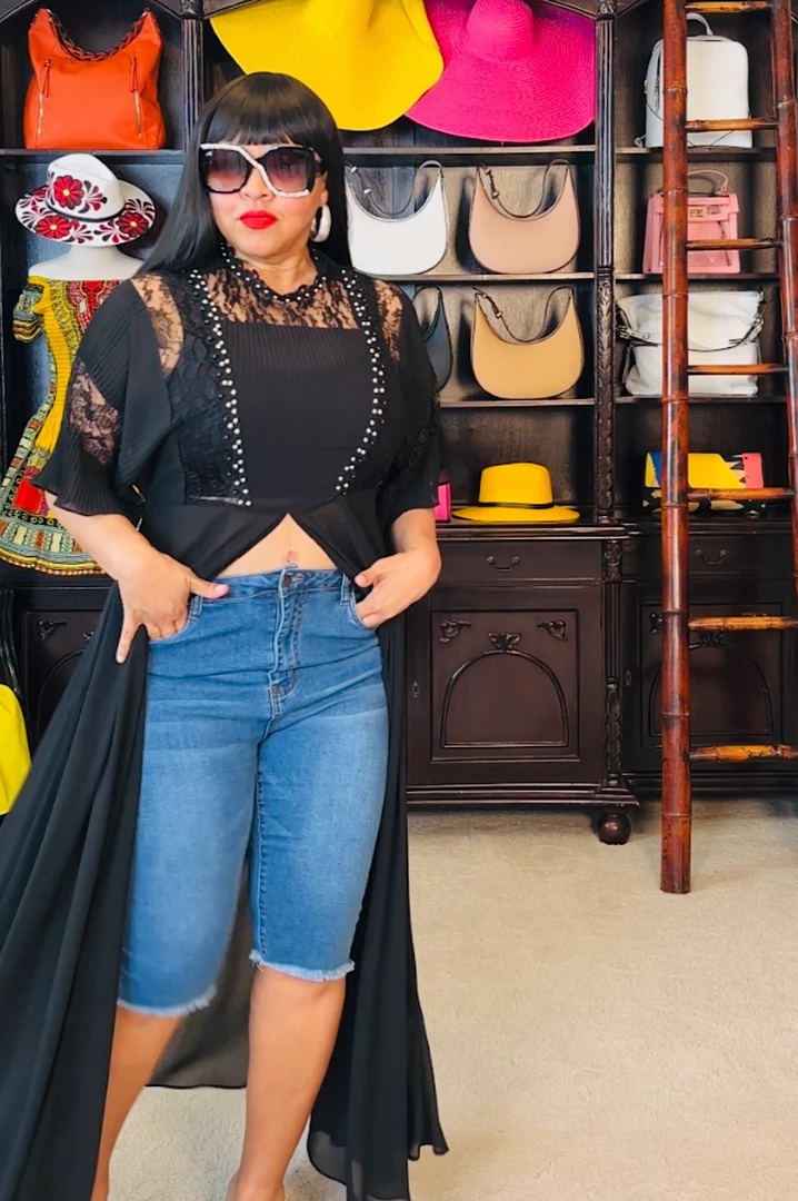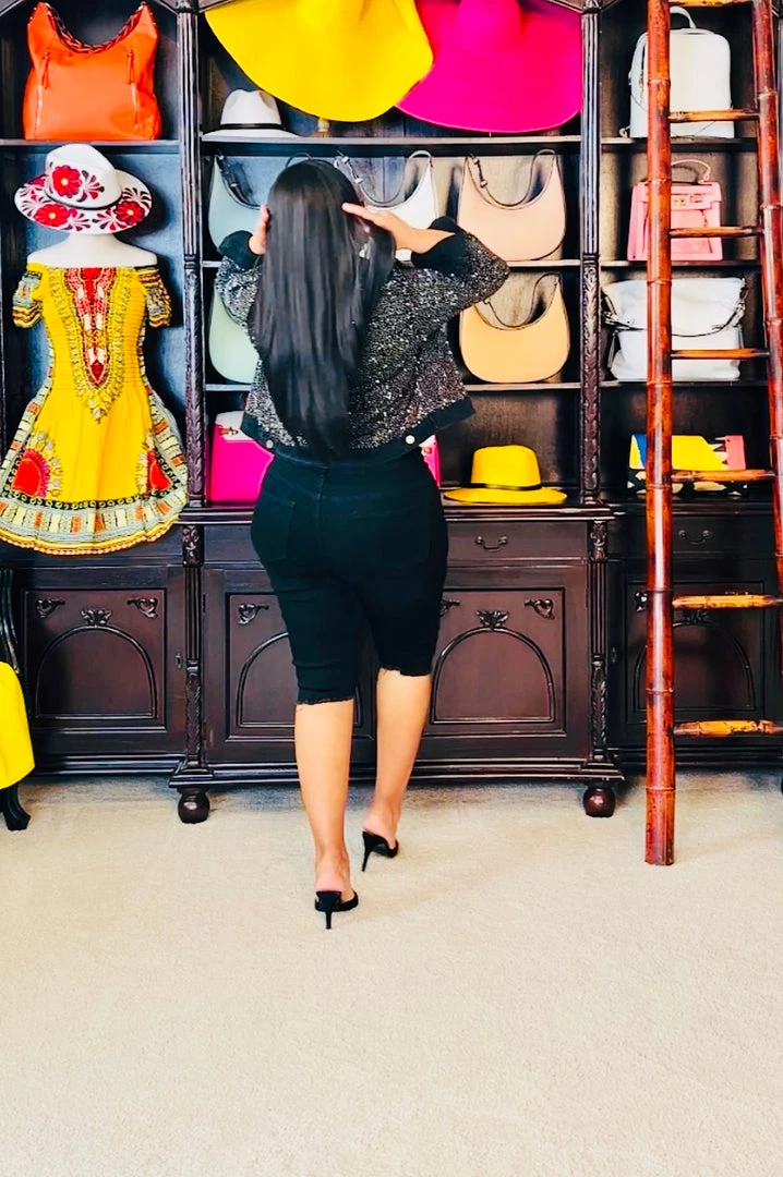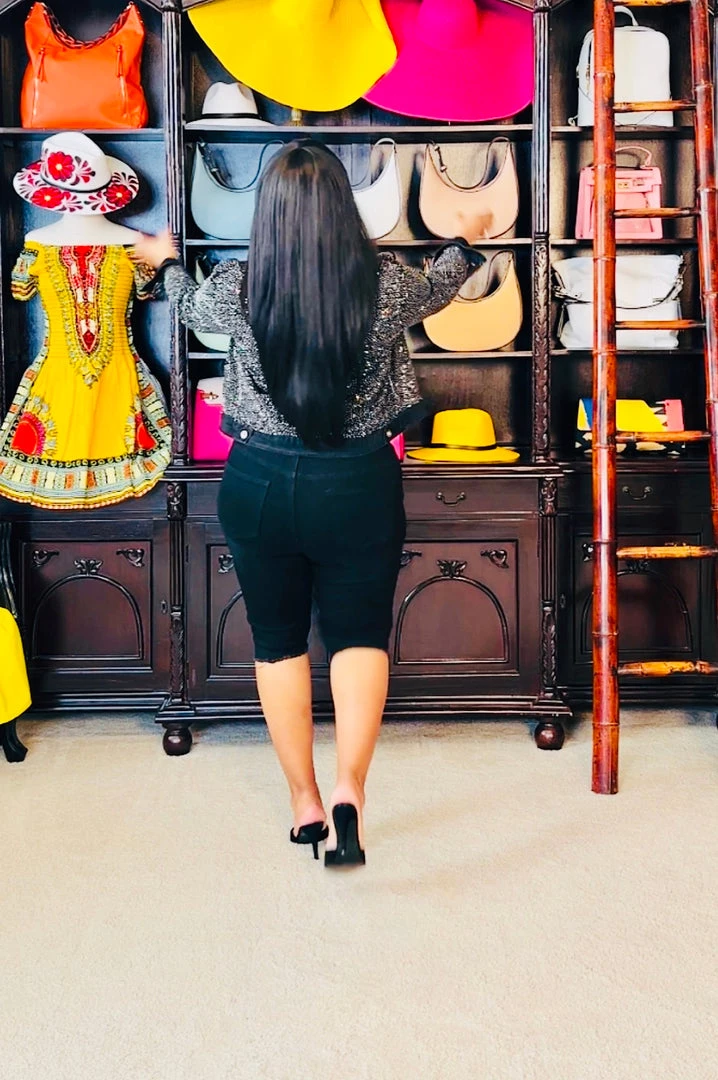 Shorts only. Jacket sold separately. These stretchy black or blue denim shorts will be your best add to your Wardrobe this summer. The shorts are super comfortable and they stretch all over. They are designed to fall at your knee or you could easily fold or roll them up. Fabric is soft spandex and cotton denim blend. The waistband also has great stretch as well. The front of the shorts have zipper button closure. They measure 23 inches long and 13 inches inseam. They will look great with a wide variety of tops from dressy casual to a basic tee. Shorts only. Model has on size 14-16 and she is 5 feet 6 inches tall. Her waist is 34 inches and hips are 46 inches. Ships from Houston, Texas by Social Butterfly Collection.