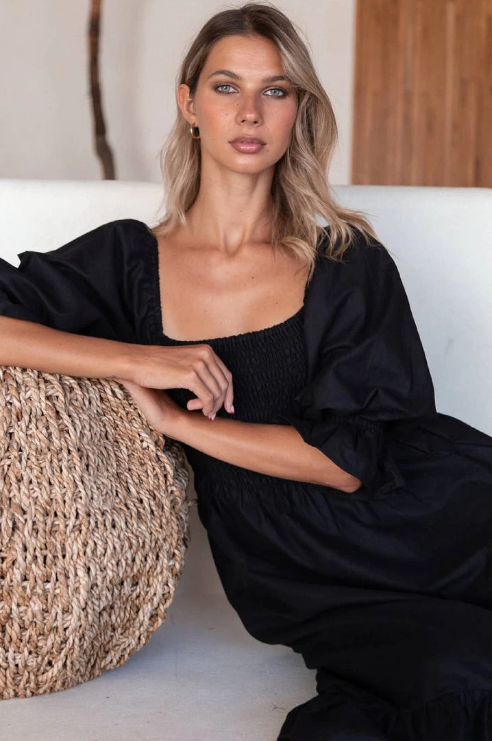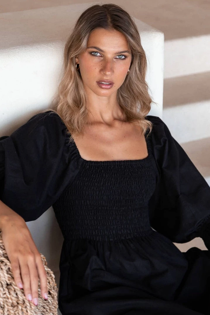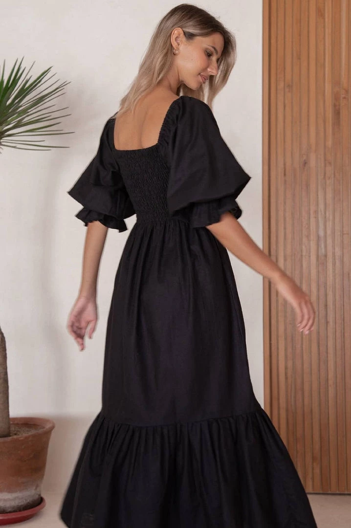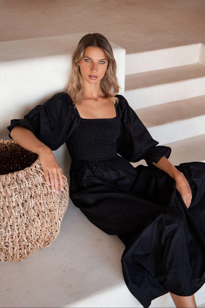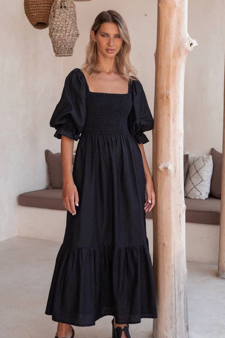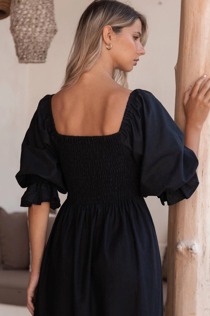 Black Linen Smocked Midi Dress