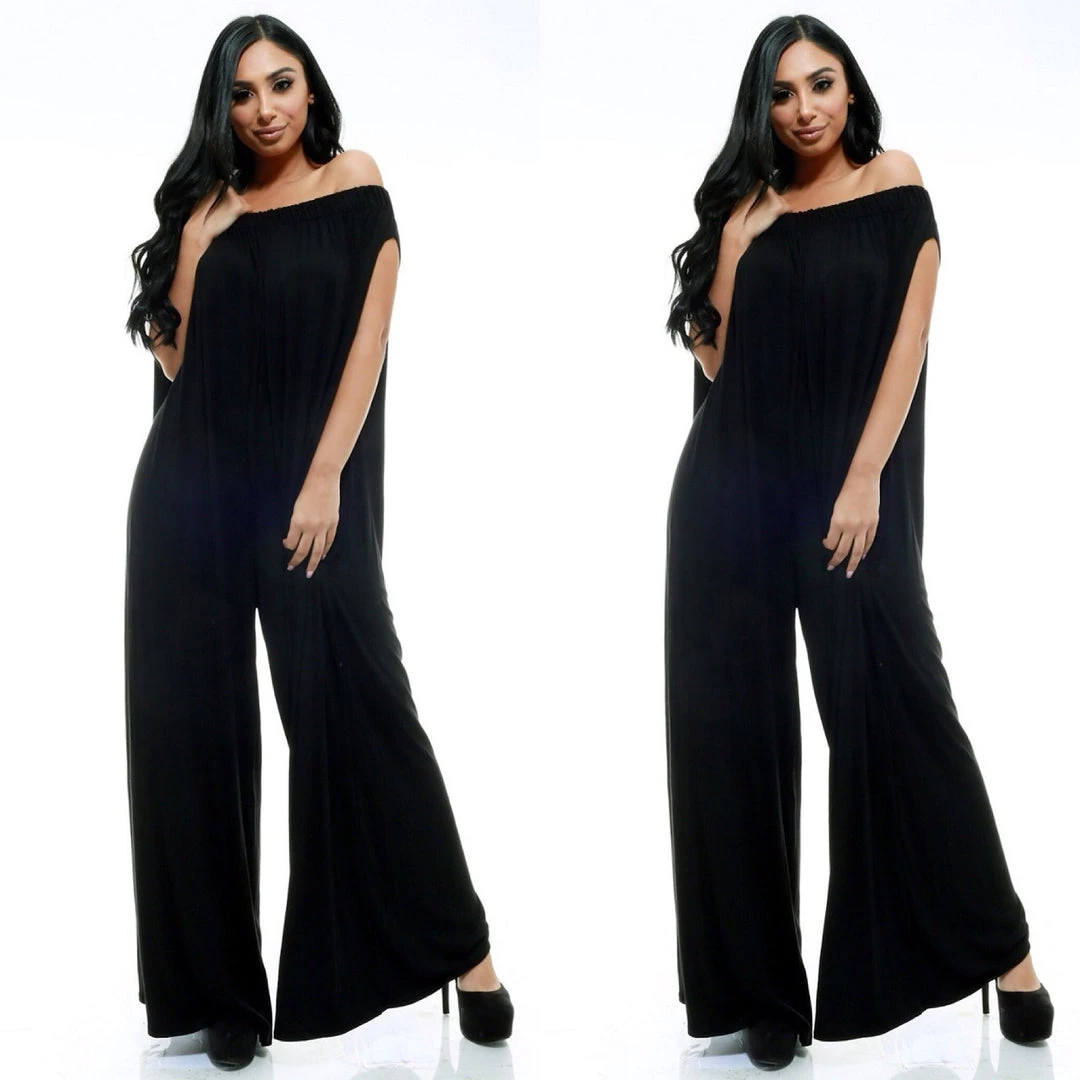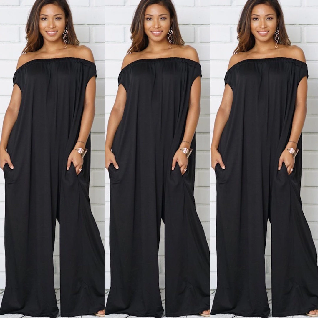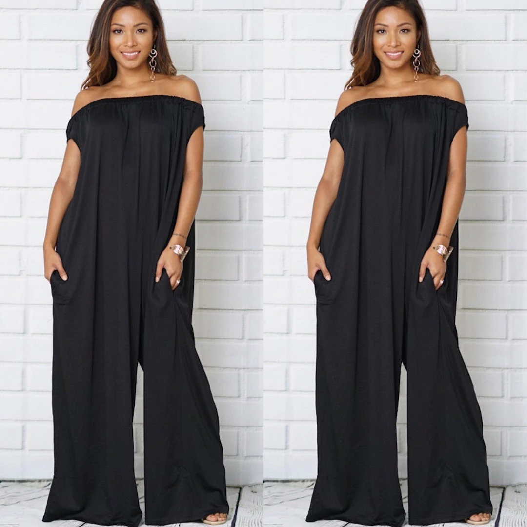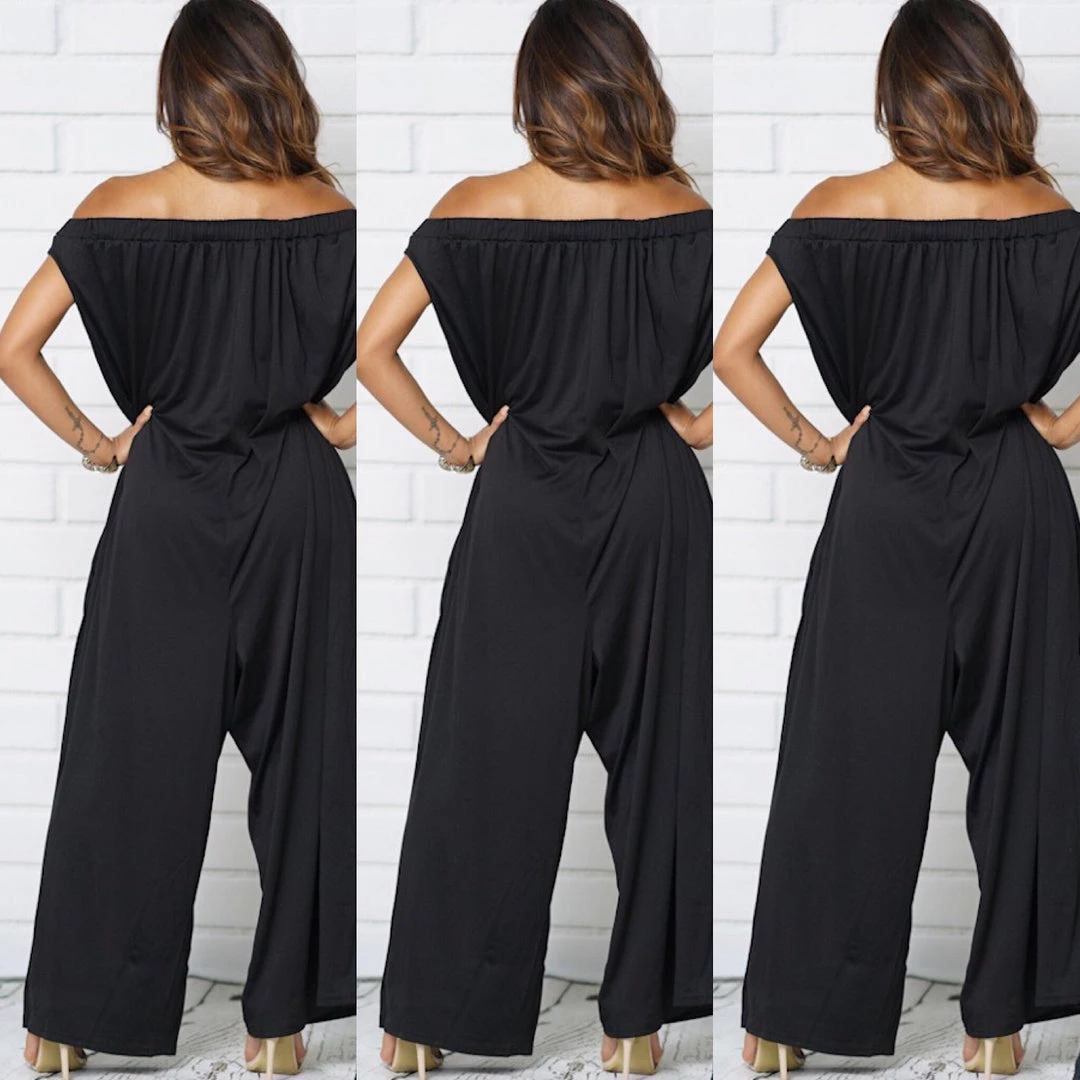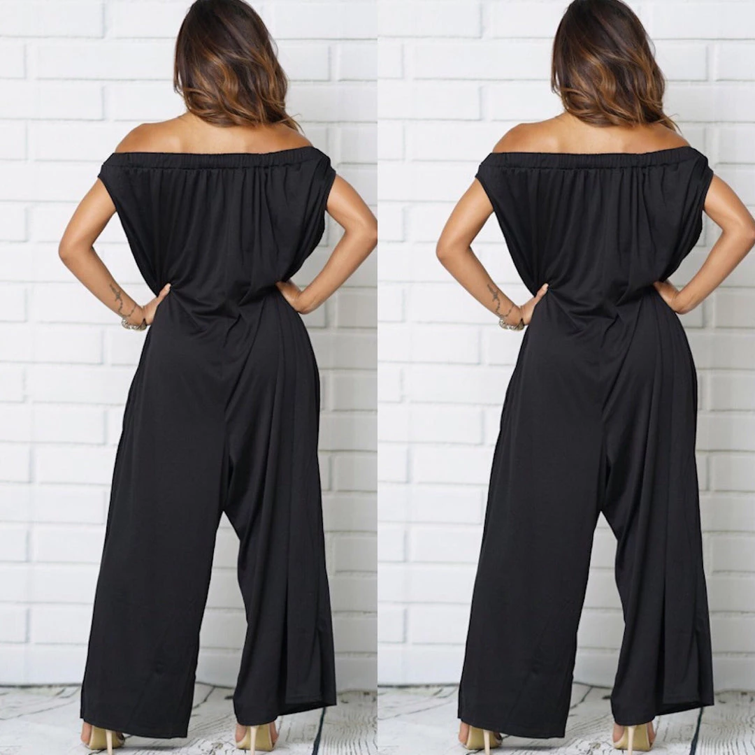 Add a little sexy attitude to your favorite new look. Try this black off the shoulder jumpsuit. Just buy, try and you will love testing out this fabulous look. Fabric is rayon, polyester and spandex with stretch and flow that wears, looks and feels like perfect weight cotton. Add a belt for a little flirty fun or to cinch in the waist more. Body of the jumpsuit is boho loose fit and style. Very cool and comfy yet stylish and chic. Measures 48 inches long top to bottom with a 24 inch inseam.