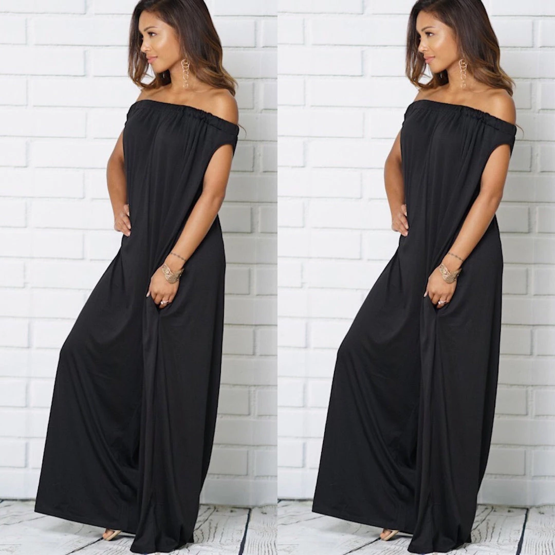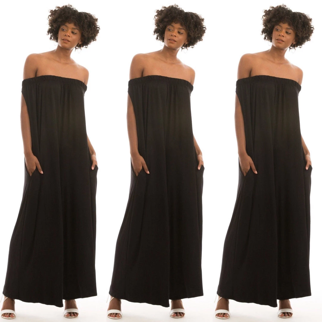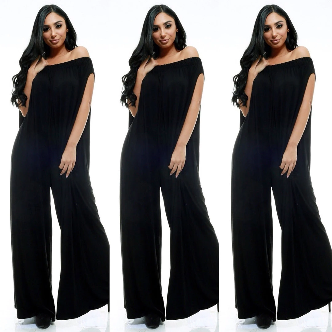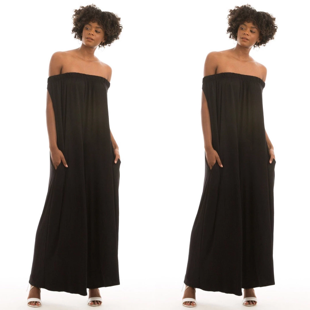 Add a little sexy attitude to your favorite new look. Try this black off the shoulder jumpsuit. Just buy, try and you will love testing out this fabulous look. Fabric is rayon, polyester and spandex with stretch and flow that wears, looks and feels like perfect weight cotton. Add a belt for a little flirty fun or to cinch in the waist more. Body of the jumpsuit is boho loose fit and style. Very cool and comfy yet stylish and chic. Measures 48 inches long top to bottom with a 24 inch inseam.