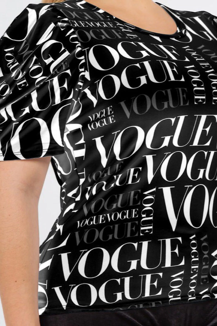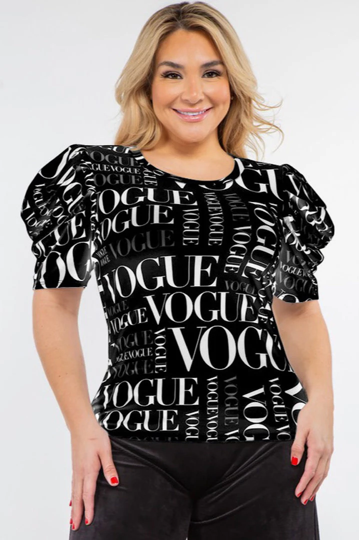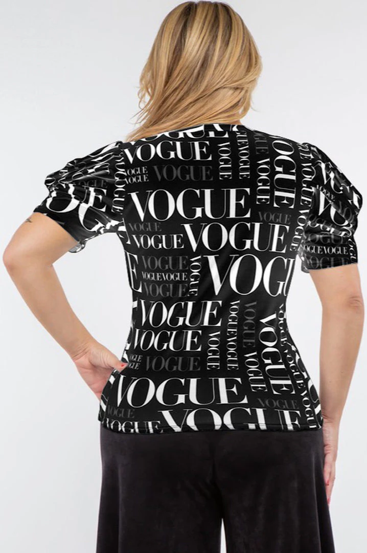Black White Vogue Print Lightweight Fitted Puffy Sleeve Top