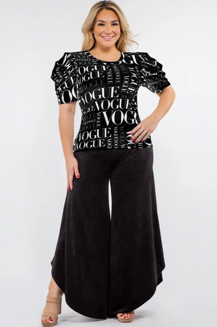 Black white Vogue print top only. Tops and pants sold separately. Your closet should always have pieces you can wear with anything and look great; and there is no better example of that than this fitted puffy sleeve top. Top is very fitted in the bodice and the sleeves are slightly puffed with ruching detailing. We recommend going up one size if you are top heavy and carry more weight in your bust and stomach and if you don’t like too fitted. This top is designed to be fitted. Shirt is short waist so it looks best with high waisted pants or skirts. Fabric has a lot of spandex and stretch. Material is polyester and spandex blend and feels like a cotton tee with stretch. Model has on size xlarge with her bust measurements at 42D and waist measurements at 38 inches. Xlarge is 14/16. Made in the USA. Model is 5 feet 8 inches tall. Ships from Houston, Texas by Social Butterfly Collection.