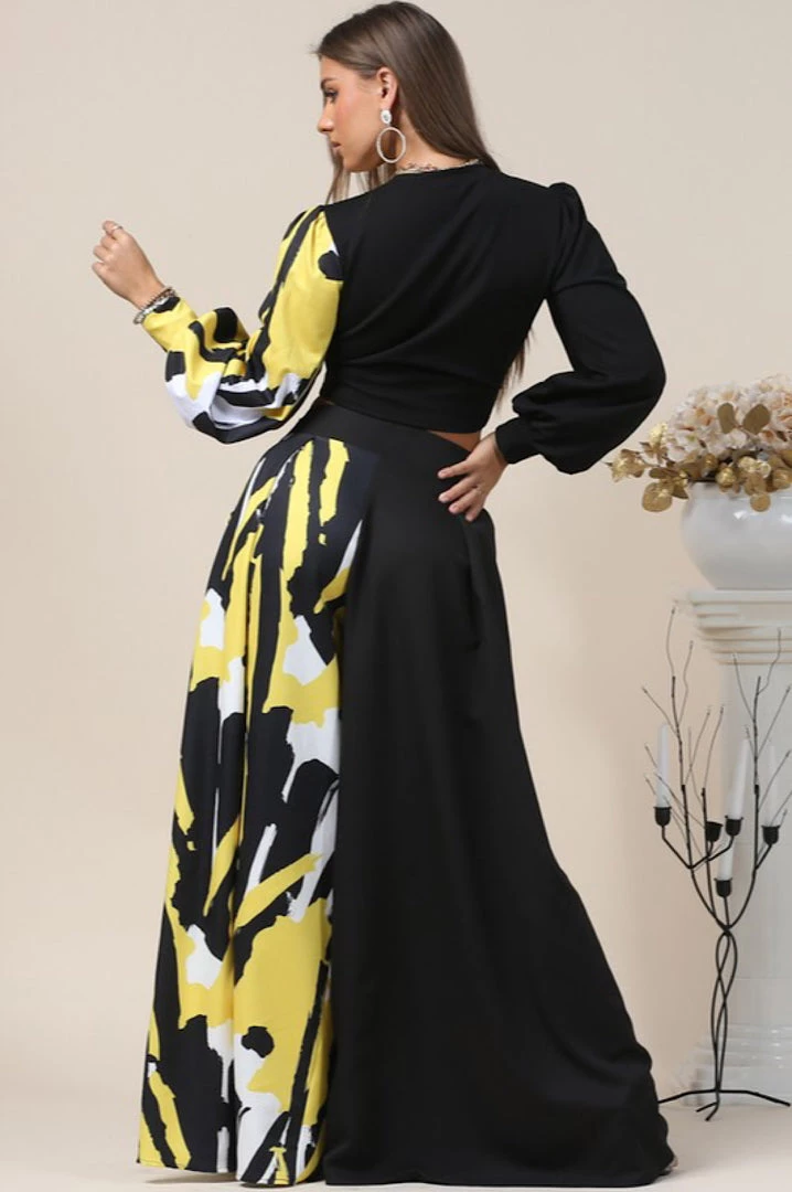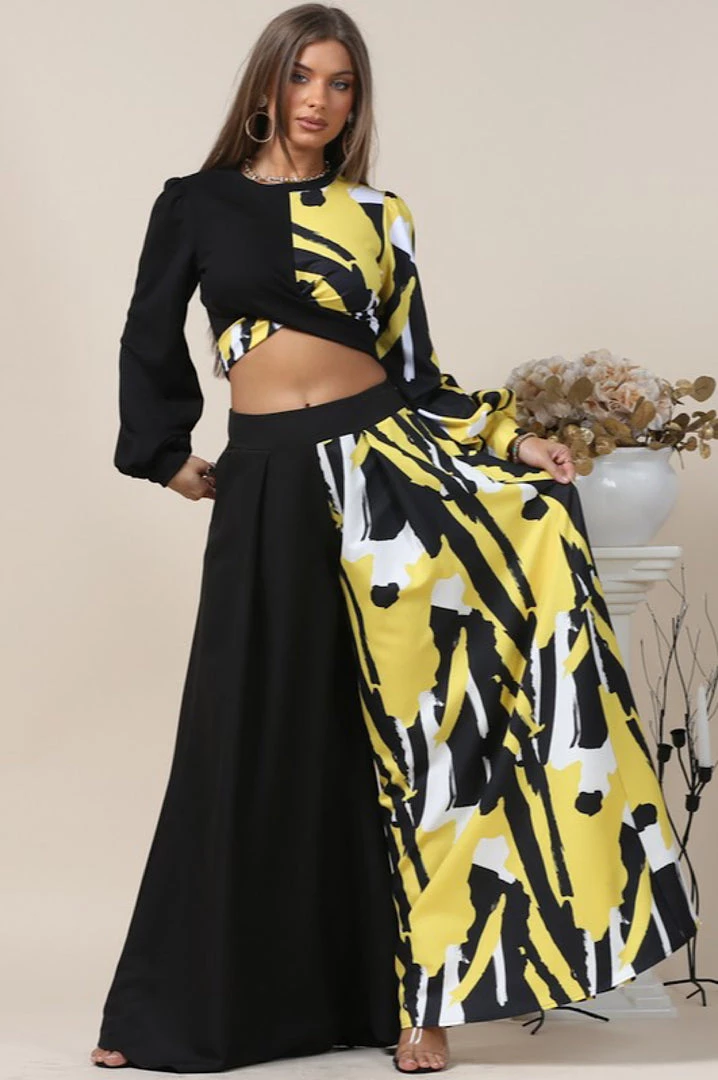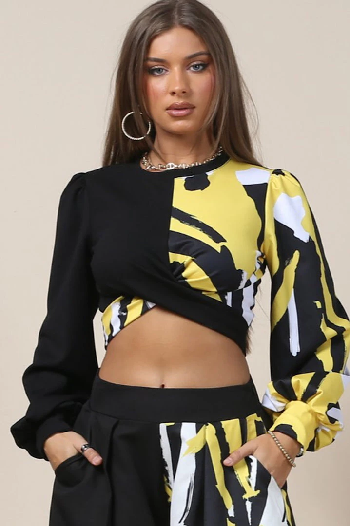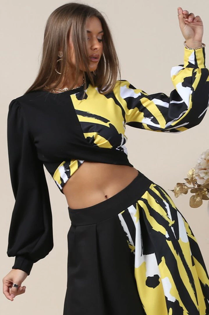 Top Only. Pants and tops sold separately. Currently, we do not offer the color block pants that are black one leg and print one leg. We only offer the full print pants at this time. Cropped in solid black on on side and black, white and yellow abstract print on other side. Very chic and fashion forward. Top runs true to size but is designed to fit cropped and short. Fabric is polyester and spandex blend with some stretch to it. Sleeves are long but you can push them up to the elbows if you like. Very edgy yet comfortable to wear. Made in the USA. Ships from Houston, Texas by Social Butterfly Collection.