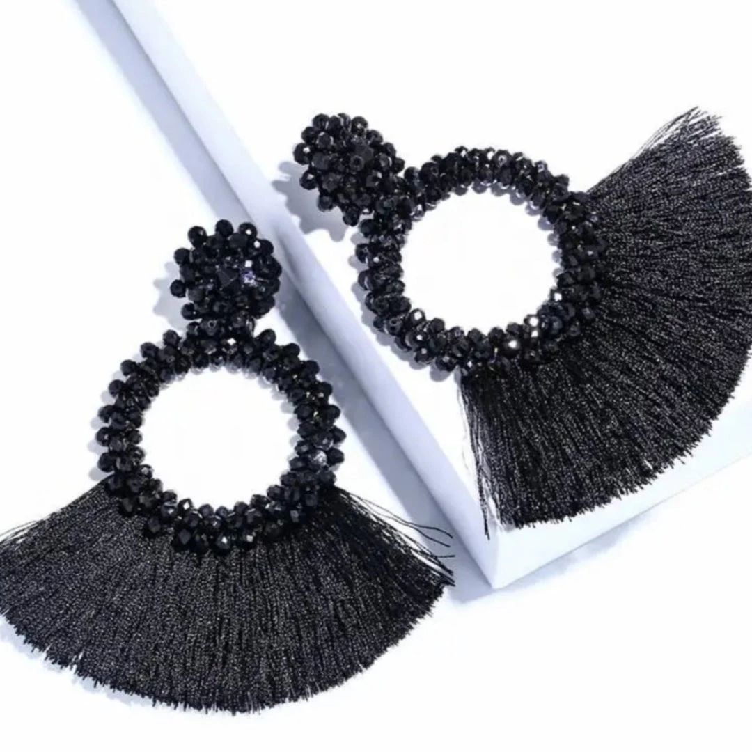 Social Butterfly Collection Black Woven Bead Detail Fan Earrings Accessories