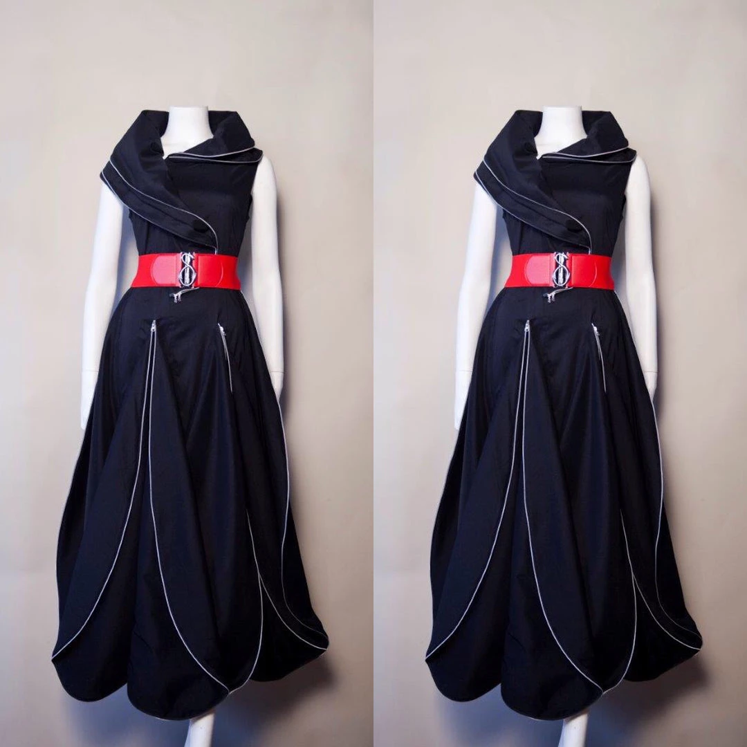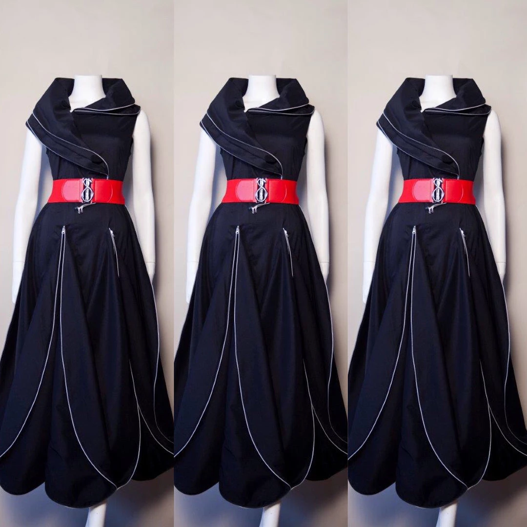 A great wardrobe addition for a variety of occasions, this front zipper detail dress has multiple zippers and has a fancy collar that is absolutely over the top beautiful. Fabric is water resistant rich dupioni with excellent stretch and spandex. Dress fits true to size and is of great quality for timeless long lasting wear. This dress is beyond trendy but is a classy always in style classic ready to wear. Easy fit and great spandex for stretch. Fabric is grey for year round wear and material does have some stretch. Size 14-16 equals XL and will fit up bust of 42 inches and waist of 38 inches. Bottom of the dress is very generous and loose fitting. Red belt does not come with the dress. Belt is sold separately on the website. Ships from Houston, Texas by Social Butterfly Collection.