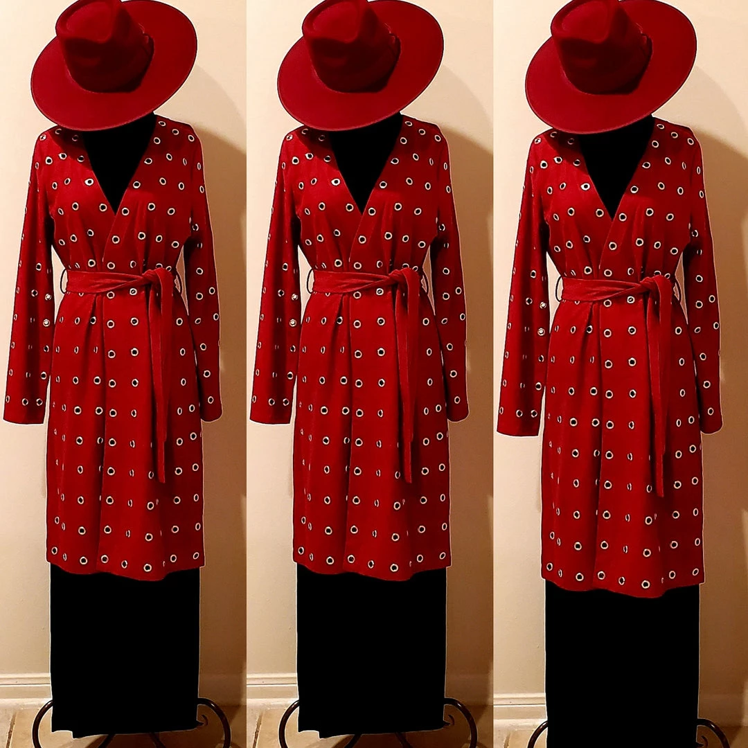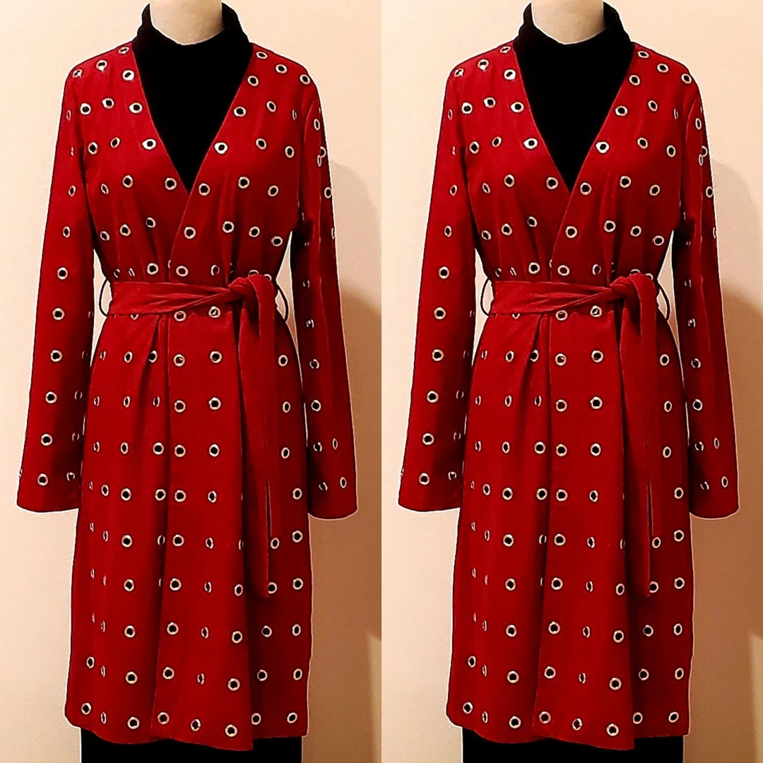 The ultimate go to jacket for warmth and fashion. Faux suede jacket with silver circle details. Jacket looks great open or closed which will give you two different looks. Jacket has matching waist tie belt for closure at the waist. Very chic and fashion forward. Jacket is super soft and material looks and feels like suede. Length of jacket give full coverage on the backside. True fit with slight stretch or give. Ships from Houston,Texas by Social Butterfly Collection.