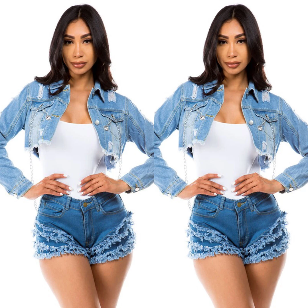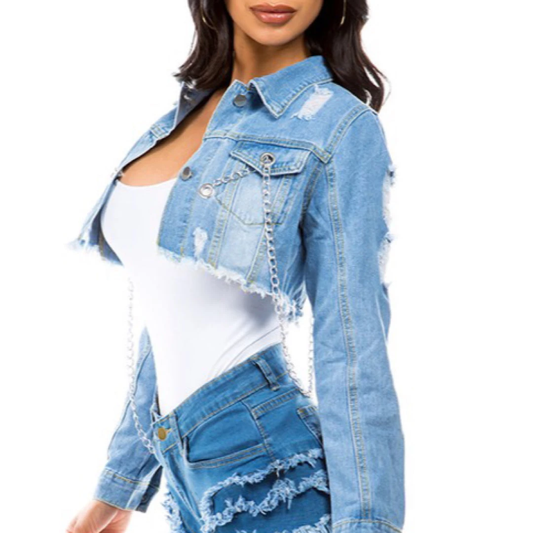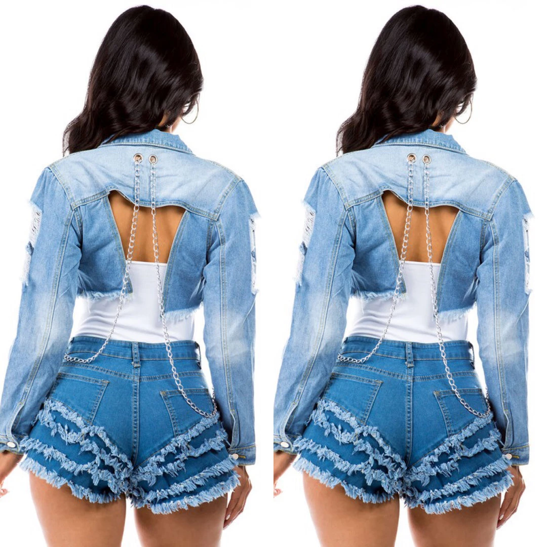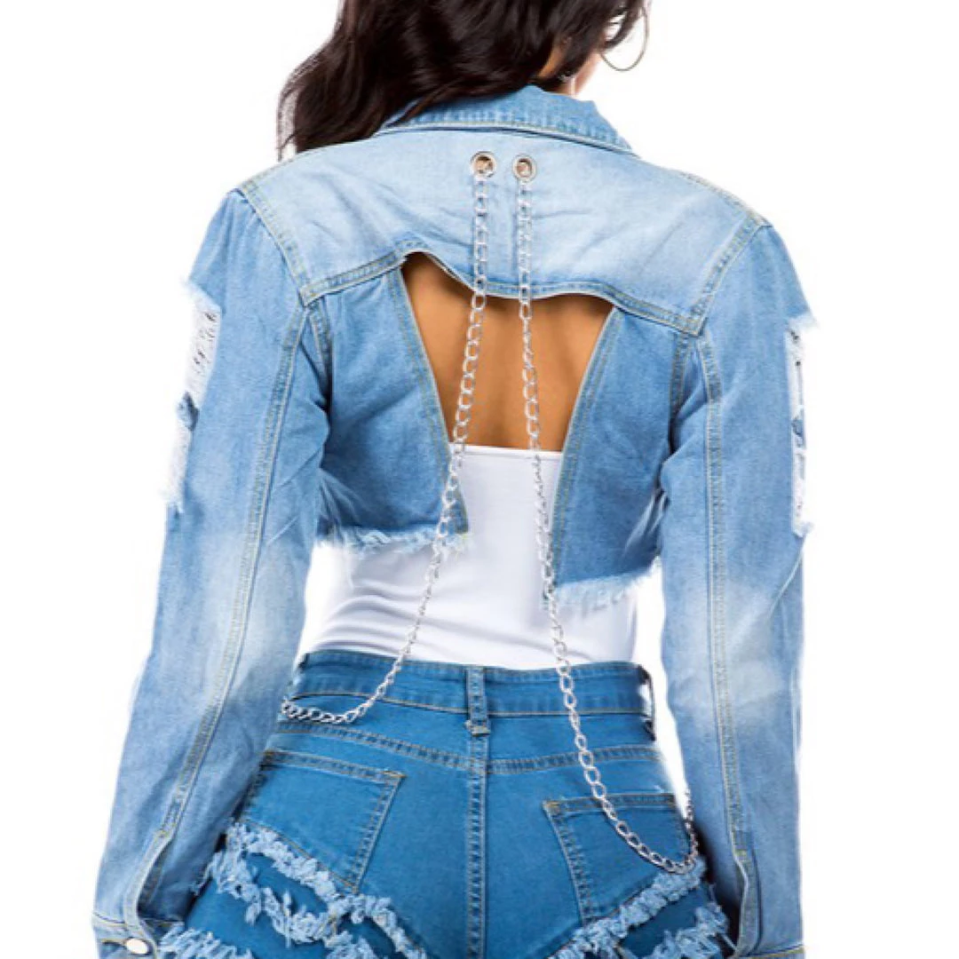 Jacket only. Denim jacket with silver chain detailing. Cropped jacket with back cut outs and distressed detailing. Very chic and fashion forward. Jacket runs true to size. Silver chain detail front to back with cut out back. Fabric has very little spandex for stretch and blended with premium heavy weight cotton denim but much softer and easy to wear. Very edgy yet comfortable to wear. Ships from Houston, Texas by Social Butterfly Collection.