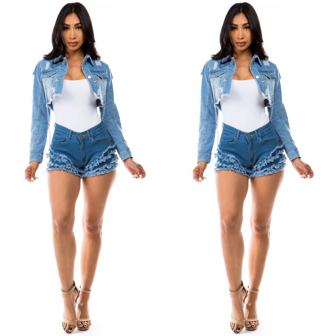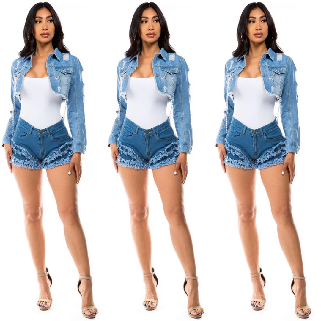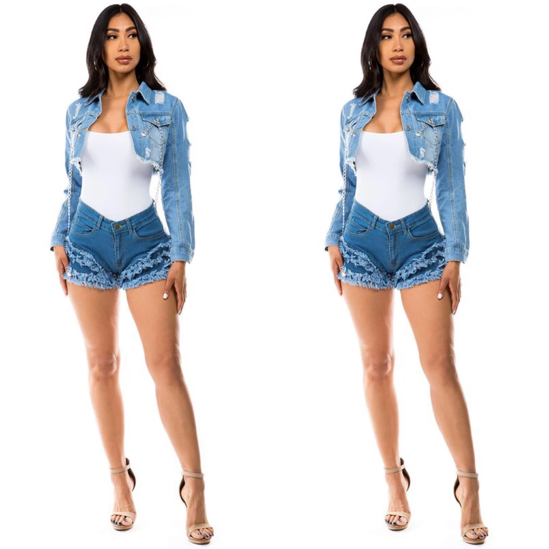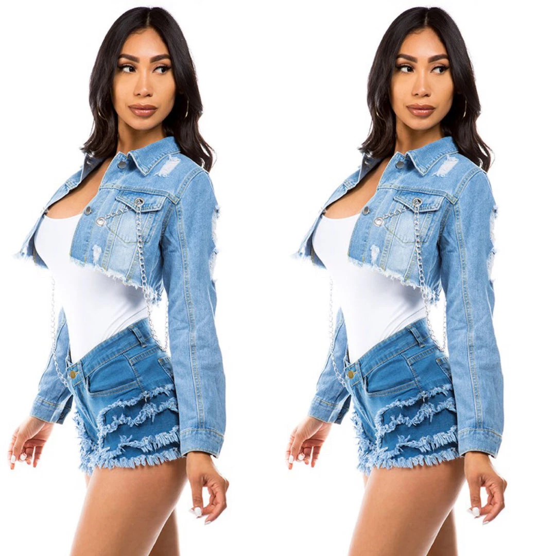 Jacket only. Denim jacket with silver chain detailing. Cropped jacket with back cut outs and distressed detailing. Very chic and fashion forward. Jacket runs true to size. Silver chain detail front to back with cut out back. Fabric has very little spandex for stretch and blended with premium heavy weight cotton denim but much softer and easy to wear. Very edgy yet comfortable to wear. Ships from Houston, Texas by Social Butterfly Collection.