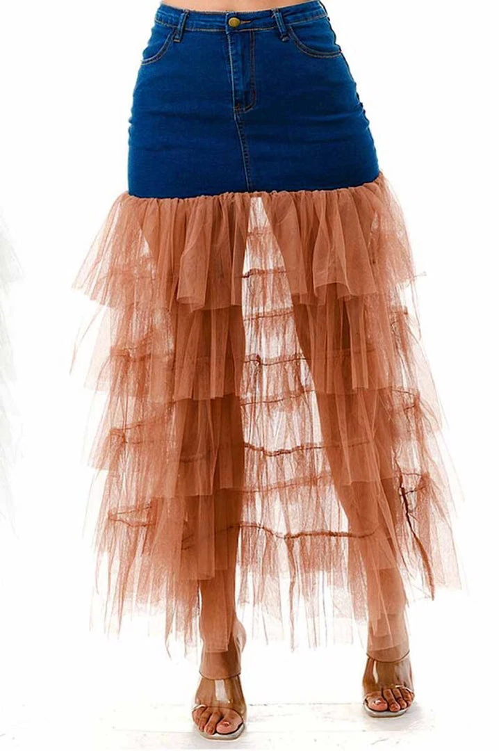 Tulle isn’t just for wedding dresses anymore; this gorgeous layered maxi denim tulle skirt is a must have for your Special events and celebrations this year. This groovey look pairs with any top or shoes you choose, and tulle adds that bit of whimsy to help you dress it up no matter what. Waistline has elastic with lots of stretch for comfort button zipper closure. Denim cotton fabric with spandex for stretch. Ships from Houston, Texas by Social Butterfly Collection.