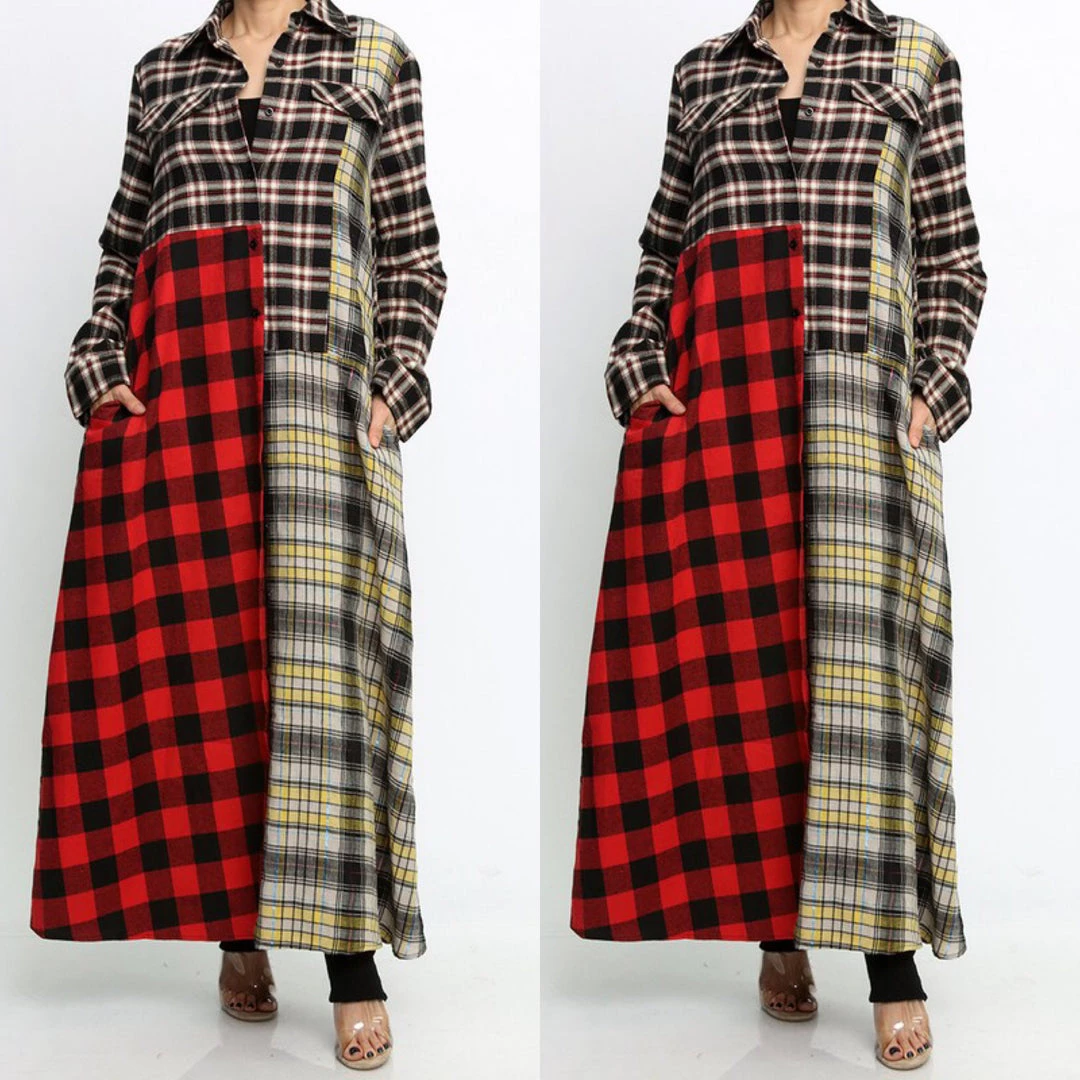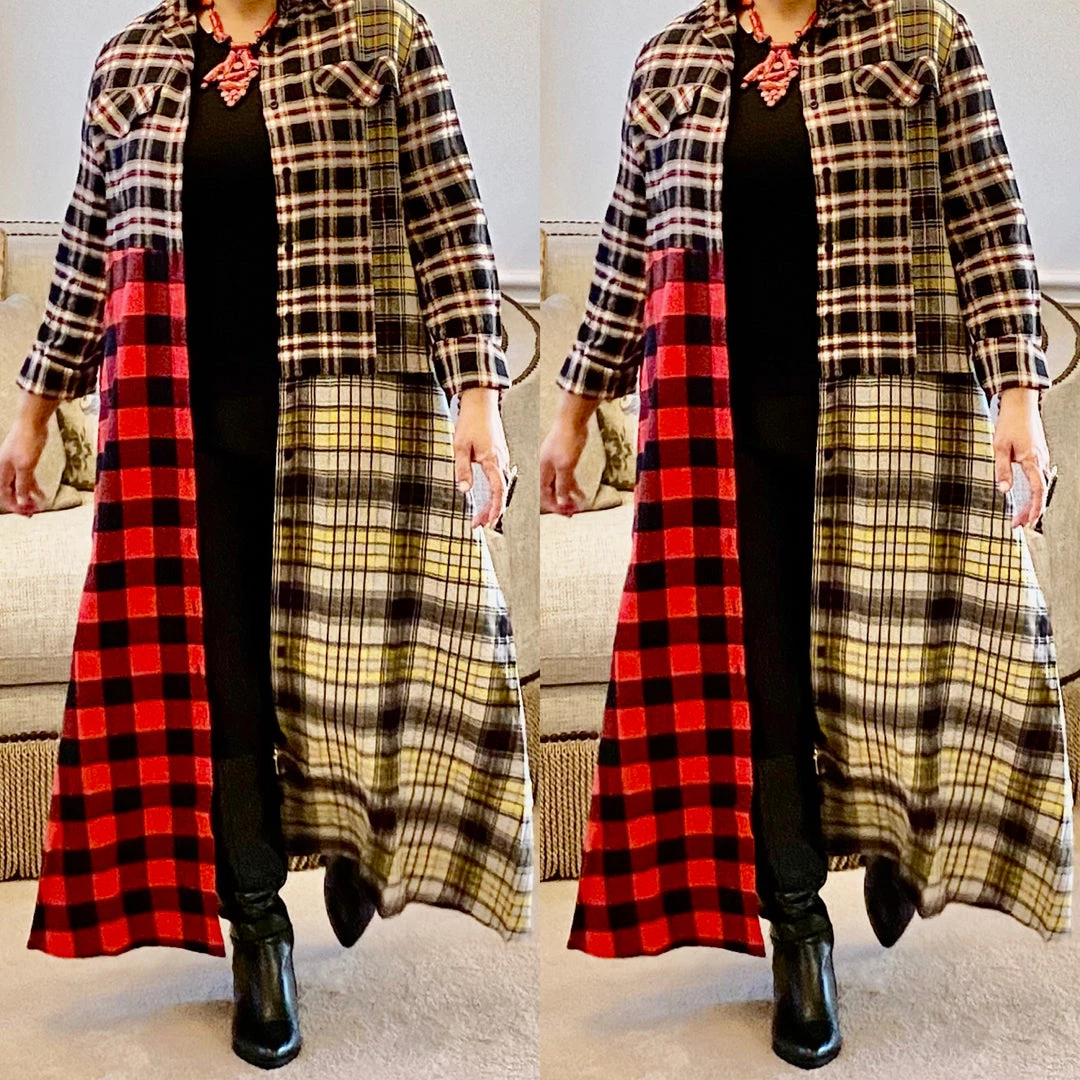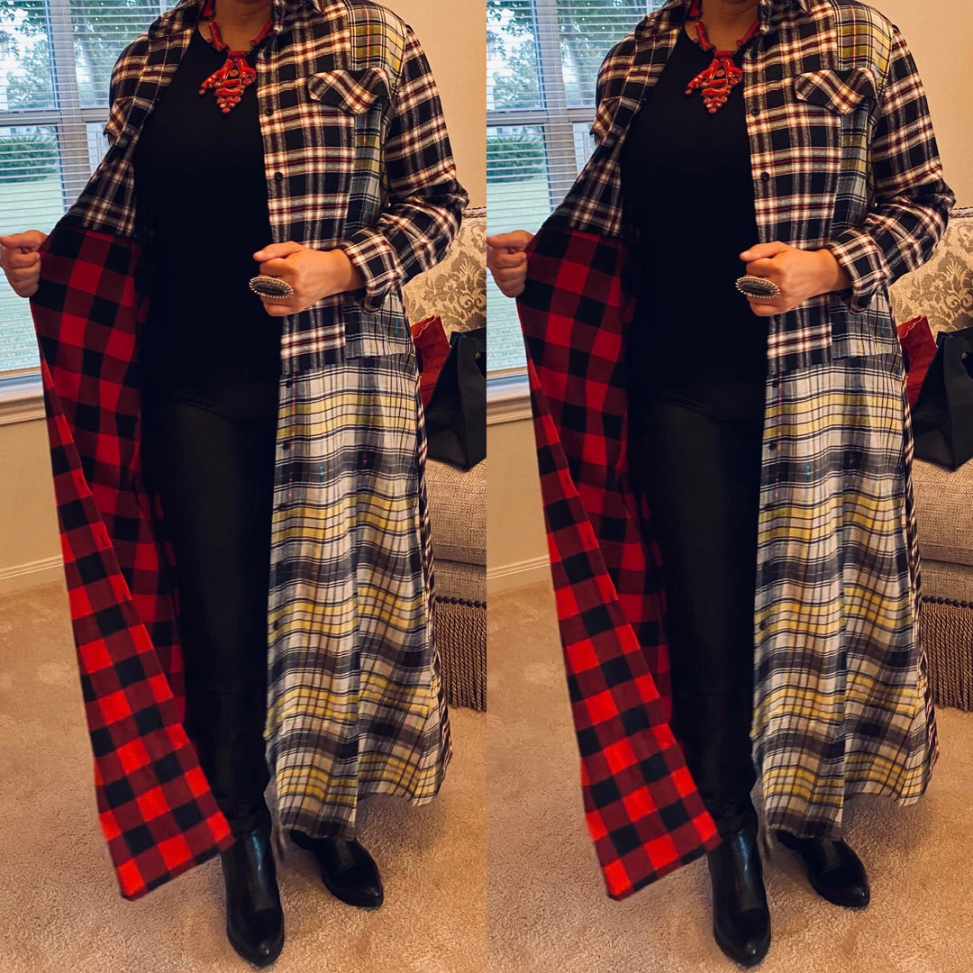 Check plaid pattern long sleeve duster dress. Fabric is heavy weight cotton and flow a bit when you walk. You will love this one for it’s whimsical style and look. Wear as a button down shirt dress or wear as an open duster with jeans, slacks or leggings. Runs true to size with a loose fit. Front buttons and long sleeves that you can wear rolled up to the elbows or button down around the wrist. Ships from Houston Texas by Social Butterfly Collection.