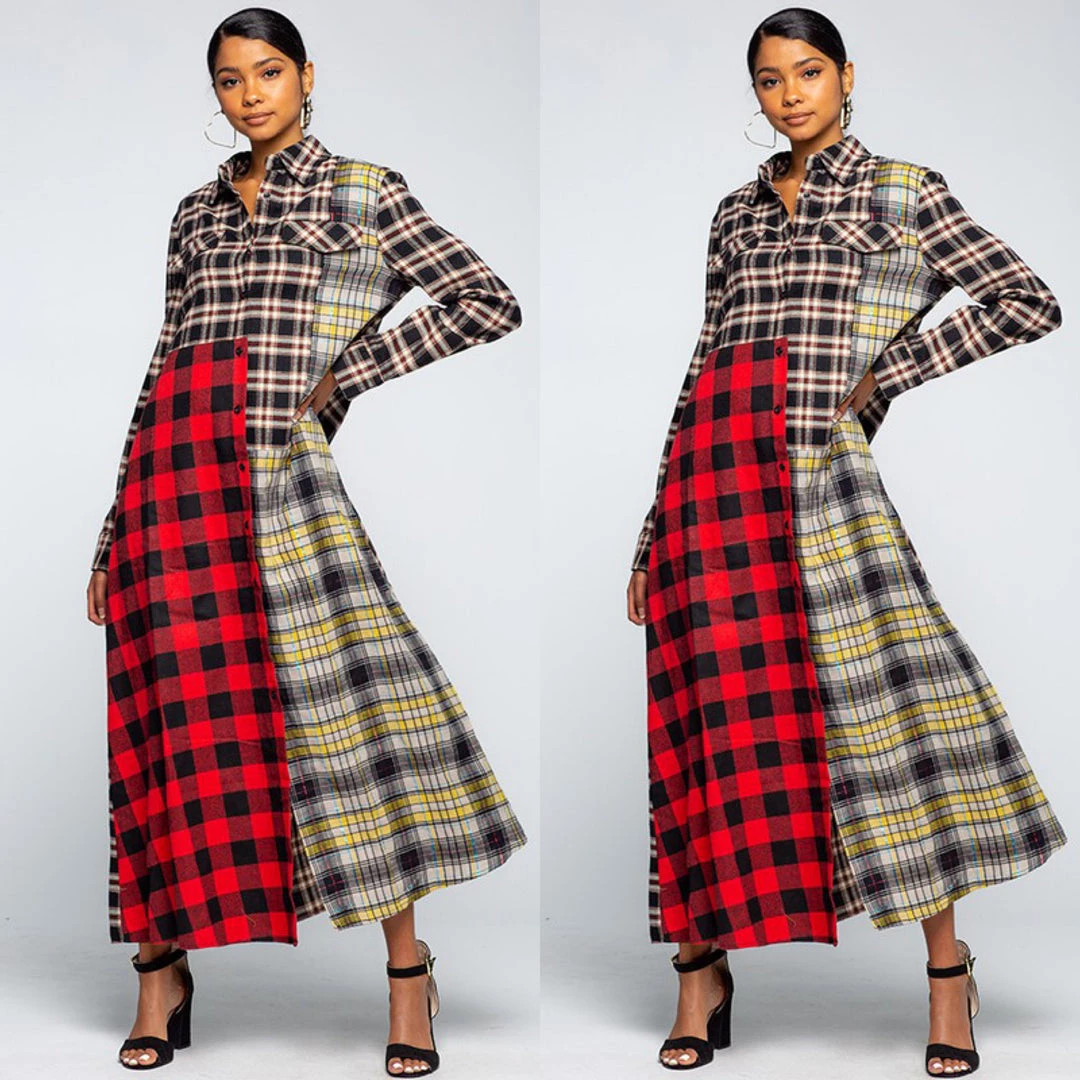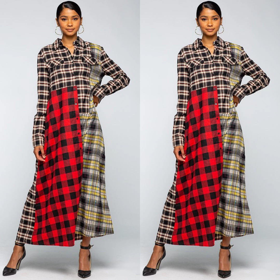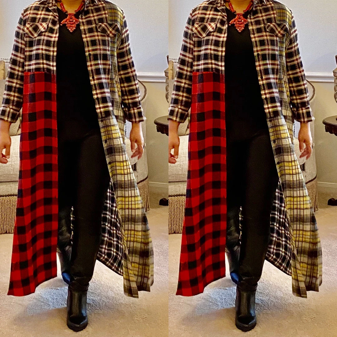 Check plaid pattern long sleeve duster dress. Fabric is heavy weight cotton and flow a bit when you walk. You will love this one for it’s whimsical style and look. Wear as a button down shirt dress or wear as an open duster with jeans, slacks or leggings. Runs true to size with a loose fit. Front buttons and long sleeves that you can wear rolled up to the elbows or button down around the wrist. Ships from Houston Texas by Social Butterfly Collection.