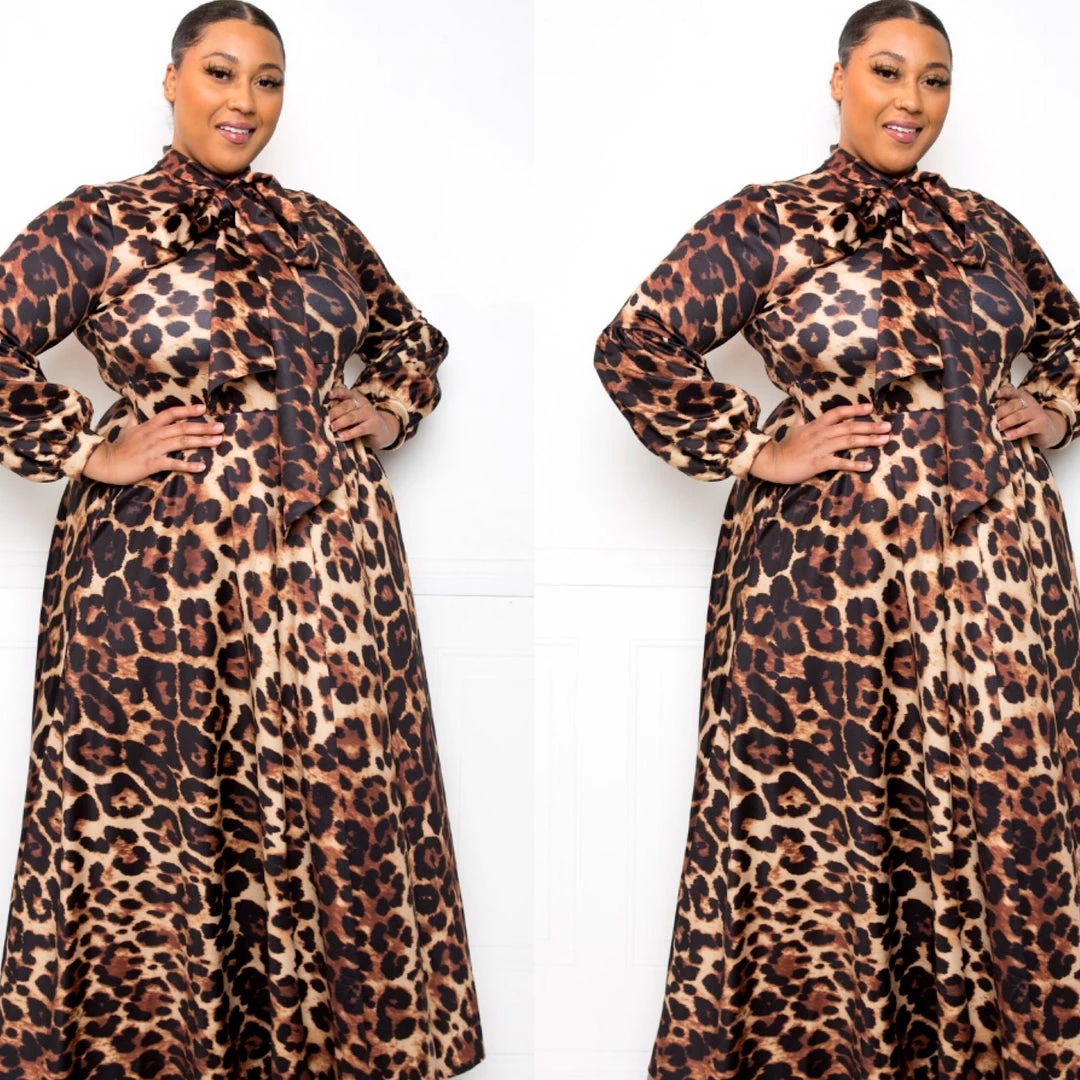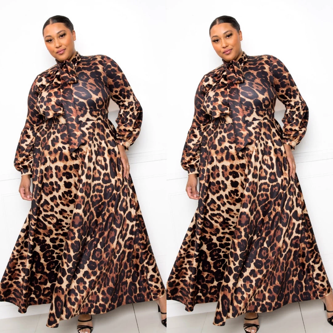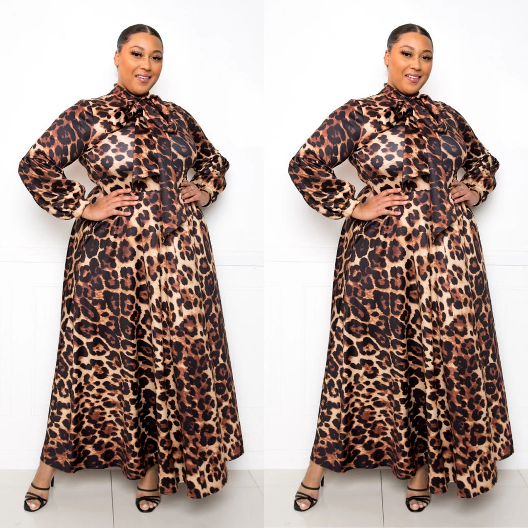 Leopard Animal Print Plus Size Necktie Maxi Dress