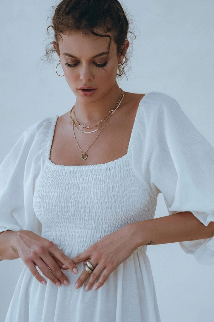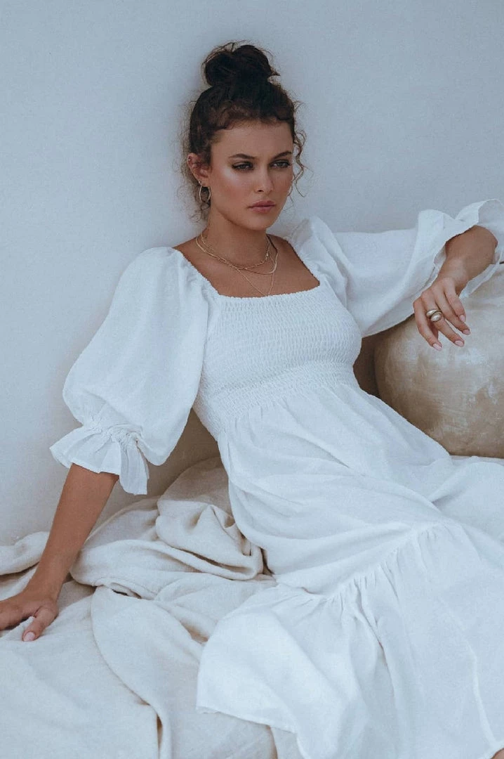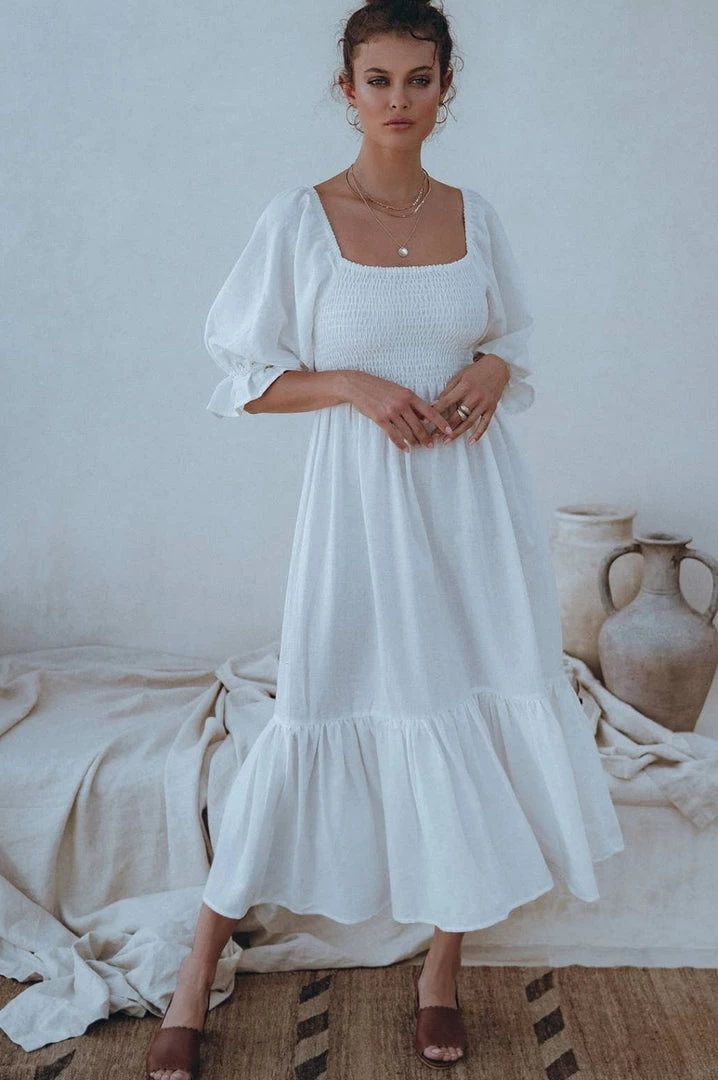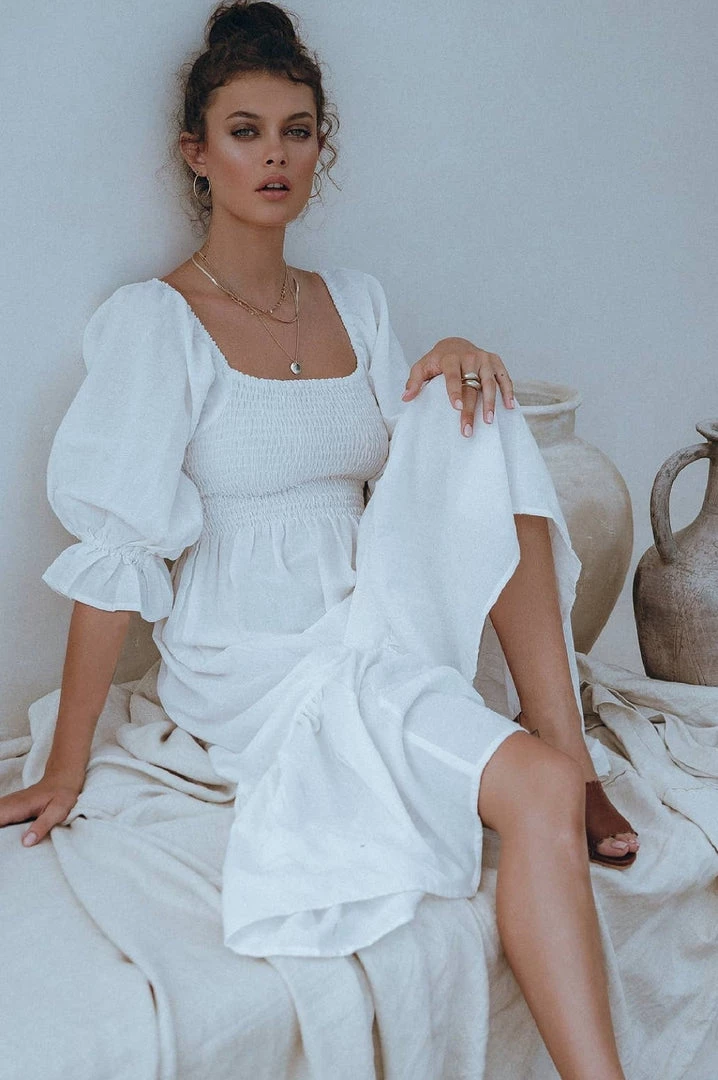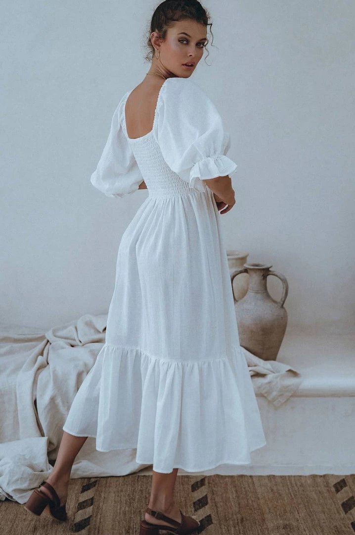 Linen Dress. More sizes arriving soon. Handcrafted from high quality 100% organic linen into a beautiful fashion that will become the go to piece in your wardrobe. Hand wash cold water. Oversized relaxed fit. Unlined and fits true to size. Smocked bodice and puffed sleeves and mid length hemline goes well below the knees. Ships from Houston, Texas by Social Butterfly Collection.