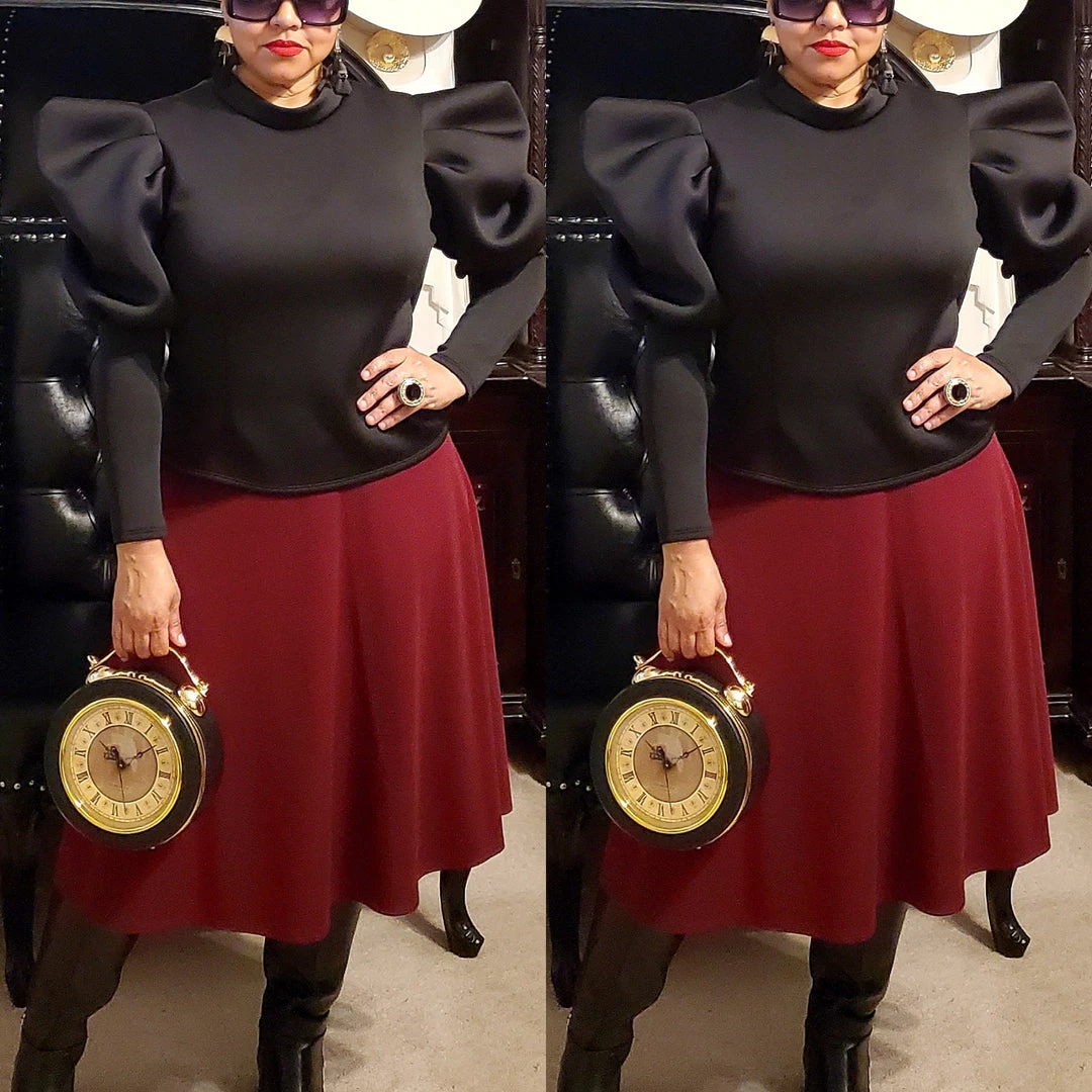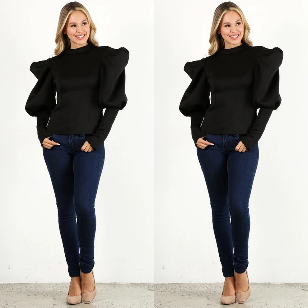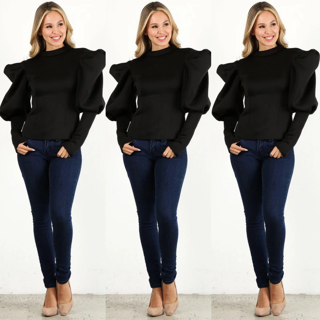 Your closet should always have pieces you can wear with anything and look great; and there is no better example of that than this fitted puffy sleeve top. Top is very fitted in the bodice and lower arms. We recommend going up one size if you are top heavy and carry more weight in your bust and stomach. Shirt is short waist so it looks best with high waisted pants or skirt. Fabric has a lot of spandex and stretch. Material is polyester and spandex blend. Back of the top has full zipper with cute pearl detail. Lots of stretch for that perfect fit. Fabric is medium weight. Shirts sold separately. Ships from Houston, Texas by Social Butterfly Collection.