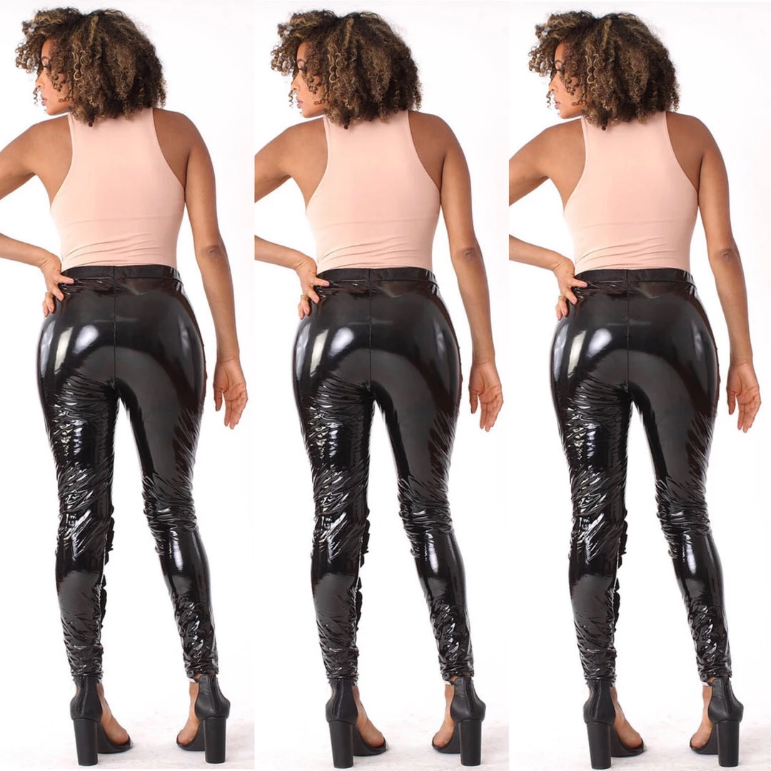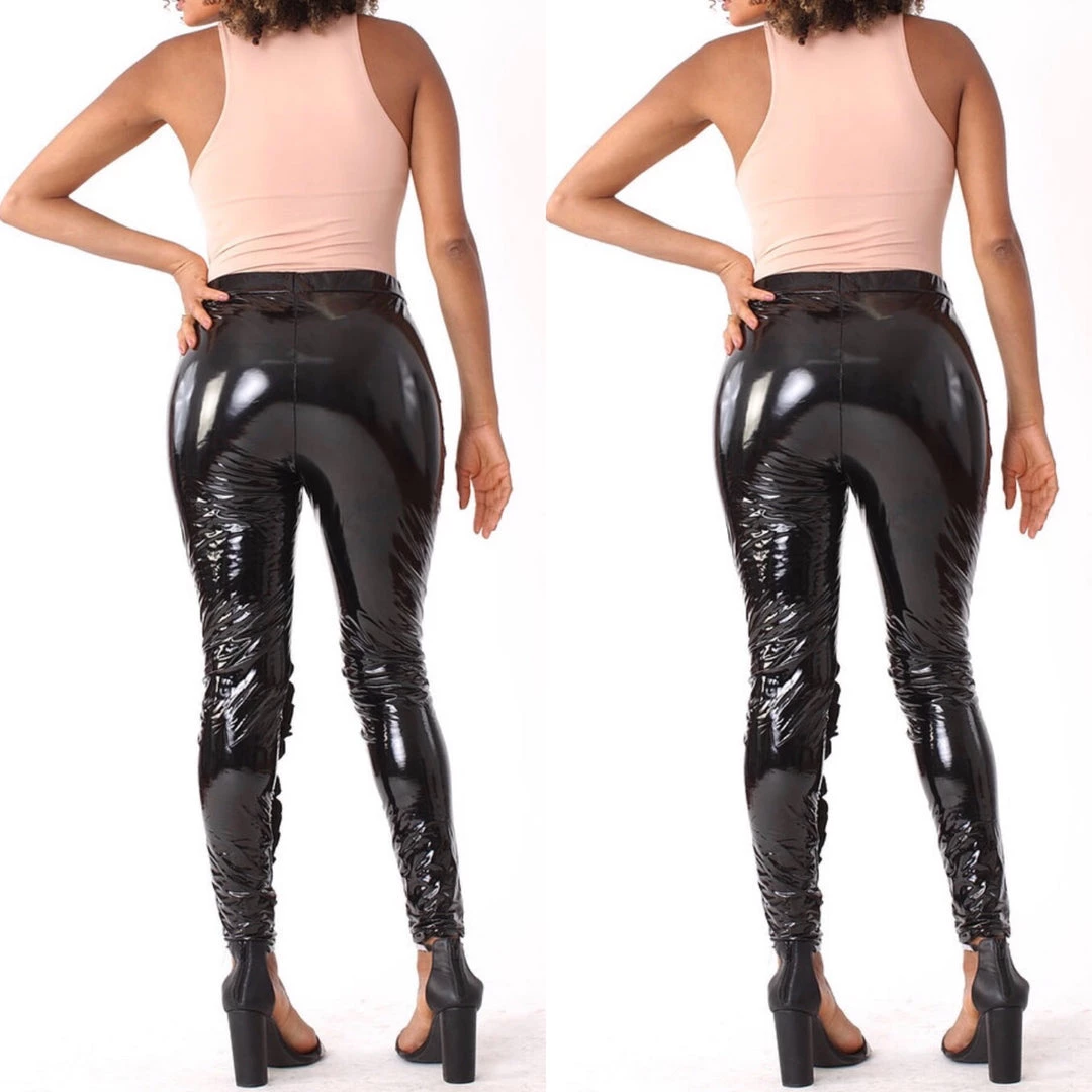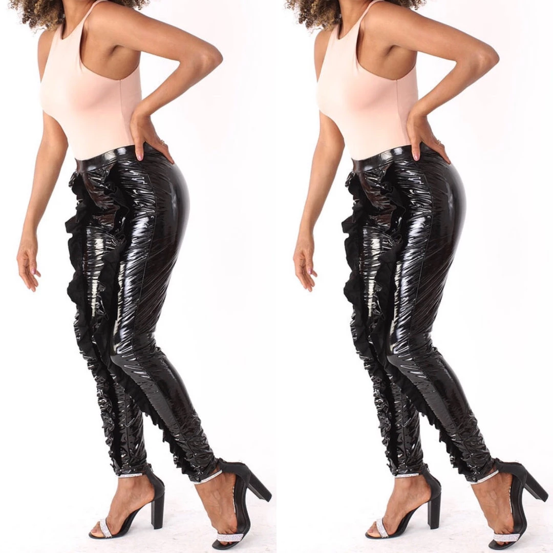 Liquid Faux leather legging pants with front ruffle detailing. Perfect pant legging for a night out with the ladies or your favorite concert. Fabric is super soft and stretchy fabric blend that you will love. True fit with plenty of stretch in the fabric and the waistband s elastic stretches and fit that covers your stomach and backside. Beautiful pant that is truly unique and fashion forward. The fit is true to sizing and the fabric does have spandex for stretch. I preferred the XL size 14-16 and my hips are 46 inches and my waist is 34 inches and XL size 14-16 was perfect fit and length. I am 5 feet 6 inches tall. The inseam measures 29 inches and pants are 40 inches long. Ships from Houston, Texas by Social Butterfly Collection.