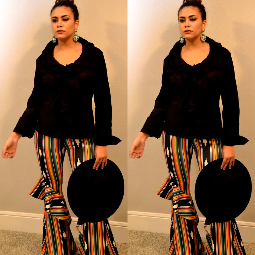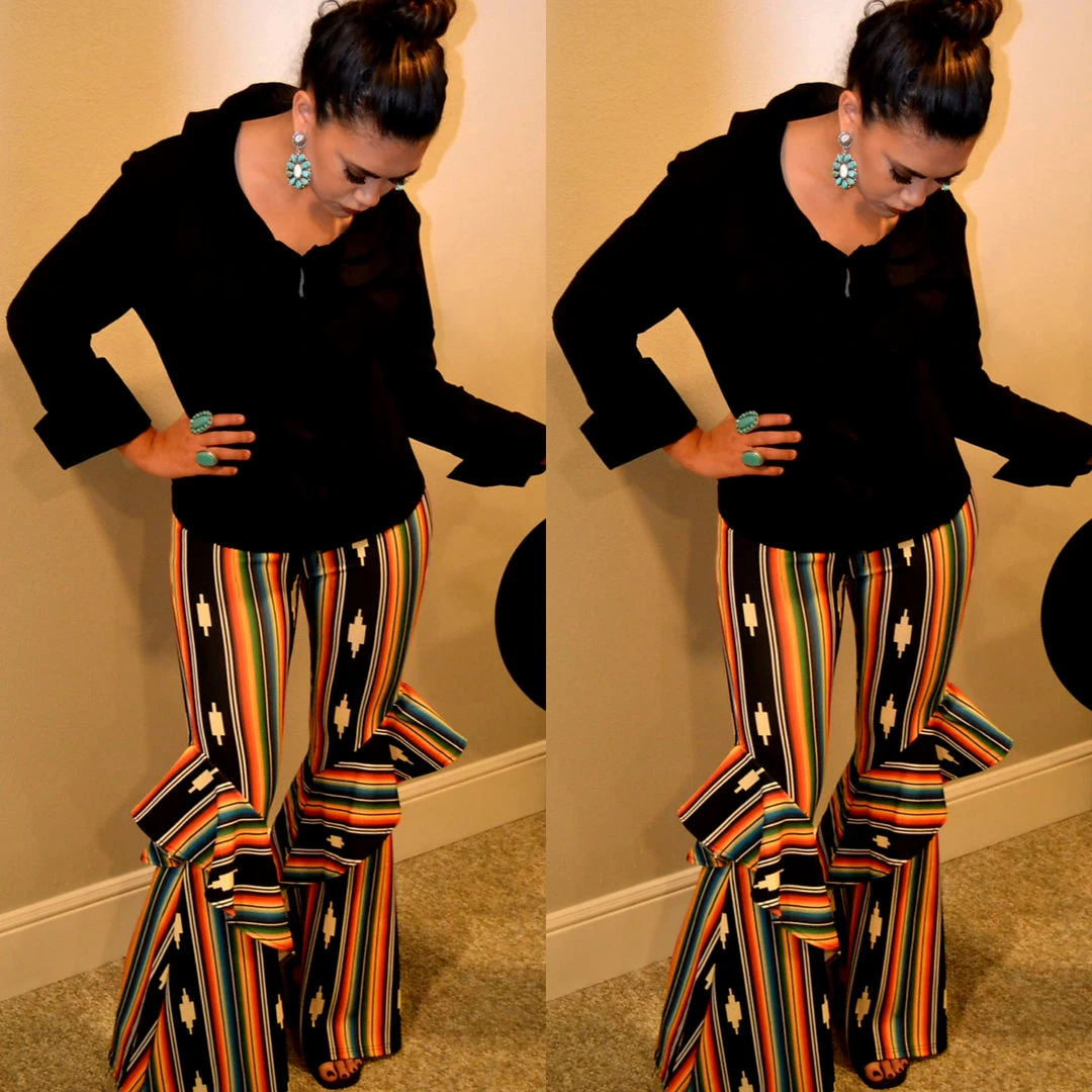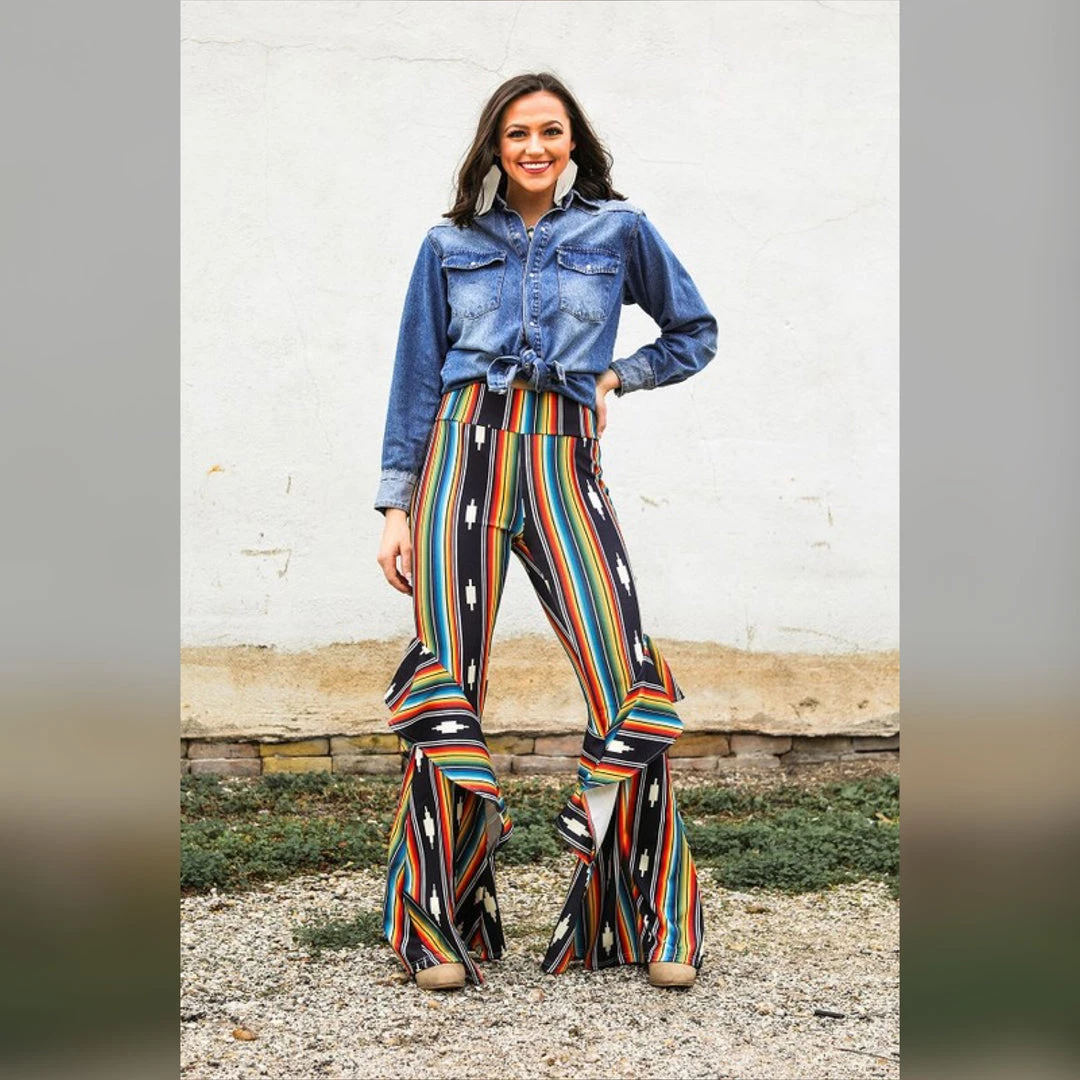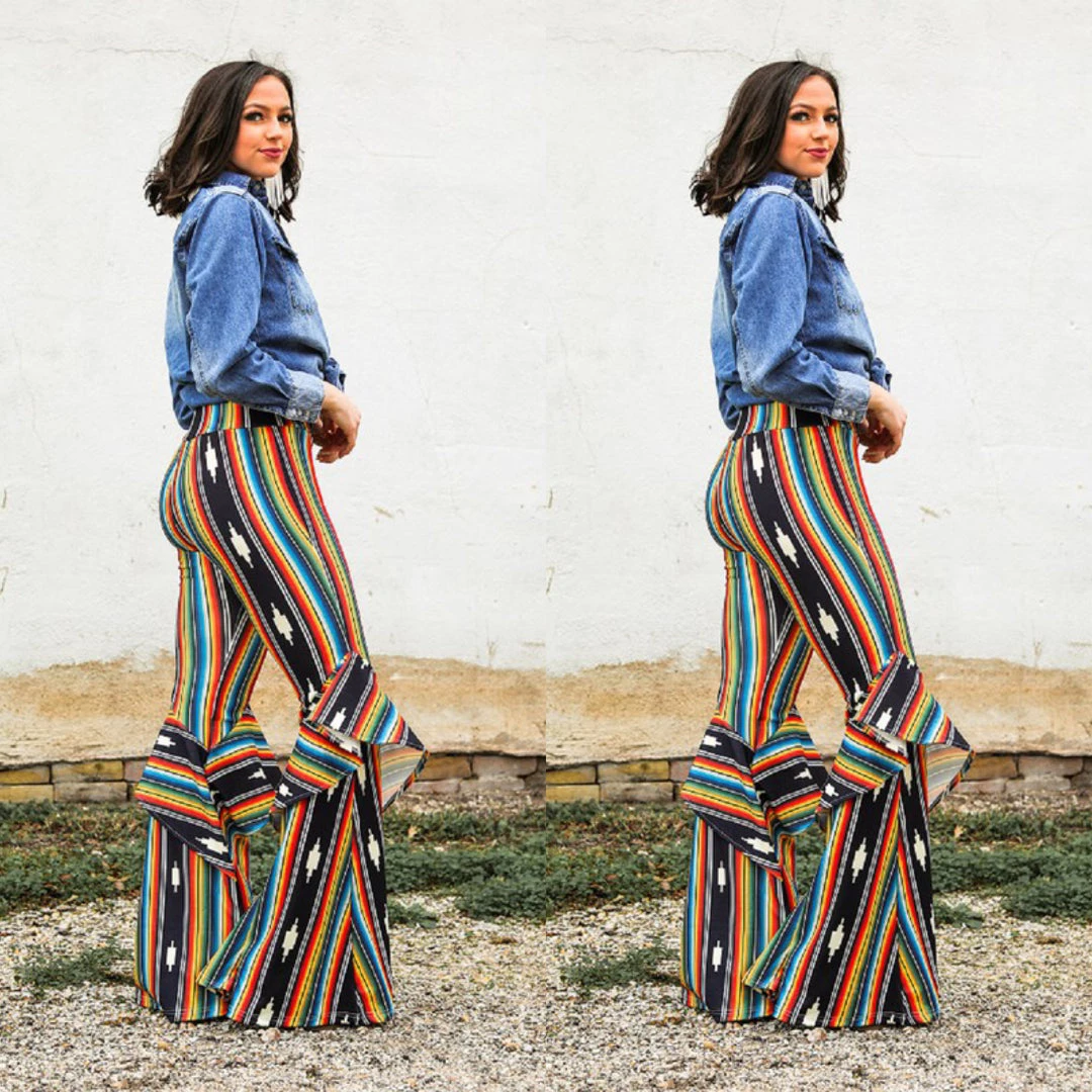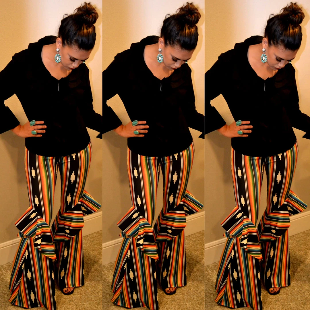 Long wide leg pants with full ruffle at the knee. Knee ruffle and flare pant leg in stretch material. Excellent fabric with awesome stretch. Polyester and spandex blend. Beautiful feel and look to this fabric. Length of pants 44 inches from top of waist to bottom of the pant leg. Inseam measures 33 inches. Waist has plenty of stretch to fit stomach area. These pants are fancy fun and perfect for parties or any special event. Ships from Houston, Texas by Social Butterfly Collection.