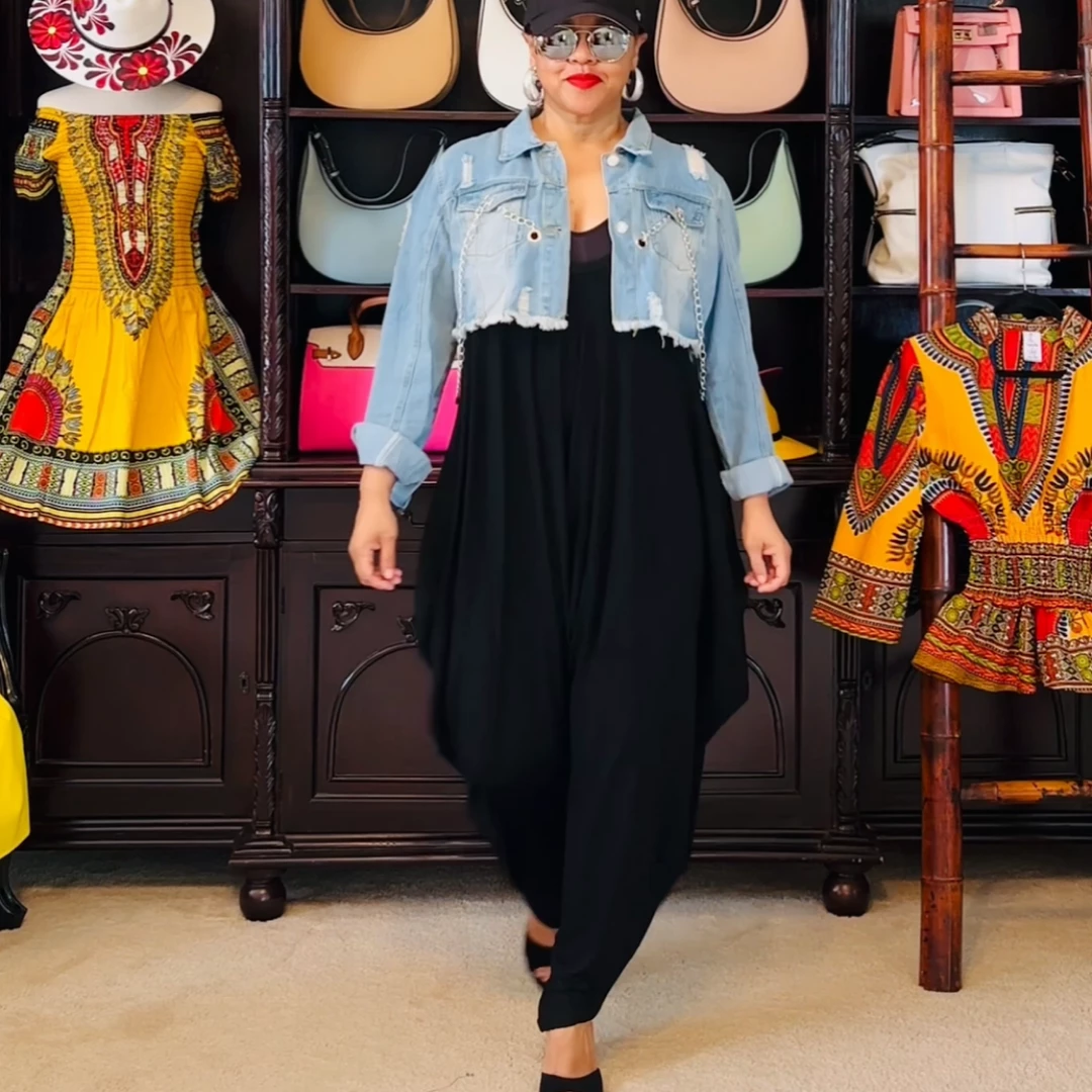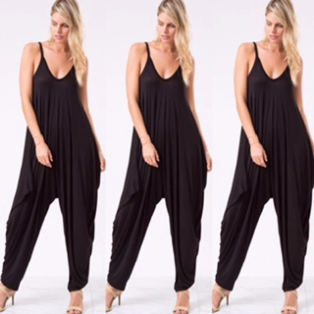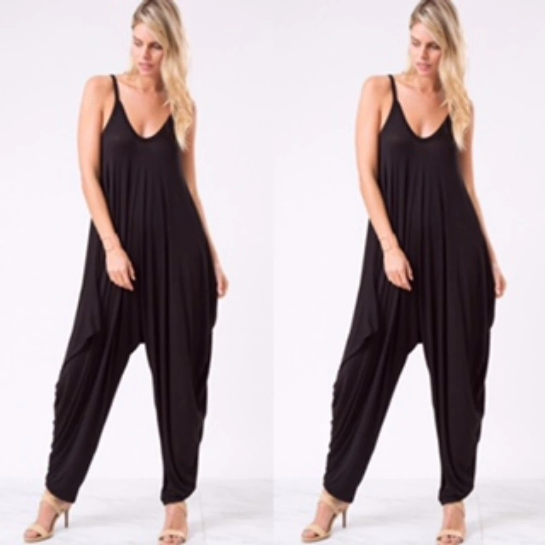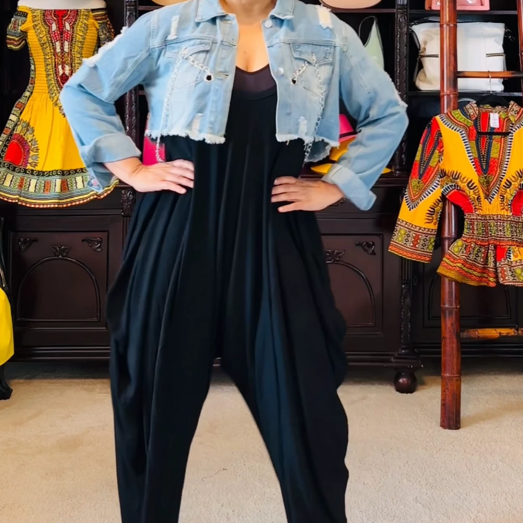 Black jumpsuit could go for a dressy casual look with heels and maybe add a jacket. Looks great also as a casual look with flats or sandals. Neckline also works well with a t-shirt or tank worn underneath to give yourself a layer of extra cleavage coverage or to cover your arms. Maybe wear a long duster or denim jacket with the jumpsuit for coverage of the arms. Fabric is a soft flowing cotton and jumpsuit is a loose fit. Spaghetti straps and round neckline. Scoop back line looks exactly the same as the front neckline. Ships form Houston Texas by Social Butterfly Collection.