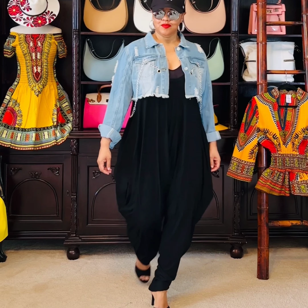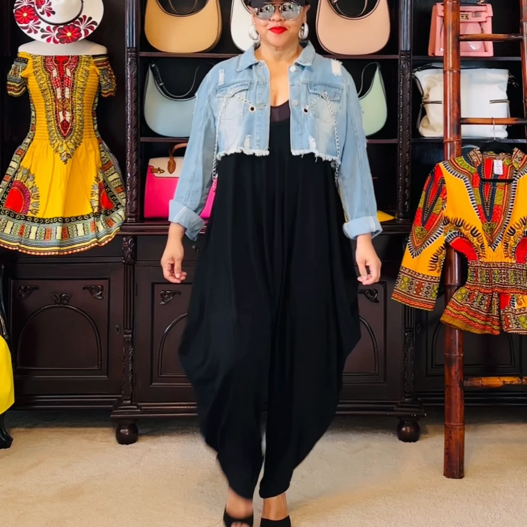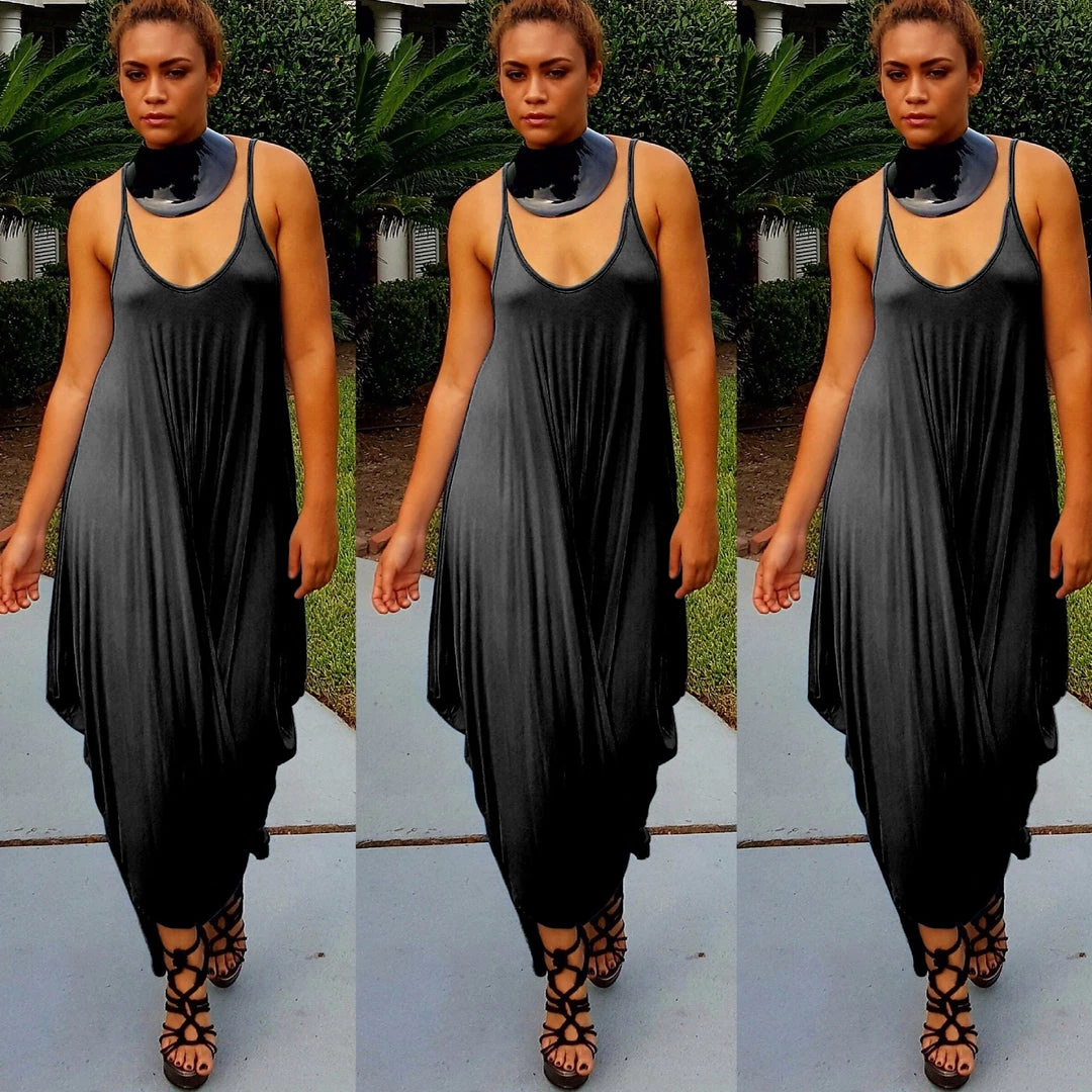 Black jumpsuit could go for a dressy casual look with heels and maybe add a jacket. Looks great also as a casual look with flats or sandals. Neckline also works well with a t-shirt or tank worn underneath to give yourself a layer of extra cleavage coverage or to cover your arms. Maybe wear a long duster or denim jacket with the jumpsuit for coverage of the arms. Fabric is a soft flowing cotton and jumpsuit is a loose fit. Spaghetti straps and round neckline. Scoop back line looks exactly the same as the front neckline. Ships form Houston Texas by Social Butterfly Collection.