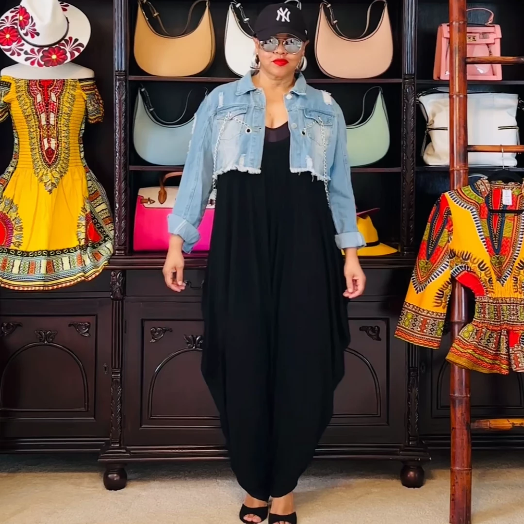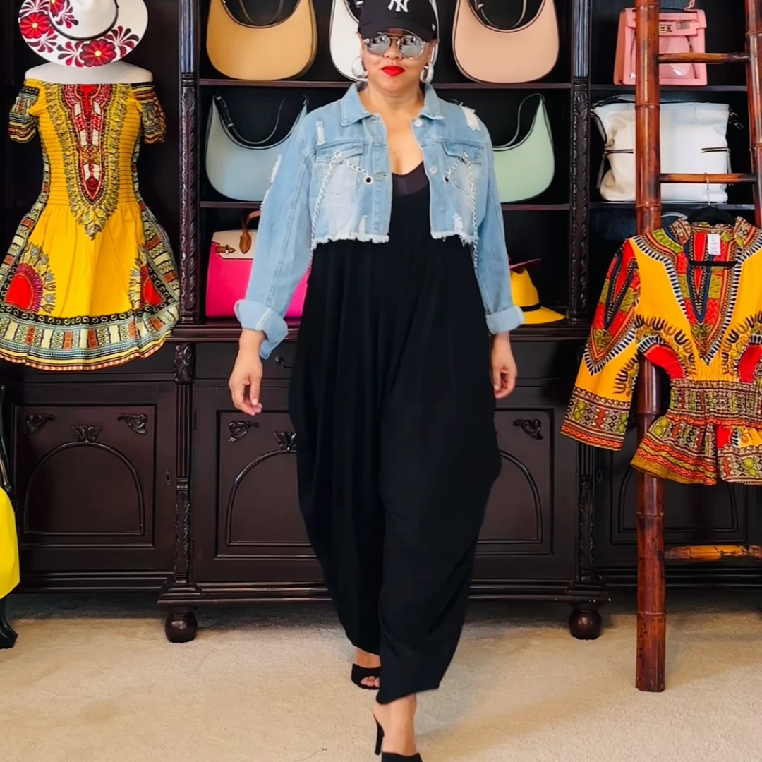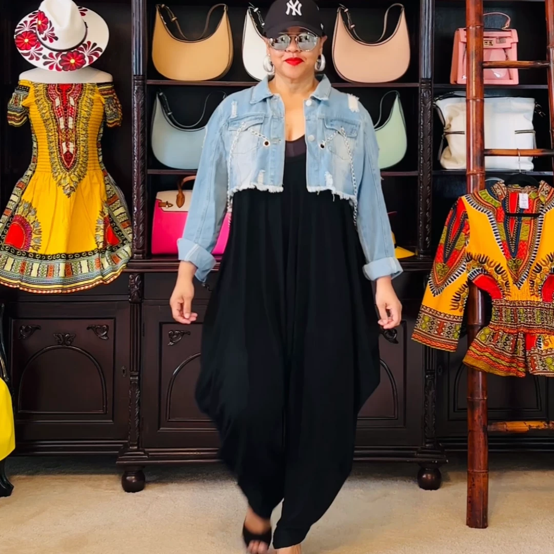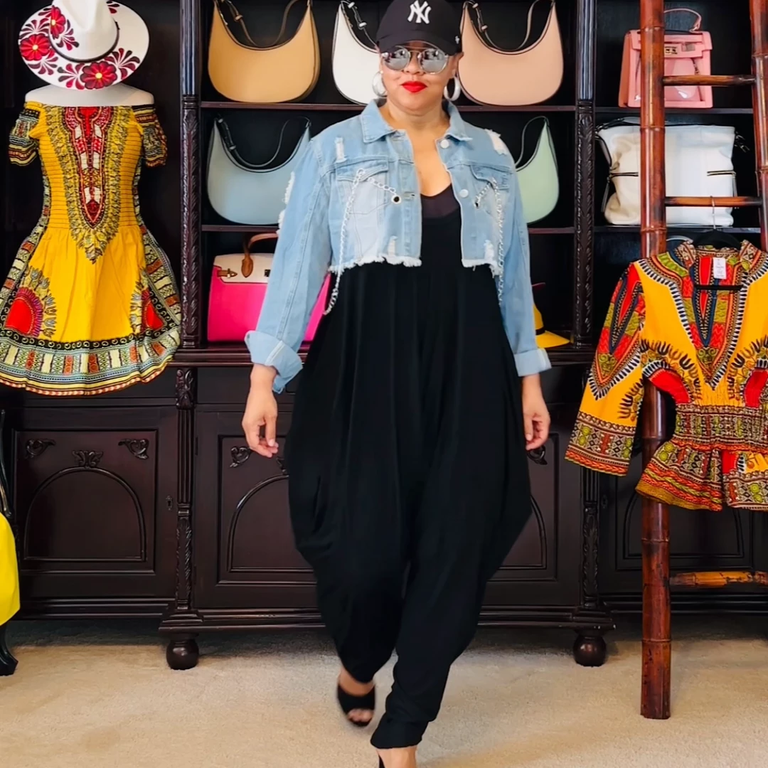 Black jumpsuit could go for a dressy casual look with heels and maybe add a jacket. Looks great also as a casual look with flats or sandals. Neckline also works well with a t-shirt or tank worn underneath to give yourself a layer of extra cleavage coverage or to cover your arms. Maybe wear a long duster or denim jacket with the jumpsuit for coverage of the arms. Fabric is a soft flowing cotton and jumpsuit is a loose fit. Spaghetti straps and round neckline. Scoop back line looks exactly the same as the front neckline. Ships form Houston Texas by Social Butterfly Collection.