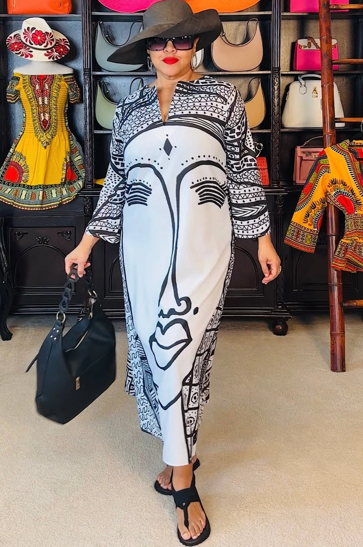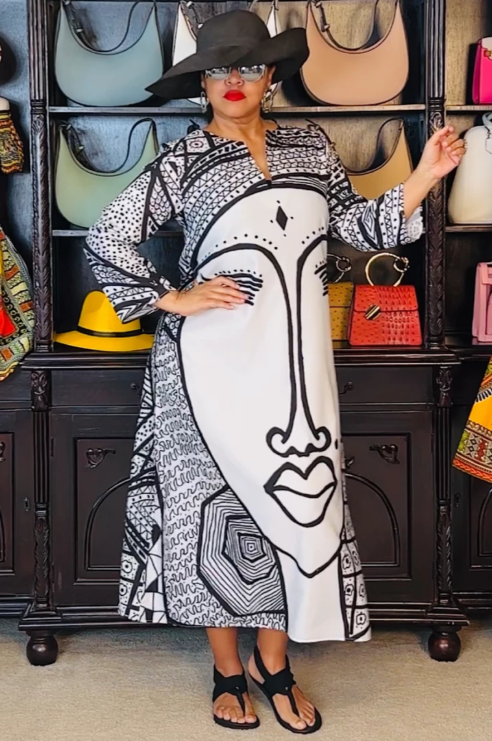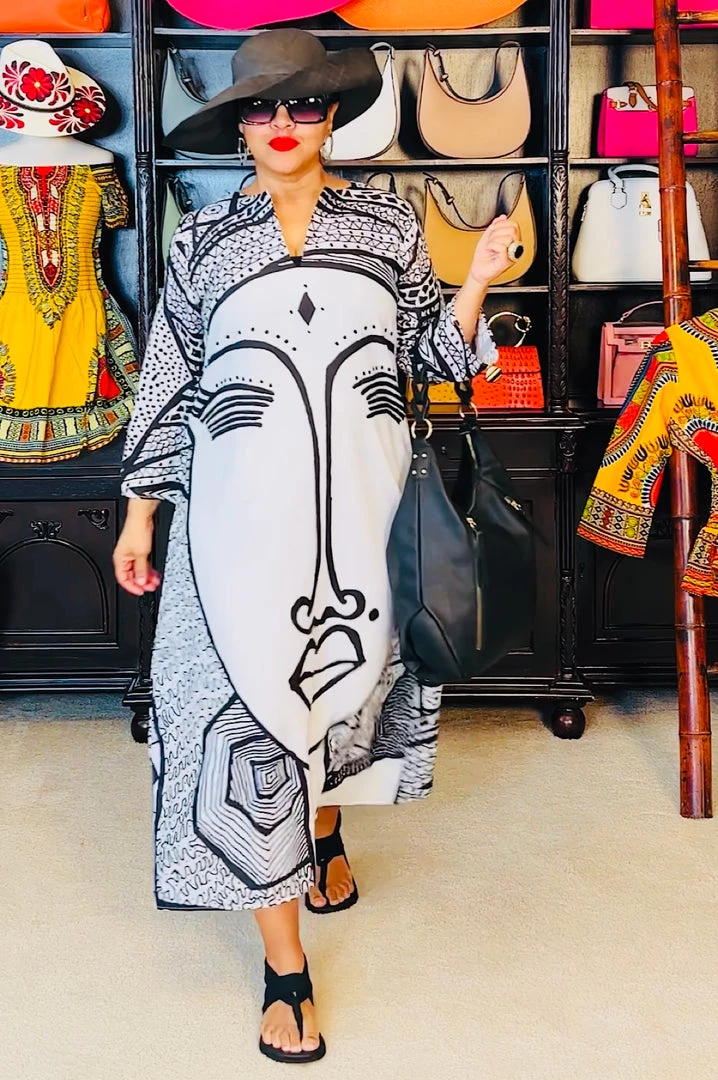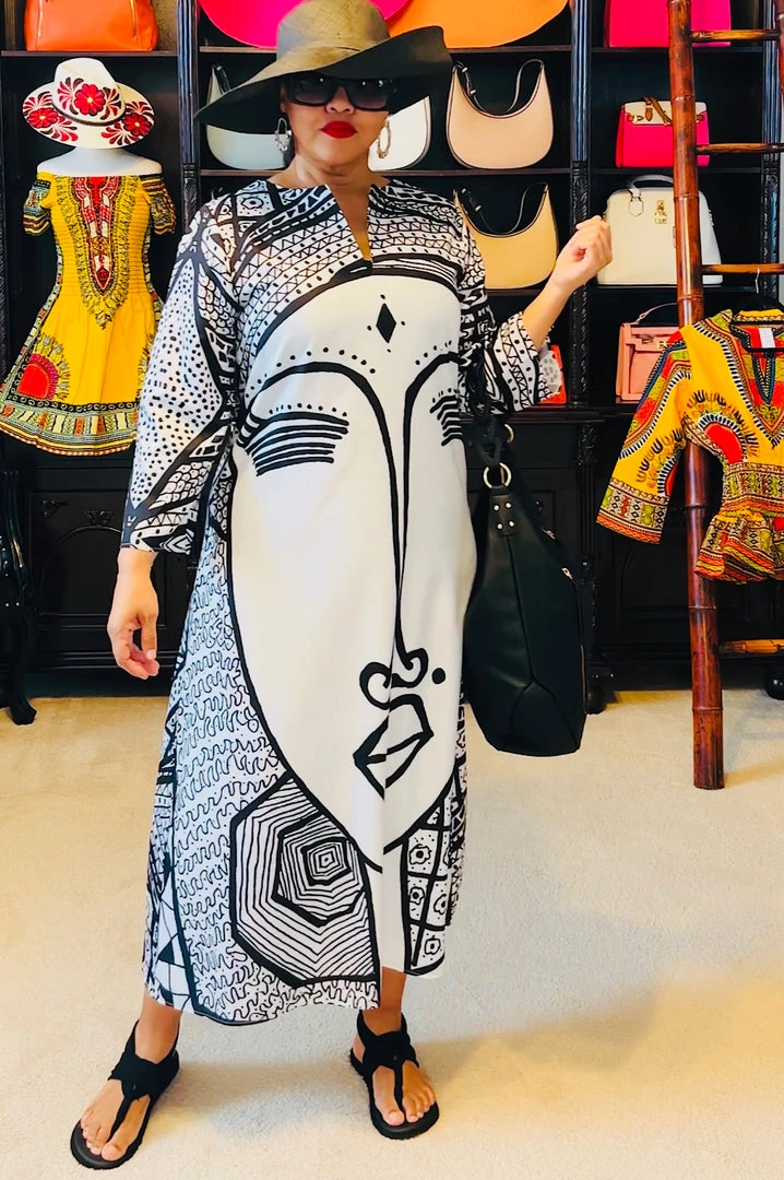 Black and white abstract print comfy dress. Very light weight cotton dress with sleeves a little below the elbows. V Neck split in front. Dress is loose fitting and fits true to size. No stretch. Perfect little dress for when you are looking to be cute and comfortable. Hat sold separately. Ships from Houston, Texas by Social Butterfly Collection.