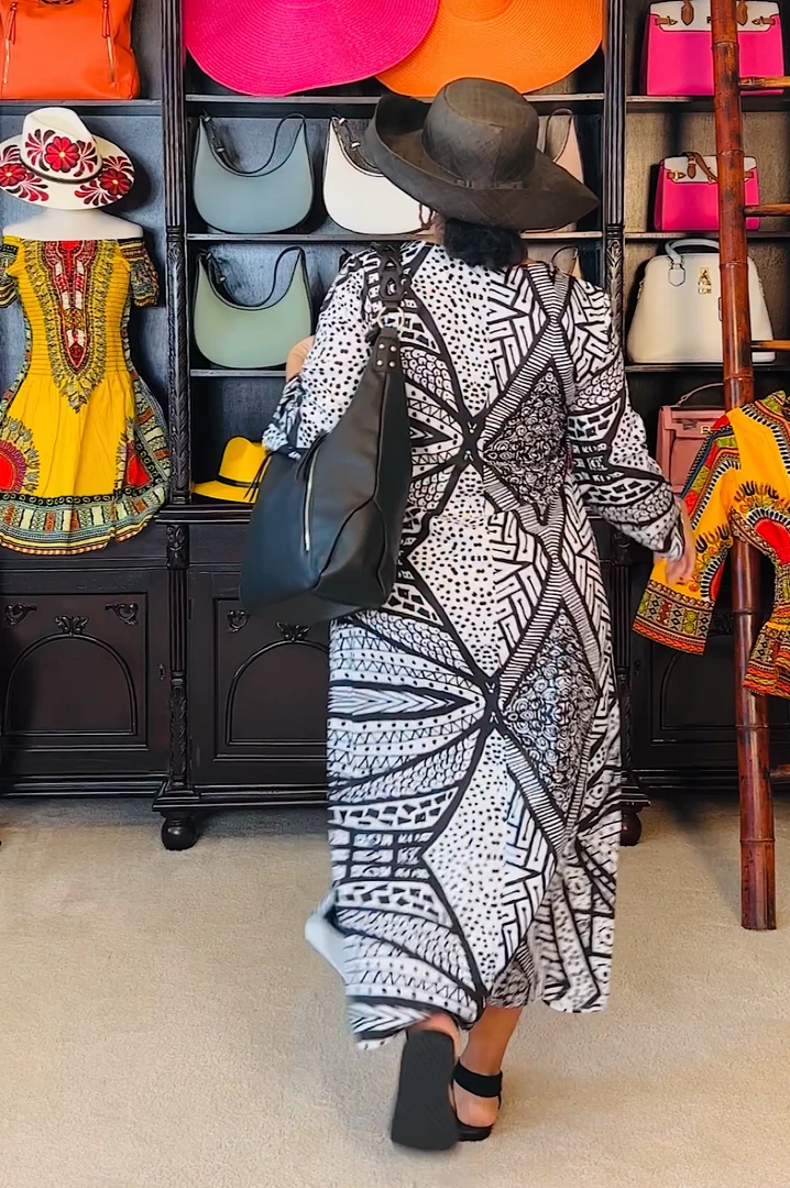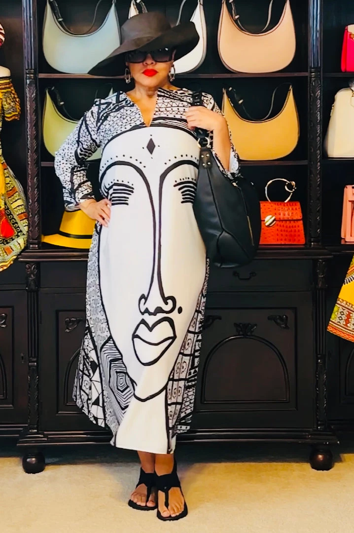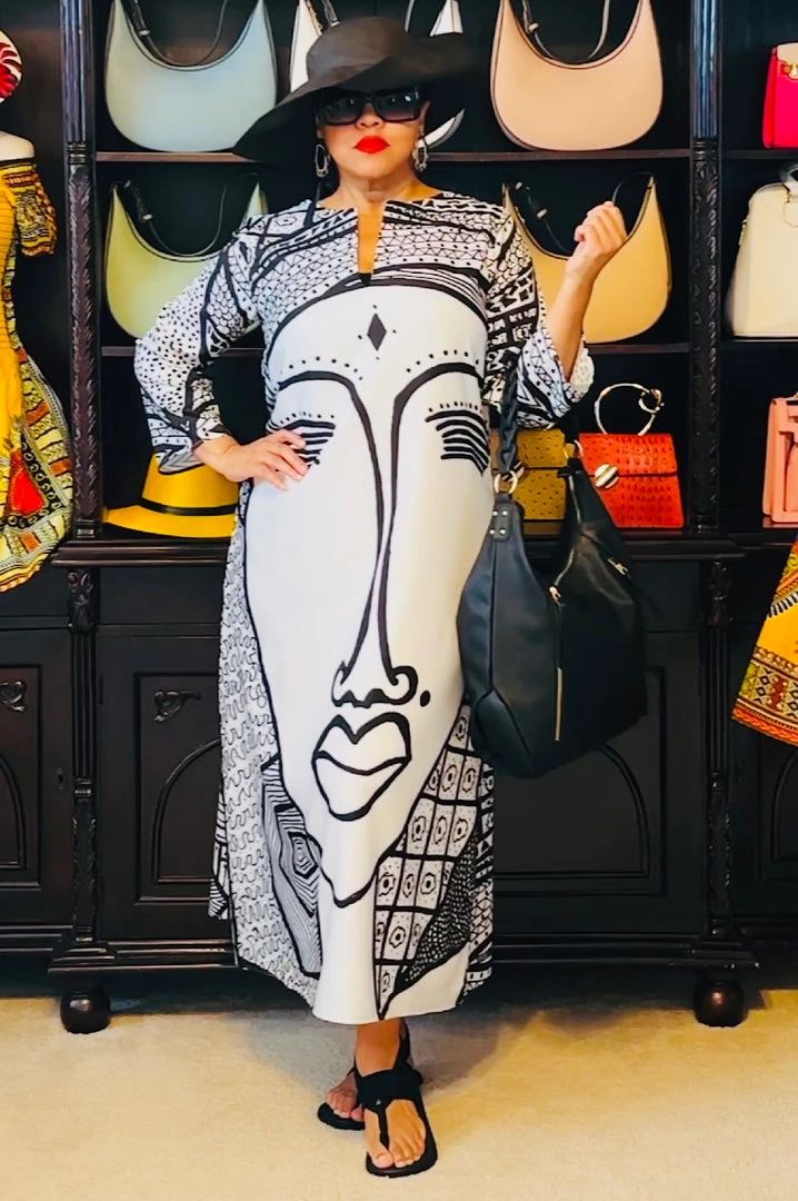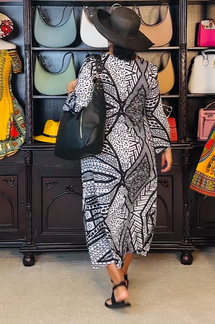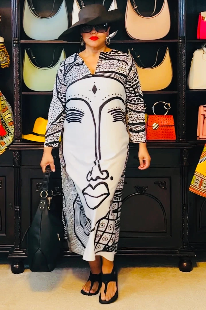 Black and white abstract print comfy dress. Very light weight cotton dress with sleeves a little below the elbows. V Neck split in front. Dress is loose fitting and fits true to size. No stretch. Perfect little dress for when you are looking to be cute and comfortable. Hat sold separately. Ships from Houston, Texas by Social Butterfly Collection.