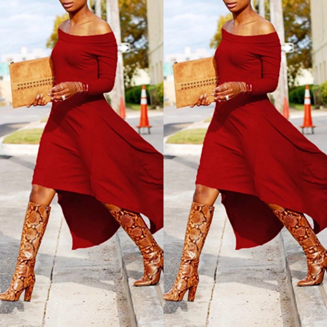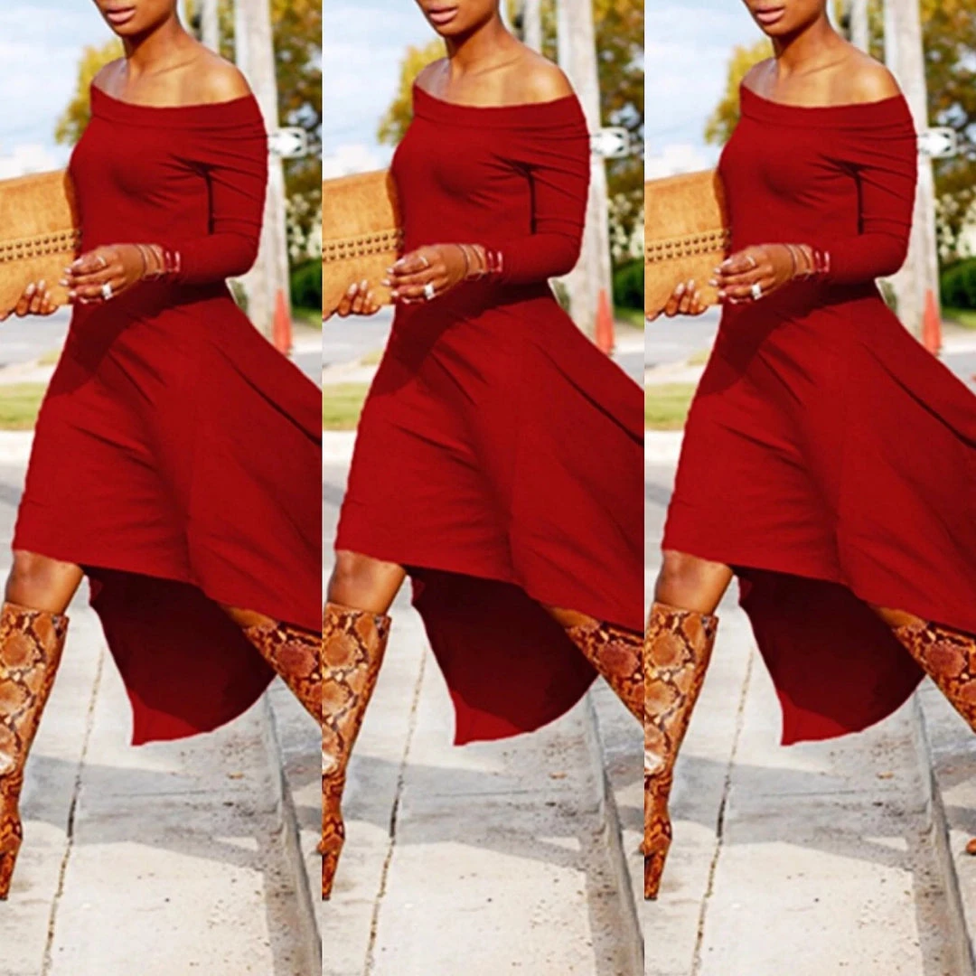 Color is more if a deep burgundy red. Looking good and being comfortable are not mutually exclusive in this lovely off the shoulder high low dress top. Works for a night out on the town or your favorite concert. Can be worn as a dress or as a top. Looks great with high heels, flats or boots. Dress top works well when worn with a belt to cinch in the waistline. Fabric is the perfect weight of jersey knit poly cotton spandex blend. Fits very true to size and is the perfect length to cover the top of the knees. Will not cover knees completely but will cover the side and top of the knees for appropriate coverage. Long sleeves can be pushed up around the elbows. Perfect fabric for year round wear. Front measures 33 inches and back measures 54 inches. Model is 5 feet 6 inches tall. Model’s bust measures 40 inches and waist 34 inches and hips 43 inches. Model is wearing size 12-14 which equals a large. Looks great with high heels and also works with boots or worn with leggings. Shown here with faux leather leggings shown separately. Ships from Houston, Texas by Social Butterfly Collection.
