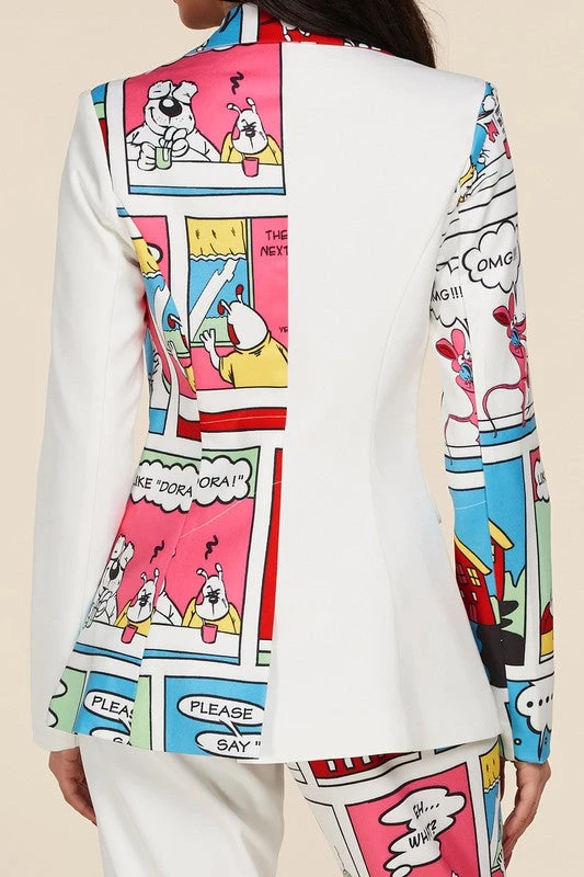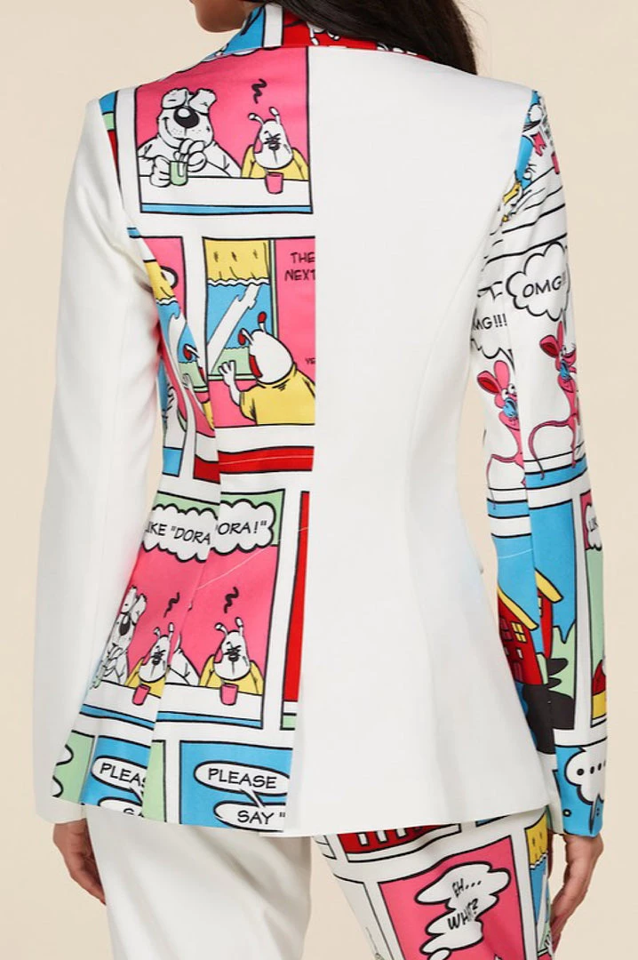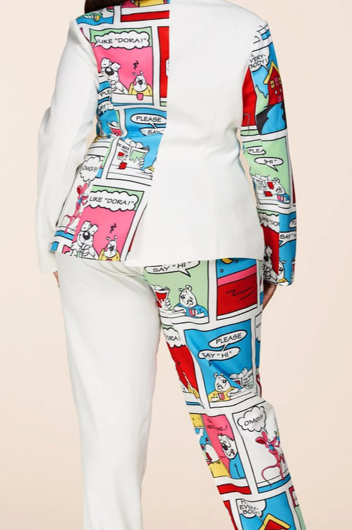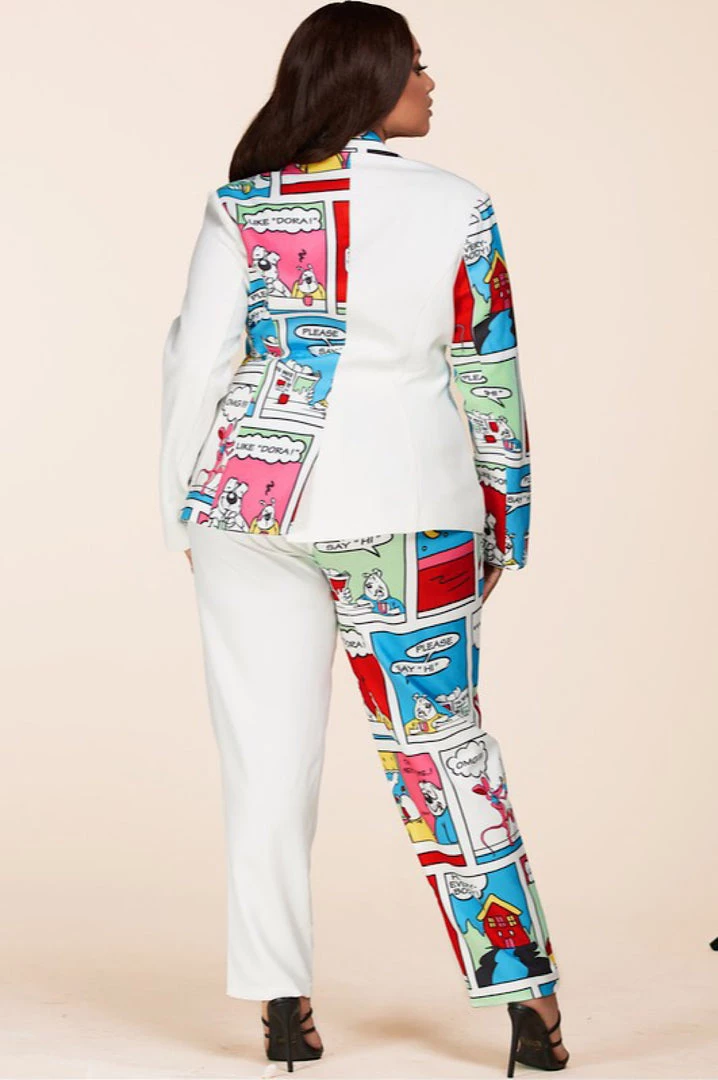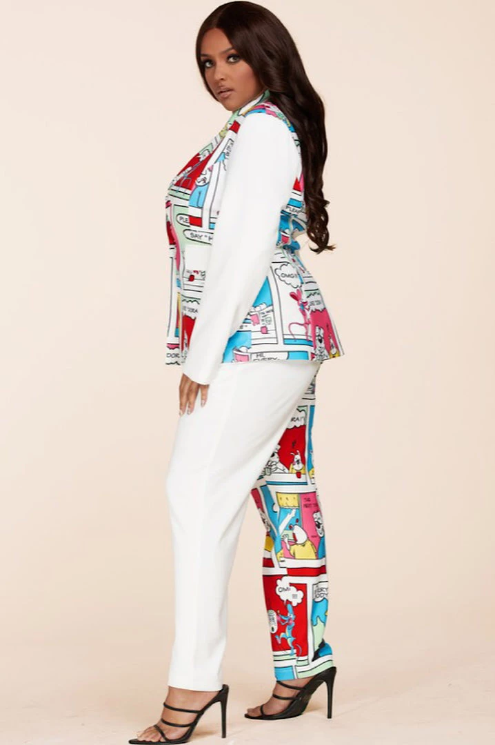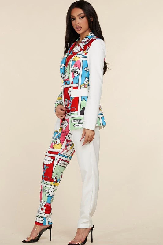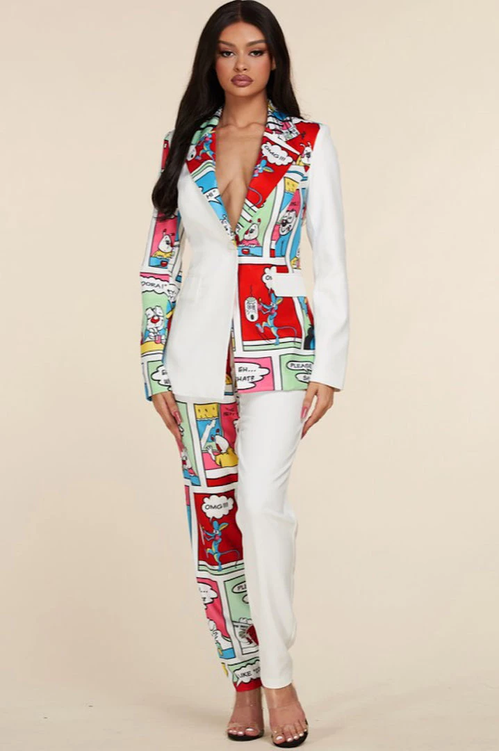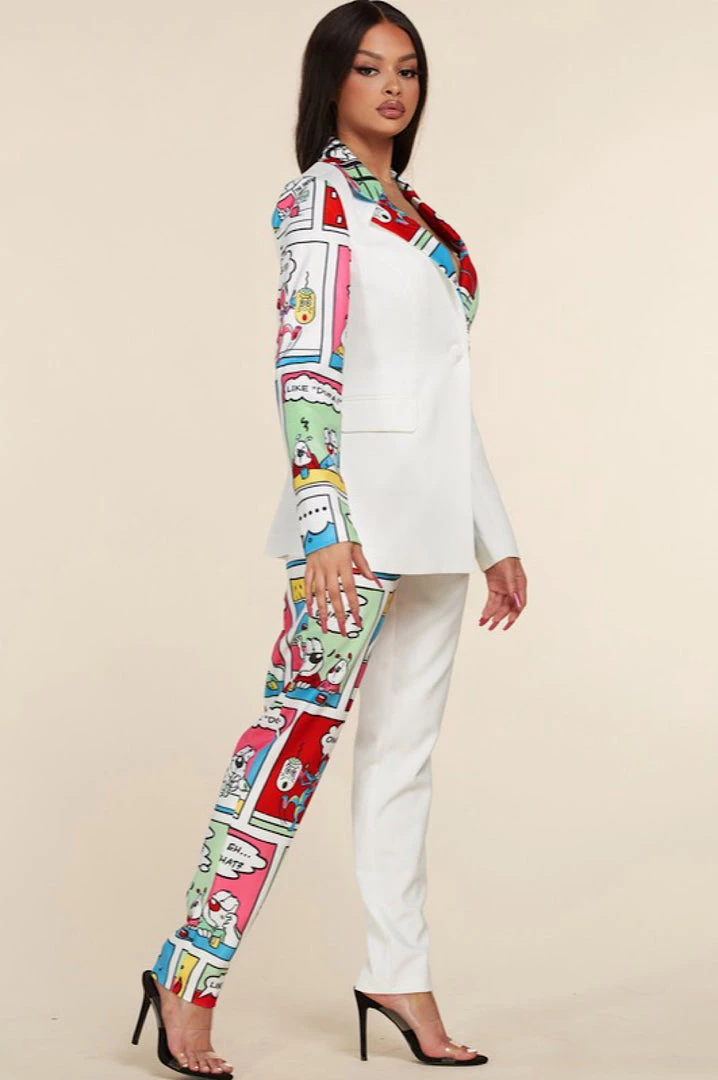 This pant suit gives you a modern and beautiful choice for your special occasion outfit. Fabric is a polyester blend that is very comfortable and easy to wear. The jacket is fully lined with single button closure. Pants have stretchy elastic in the back for a better waist fit and the front waist band is smooth with single button and hook closure that is covered. This is true to size and easy to fit. No need to go up in size. You may need to or want to get the suit tailored or altered to your perfect fit for the best overall look. Colorful color block with ivory off white on the opposite side. Sold as a two piece suit. Pants are 42 inches long and the inseam is 31 inches. Ships from Houston, Texas by Social Butterfly Collection