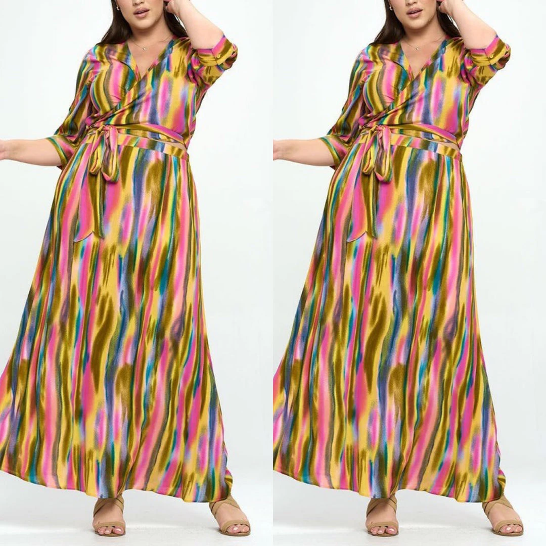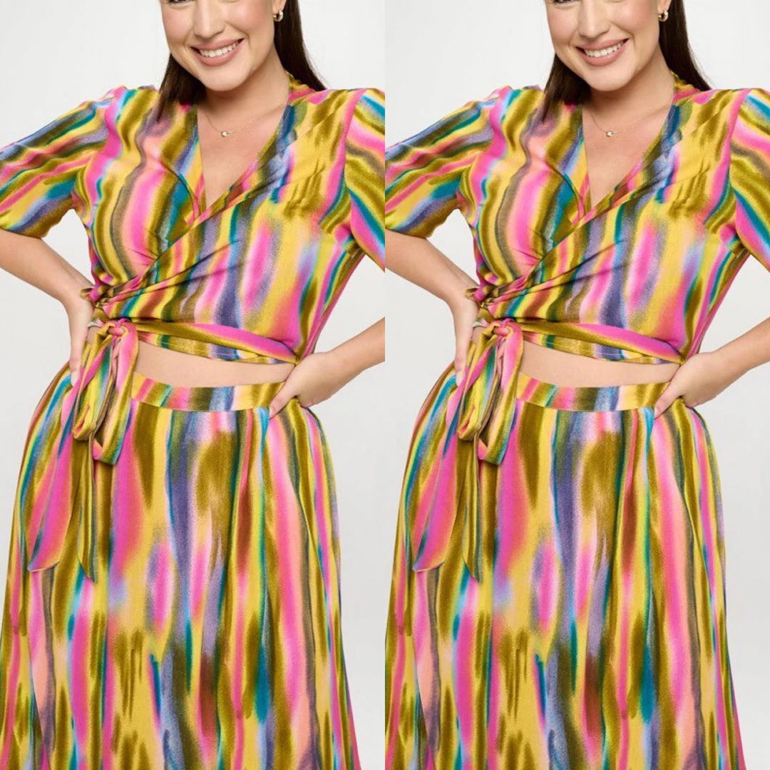 Multi color two piece set with cropped top and elbow length sleeves. Jersey knit stretchy fabric that’s soft and comfortable. No need to worry if it will fit because it does stretch very well all over. Good true fit with nice long skirt. The sleeves and all over fabric will stretch to fit. Also, please keep in mind that this is designed to be form fitting and the top will hug your curves. The vibrant colors and prints are a great effect because it helps to camouflage cellulite or natural body appearances. The skirt is long and you can pull it high up on the waist or stomach if you want to keep from having skin show since the top is short crop top. This outfit is super super cute on. Worth a try. Ships from Houston, Texas by Social Butterfly Collection
