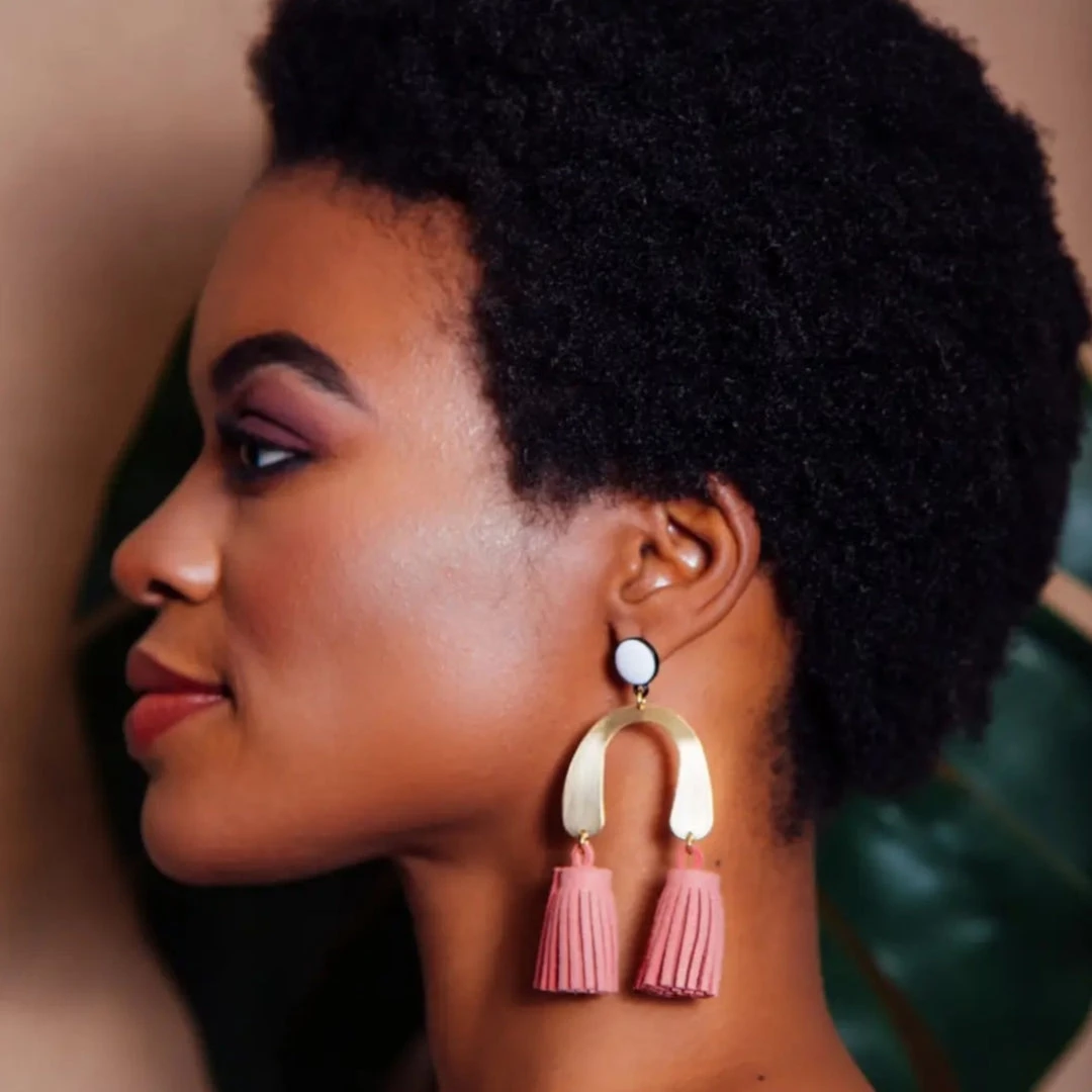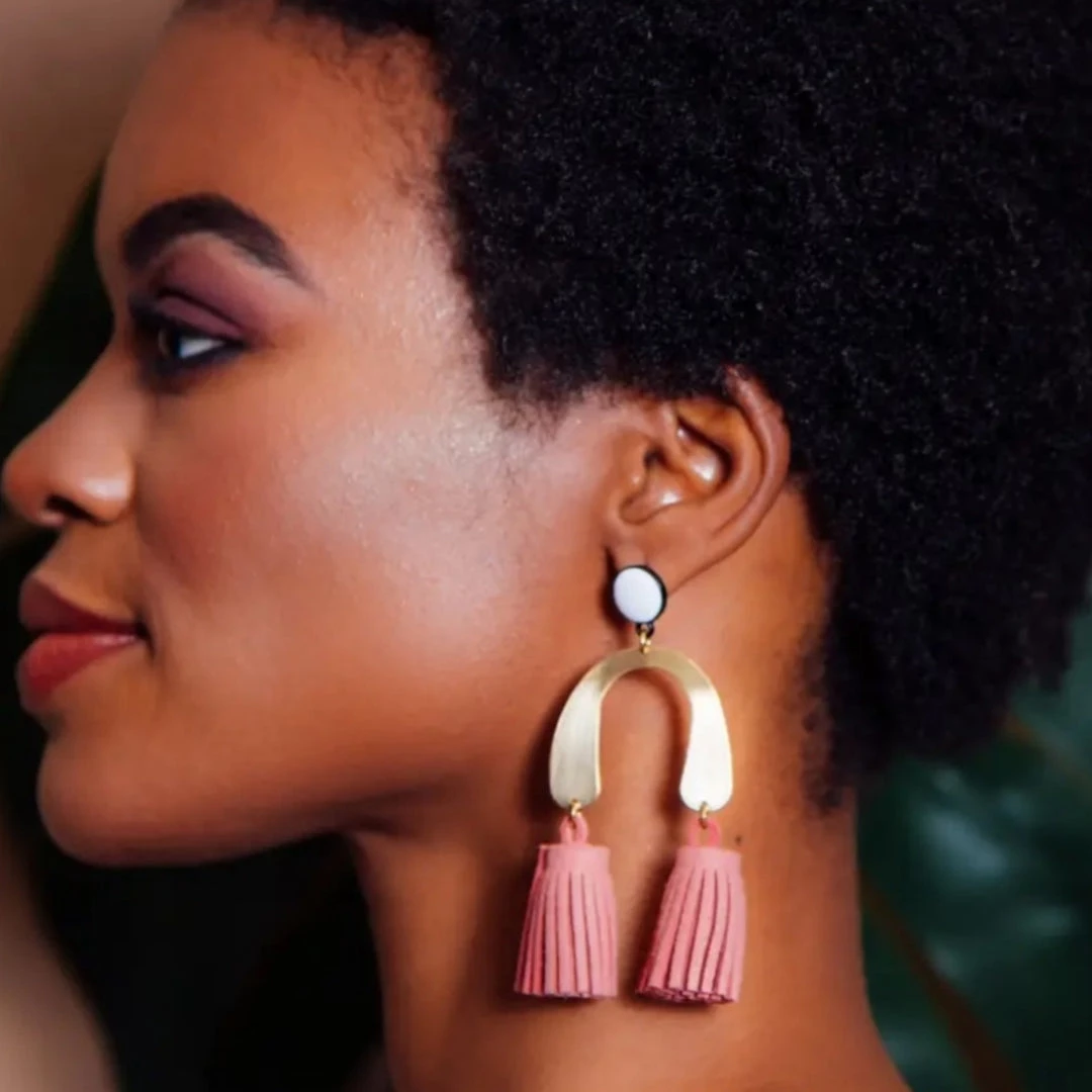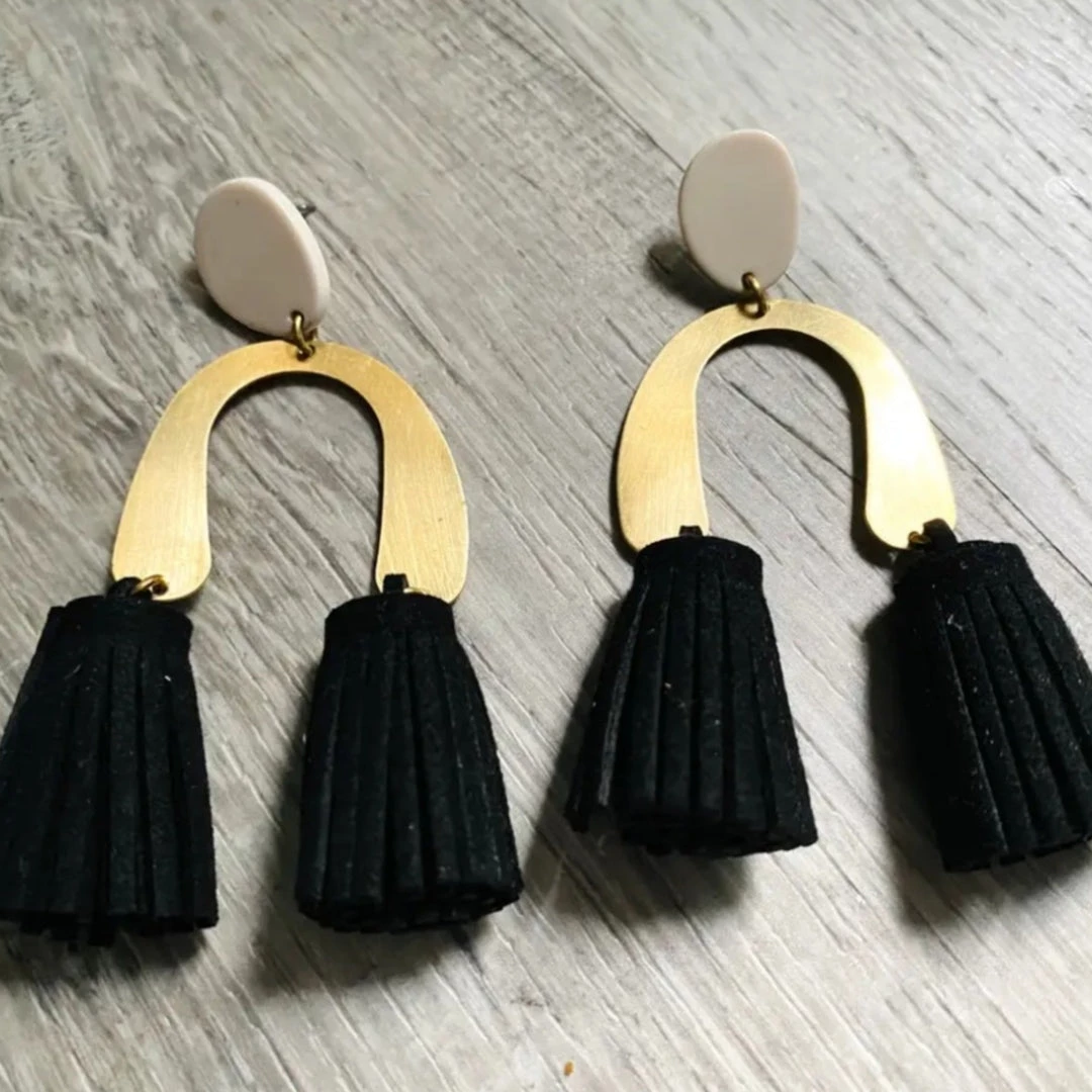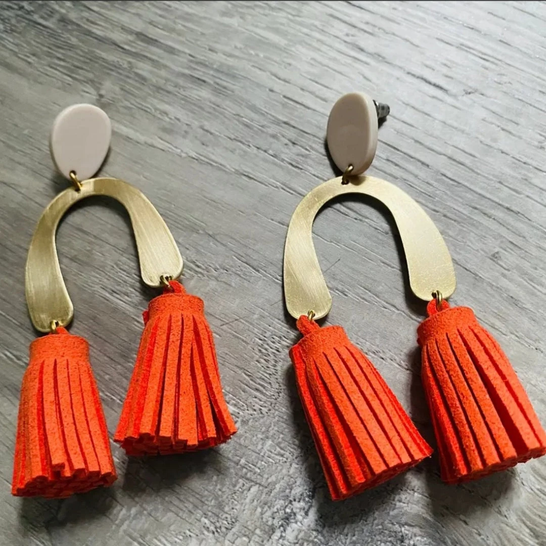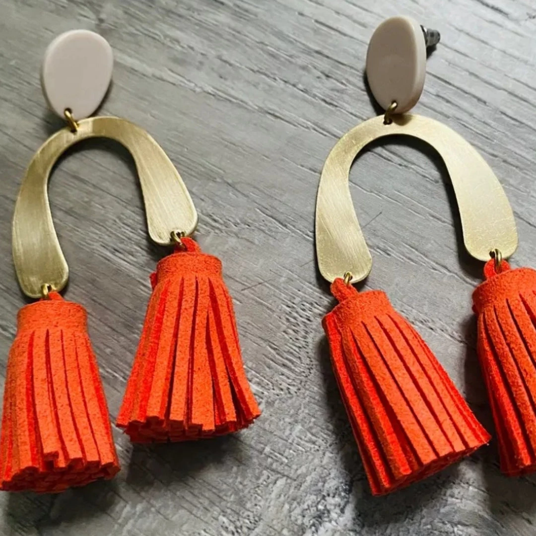 Hand forged brass and acrylic disc. Made with vegan suede light weight earrings. Available in pink, black,royal blue and orange. Measurements 2.6 inches. Stainless steel post. Not sure what to wear to your next engagement? Then grab your little black dress and top it off with a pop of jewelry. Truly timeless classic pieces will never go out of style. Great looks to add color or flash to a solid color dress or outfit. Be Bold. Be Beautiful with your favorite item of jewelry from Social Butterfly Collection. Ships from Houston, Texas by Socialbutterflycollection.com