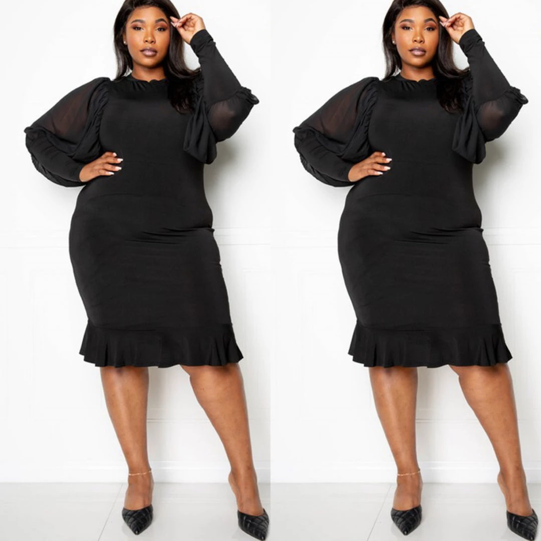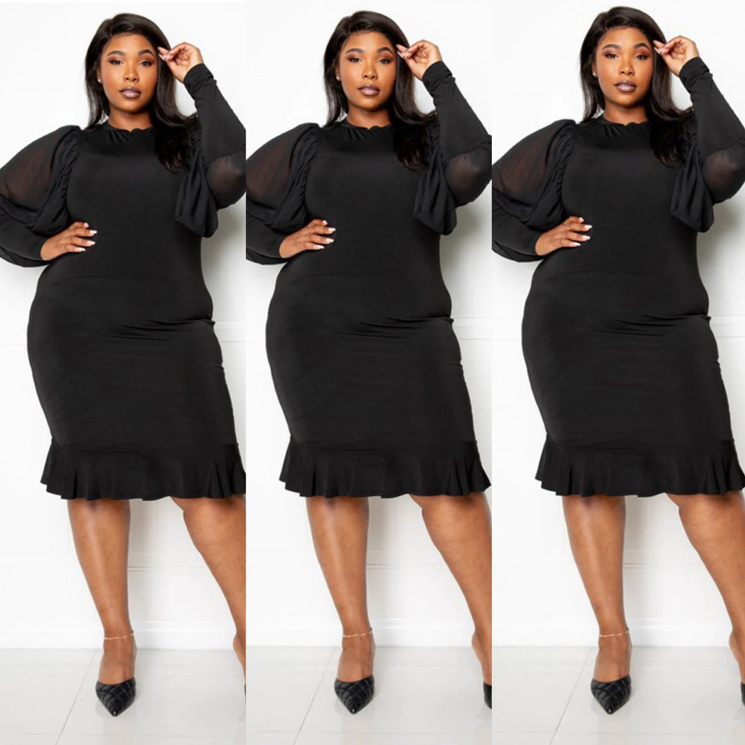 Elegant and beautiful sheer sleeve dress with a dainty small ruffle at the hemline. Dress is the perfect little black with a simple neckline and knee length fit. Fabric is a soft soft Jersey knit with spandex for stretch and a comfy fit. Sleeves are wider at the top and get slimmer and slimmer from the elbow downward to the wrist. Dress is timeless and will never go out of style. You can wear this dress year after year. The fabric is appropriate for all seasons. Dress looks polished yet comfortable. Ships from Houston, Texas by Social Butterfly Collection.