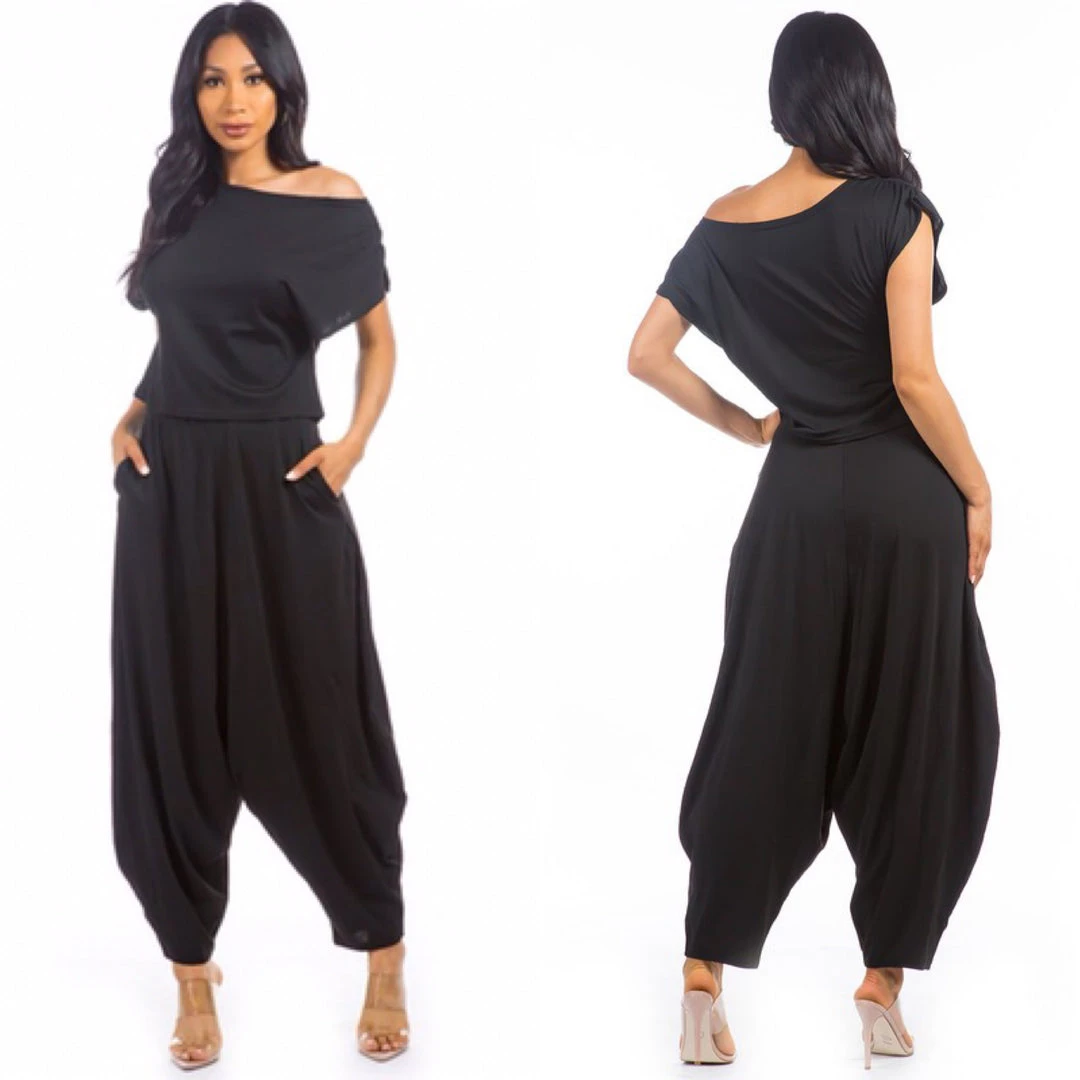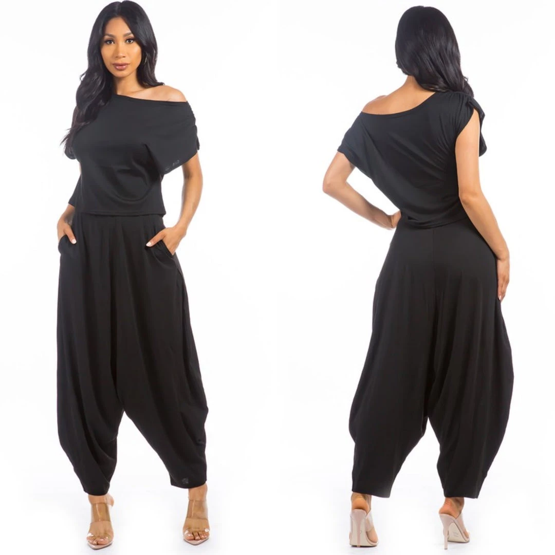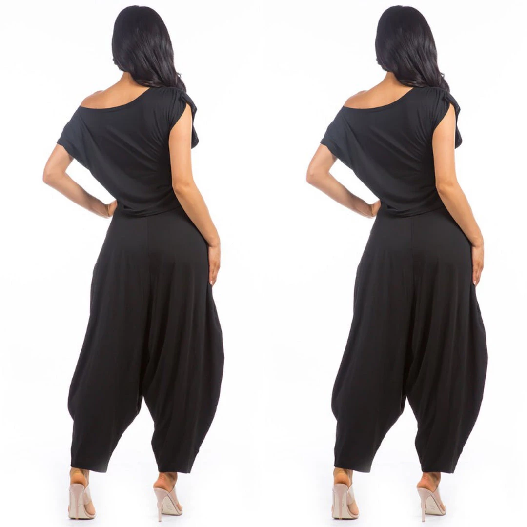 In stock (restocked) and ready to ship This one comes as a two piece set. You will get both the pants and the top. Perfect outfit for a wide variety of occasions like a concert, brunch, vacation or anytime you want to be sexy yet comfortable with no fuss. This outfit is for the whisical, sexy, cool ladies. Jeannie pants are perfect with heels or flat sandals. If you want to break up the set, you can wear these pants with another color tee or short jacket and rock your new favorite comfy look. Also, can wear the top separately with maybe a pair of jeans or shorts Fabric is cotton and spandex blend. Waistband has elastic stretch for comfort. Pieces are super comfortable and fit beautifully. You will love wearing this outfit anytime or any place. Pants have side pockets. Top is perfect loose fit that you can wear on or off the shoulders. You will love pairing this top with so many other bottoms. Ships from Houston Texas.