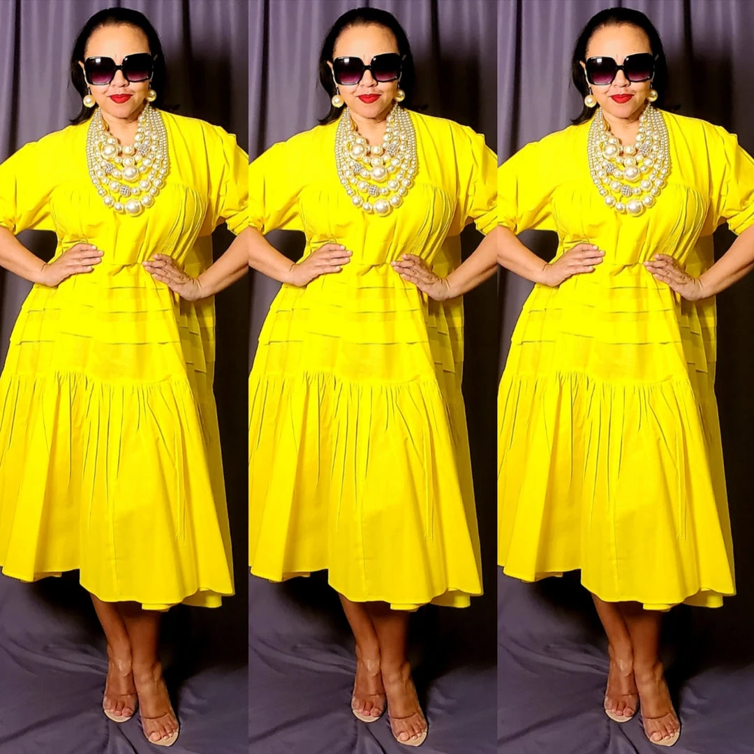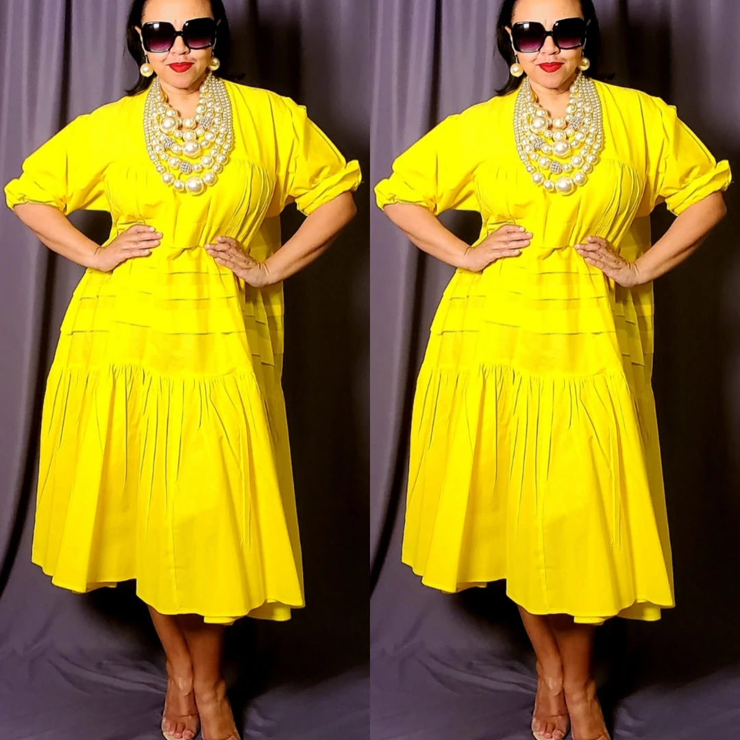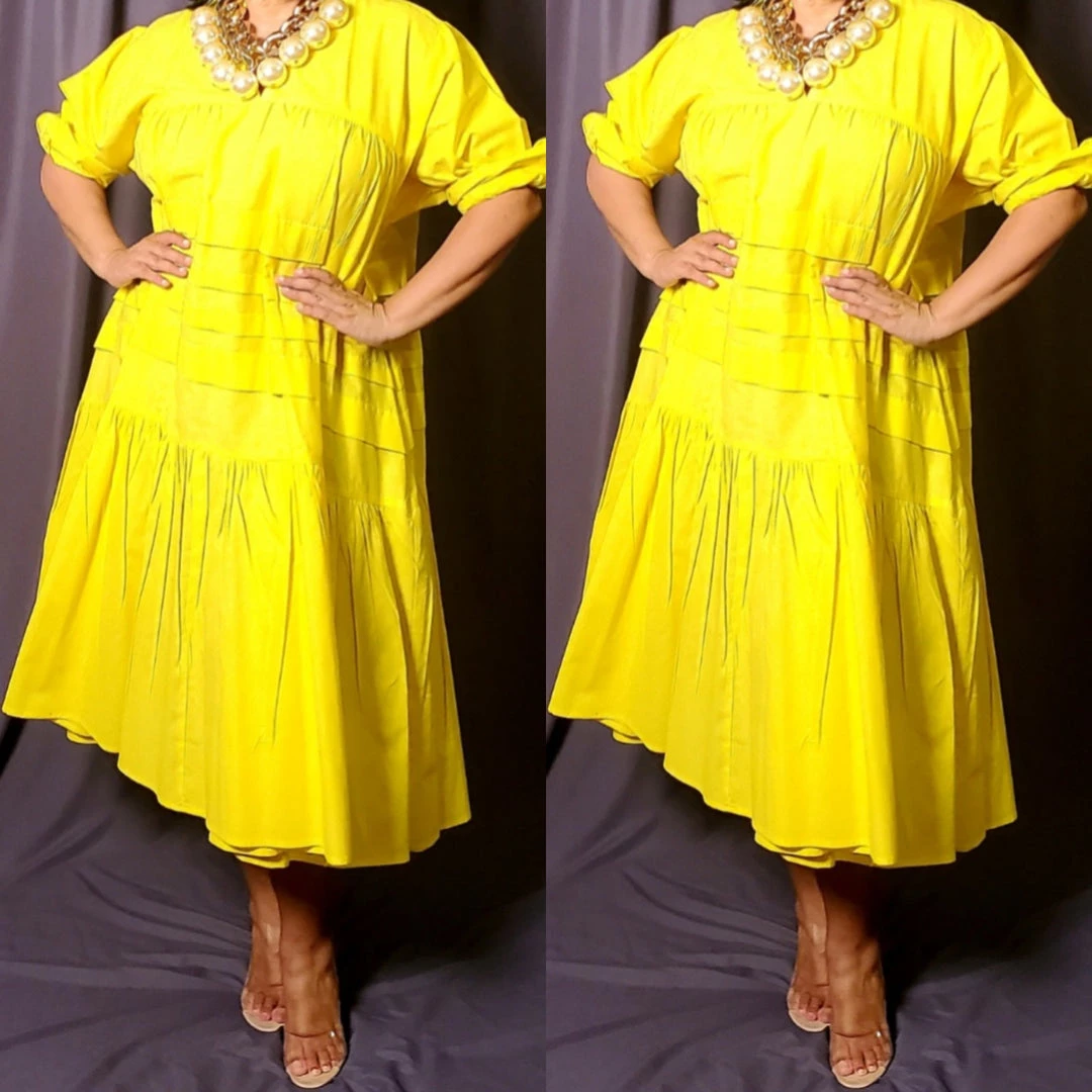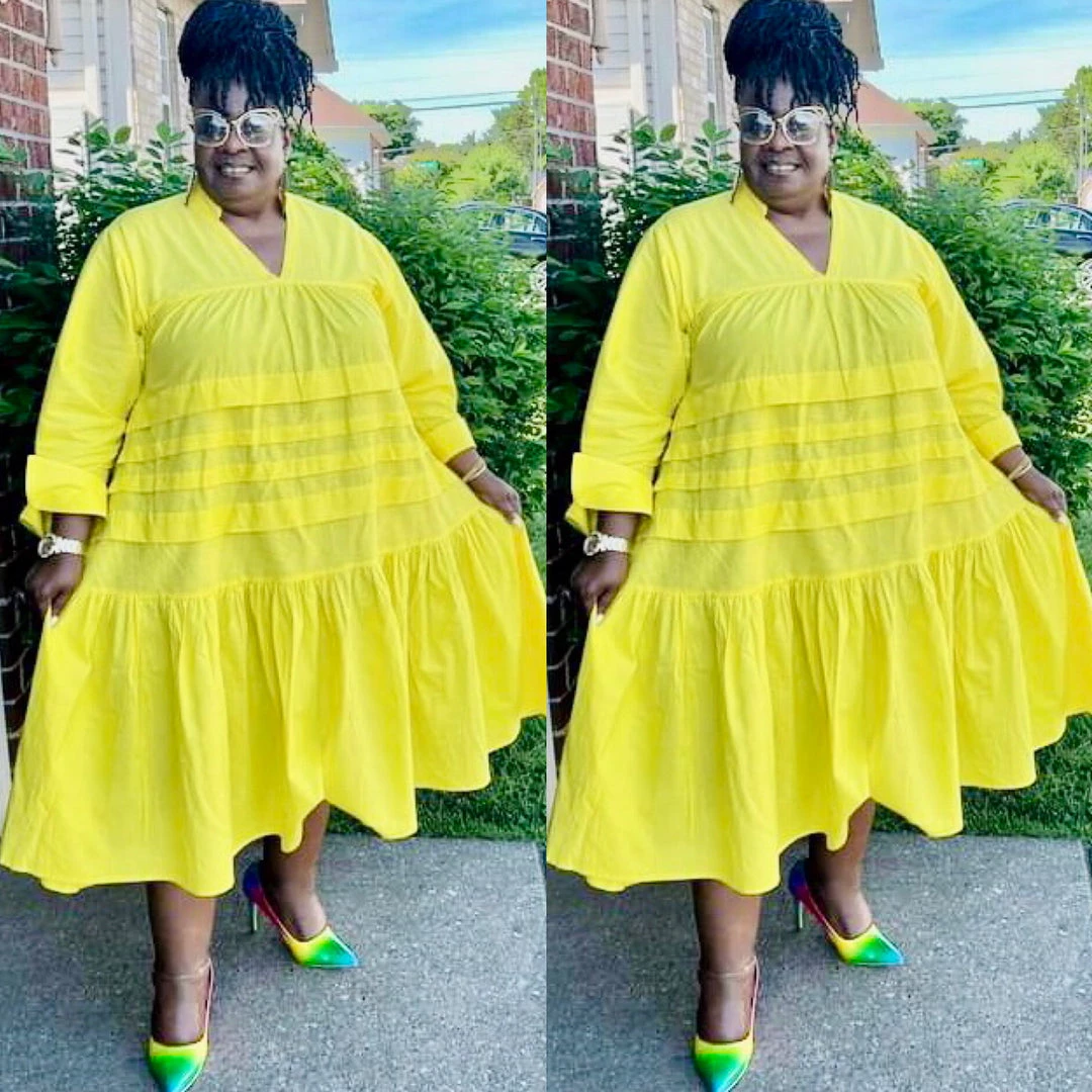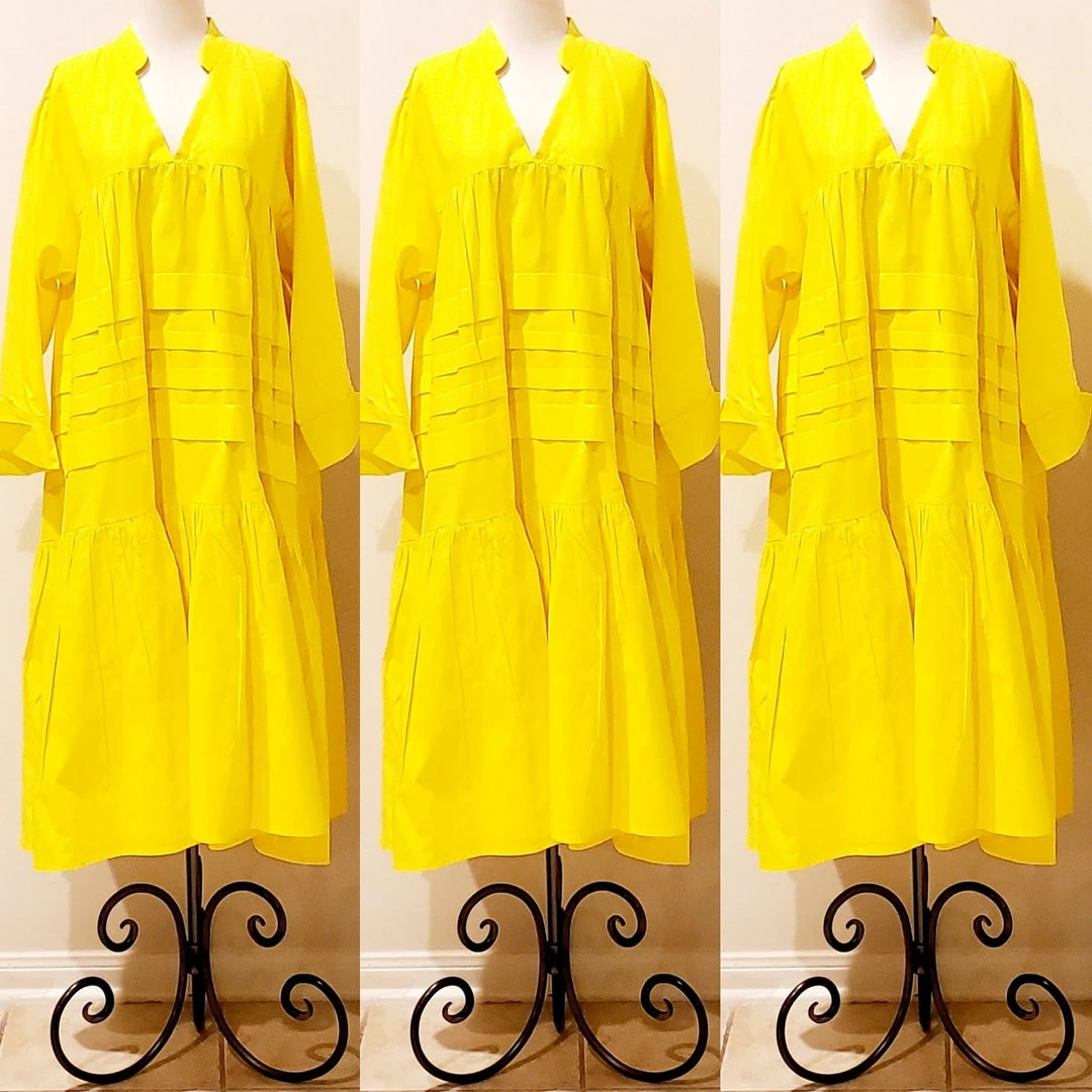 This dress is 48 inches long from shoulder to the bottom and is designed to fall below the knee. This dress will surely drop below your knees. Perfect length for church and comfort will sitting and standing to get the leg coverage some of us desire. We do have this same dress in a shorter version that measures 37 inches long. The 37 inch dress top is more short babydoll style that is perfect for shorter or more petite women or for those who prefer the shorter babydoll look. Babydoll length could also be worn as a tunic top over leggings, pants or jeans. If you order this dress, you will get the LONGER 45 inches dress. Fabric is perfection and fantastic for year round wear. Need to dress up but you don’t want to fade into the crowd or be over dressed either? Then wearing this beautiful below the knee bohemian style dress will surely make you stand out and be seen while still being comfortable. While everyone is looking at you, you’ll be cool, comfortable and confident because this dress brings out your true effortless style. Wear with heels or sandals and you will be good to go. Dress is very generous in sizing and is designed to fit loose and full. Sleeves are wide long length with turn up French style cuff. V neckline is very flattering. Dress is available in red, yellow, blue and white. Ships from Houston, Texas by Social Butterfly Collection.