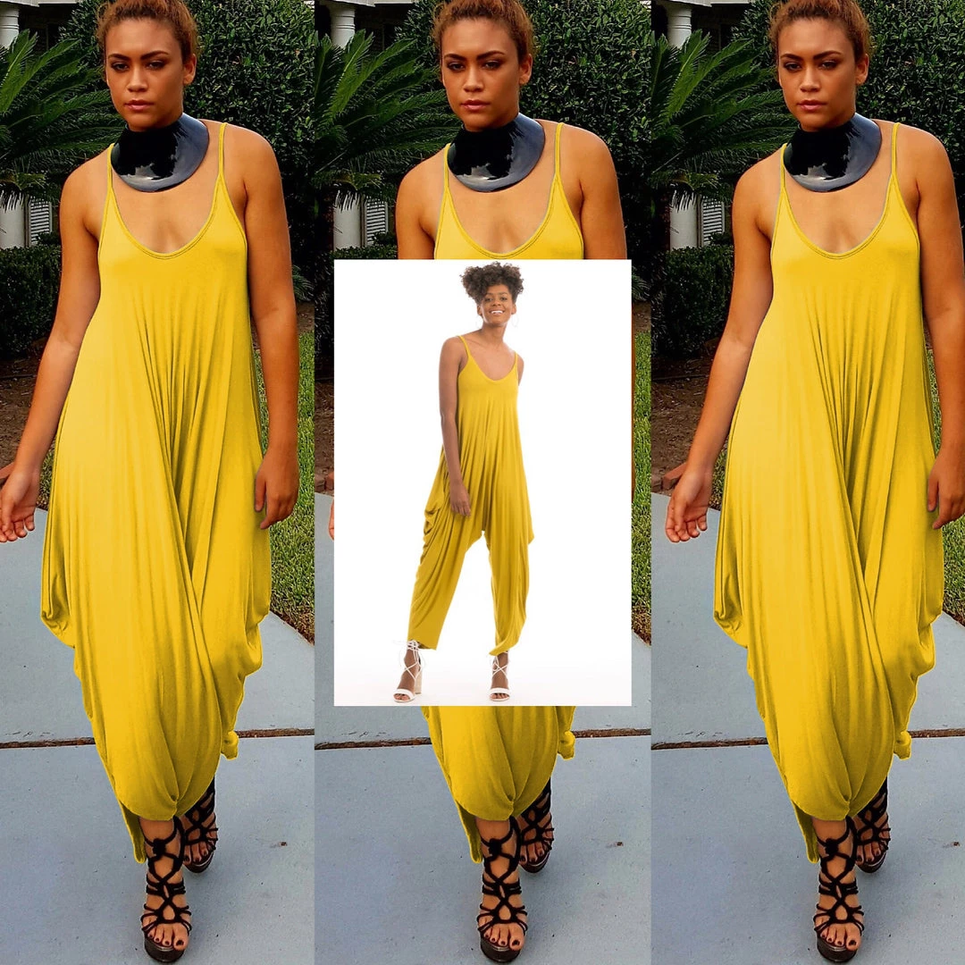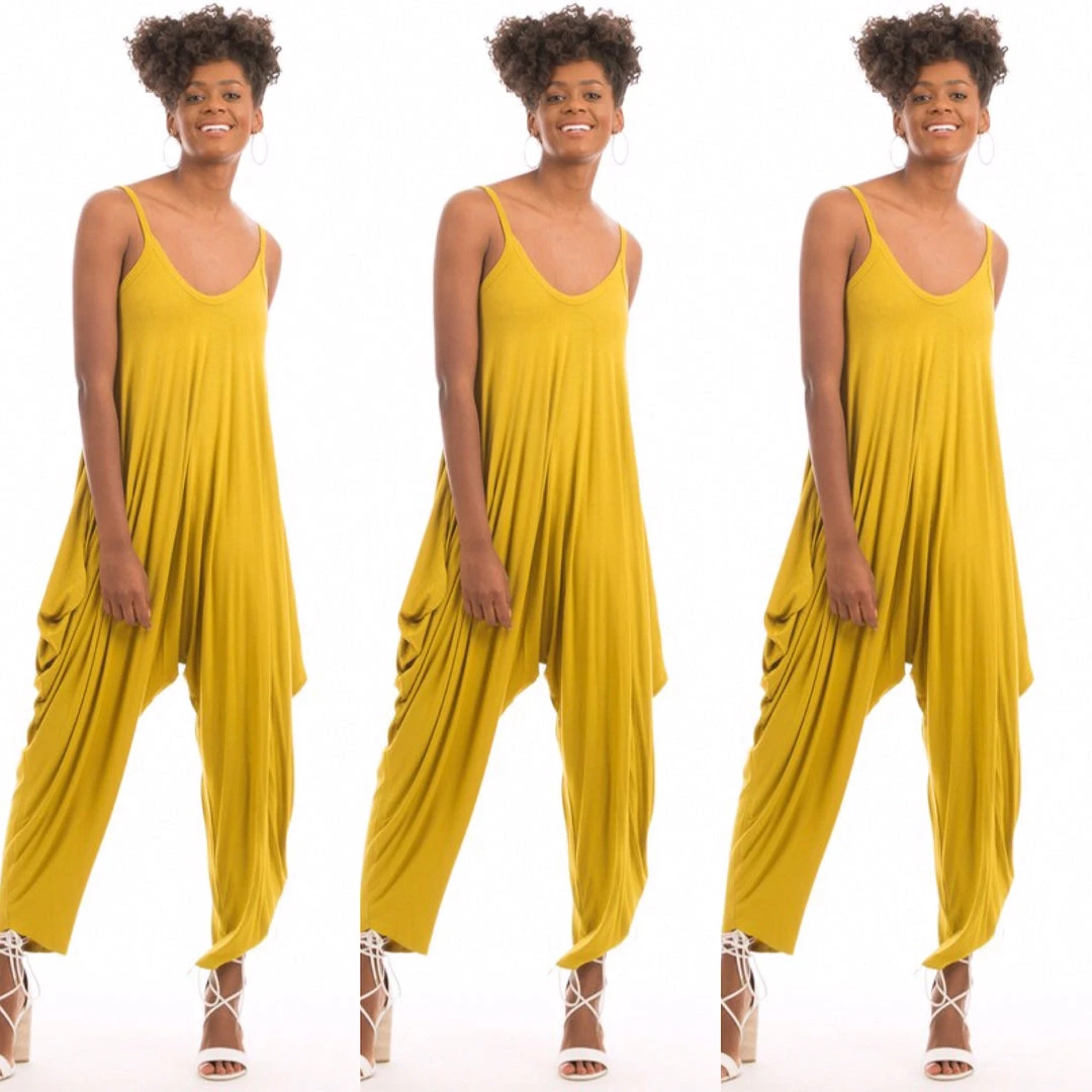 Yellow jumpsuit could go for a dressy casual look with heels and maybe add a jacket. Looks great also as a casual look with flats or sandals. Neckline also works well with a t-shirt or tank worn underneath to give yourself a layer of extra cleavage coverage or to cover your arms. Maybe wear a long duster or jacket with the romper for coverage of the arms or maybe a cropped denim jacket. Fabric is a soft flowing cotton and jumpsuit is a loose fit. Spaghetti straps and round neckline. Scoop back line looks exactly like the front. Ships form Houston Texas by Social Butterfly Collection.
