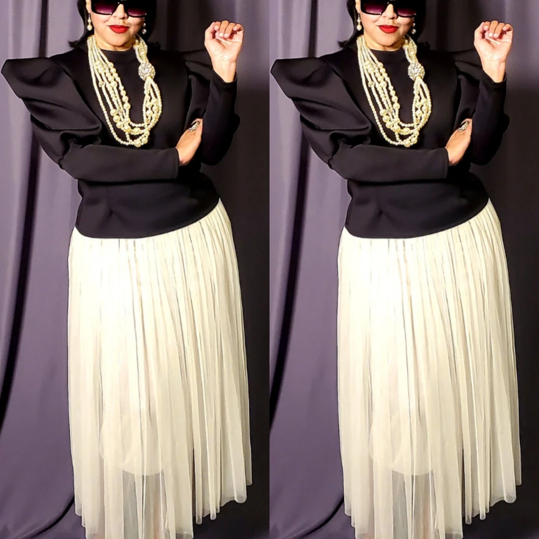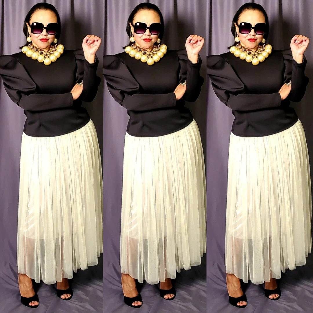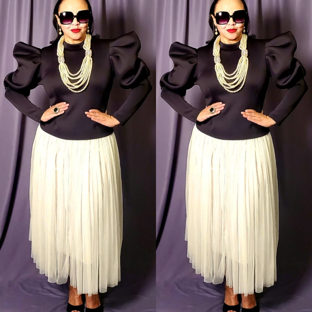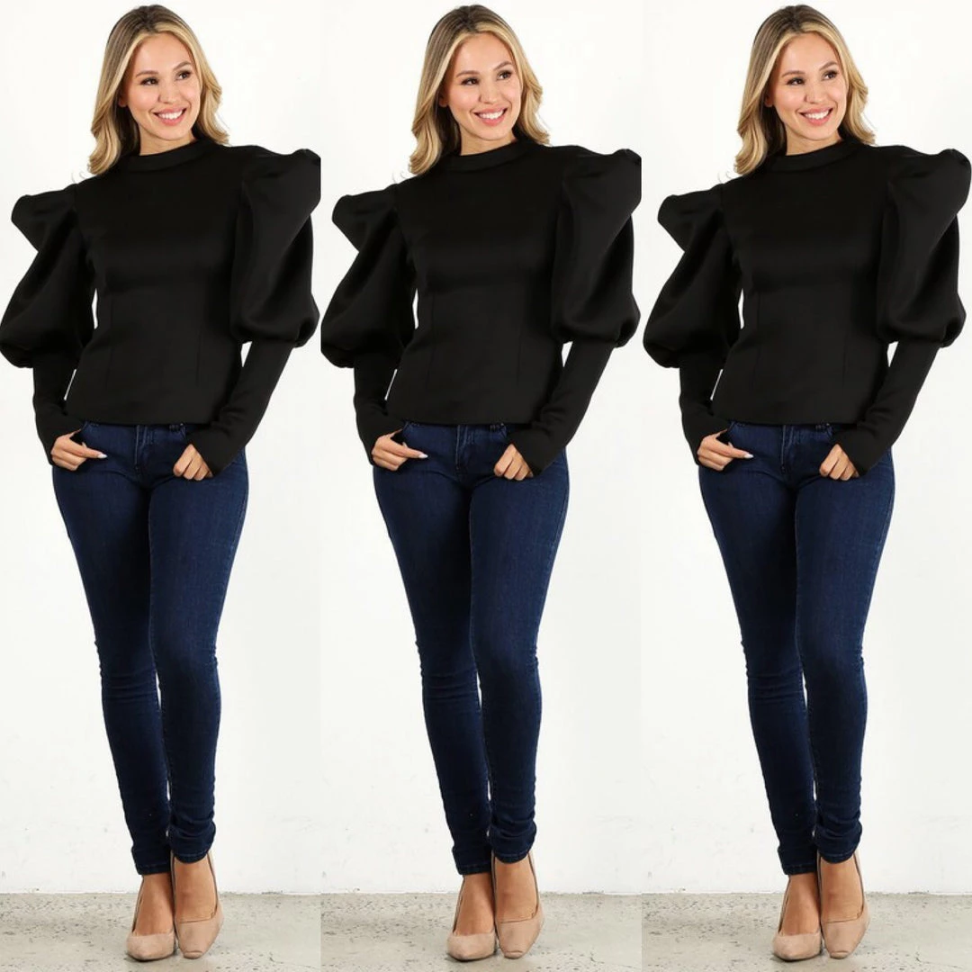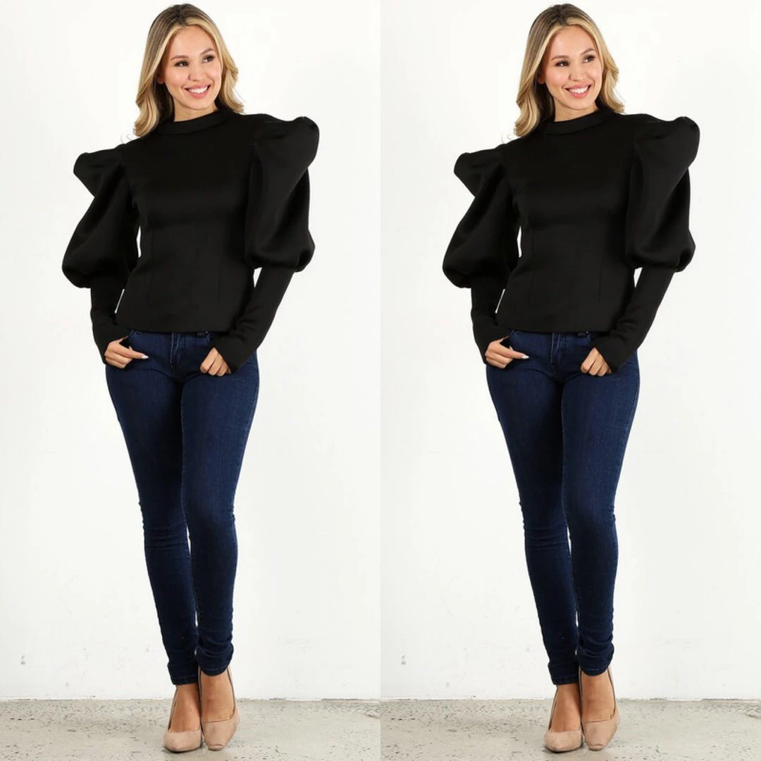 Your closet should always have pieces you can wear with anything and look great; and there is no better example of that than this fitted puffy sleeve top. Top is very fitted in the bodice and lower arms. We recommend going up one size if you are top heavy and carry more weight in your bust and stomach. Shirt is short waist so it looks best with high waisted pants or skirt. Fabric has a lot of spandex and stretch. Material is polyester and spandex blend. Back of the top has full zipper with cute pearl detail. Lots of stretch for that perfect fit. Fabric is medium weight. Ships from Houston, Texas by Social Butterfly Collection.