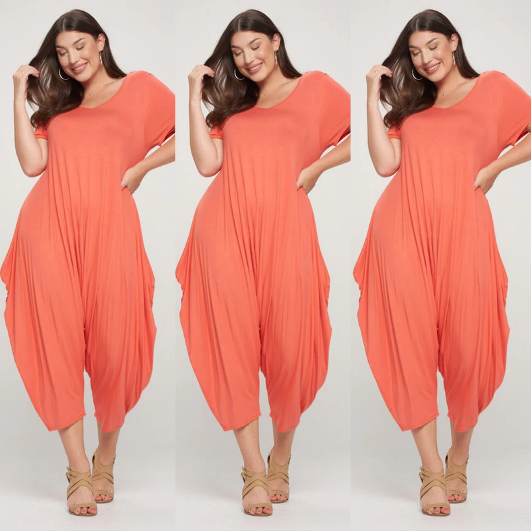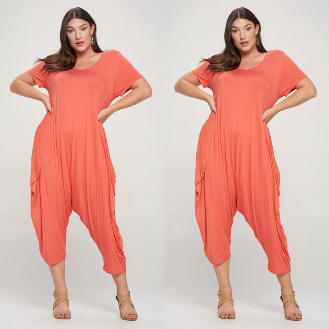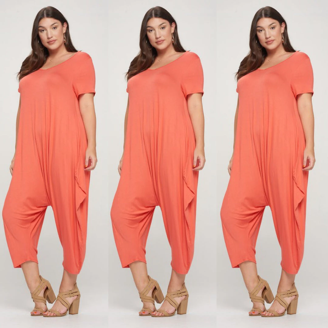 Orange coral romper jumpsuit could go for a dressy casual look with heels and maybe add a jacket. Looks great also as casual look with flats or sandals. Scoop neckline that is very cool and comfy to wear. Fabric is a soft flowing cotton and jumpsuit is a loose fit. Model is 5 feet 7 inches tall. Jumpsuit will be longer on ladies who are petit or shorter. The romper will be shorter if you are taller. Overall just very cute and comfy and the fabric the best weight of not to thick but not to thin either. Ships form Houston Texas by Social Butterfly Collection.