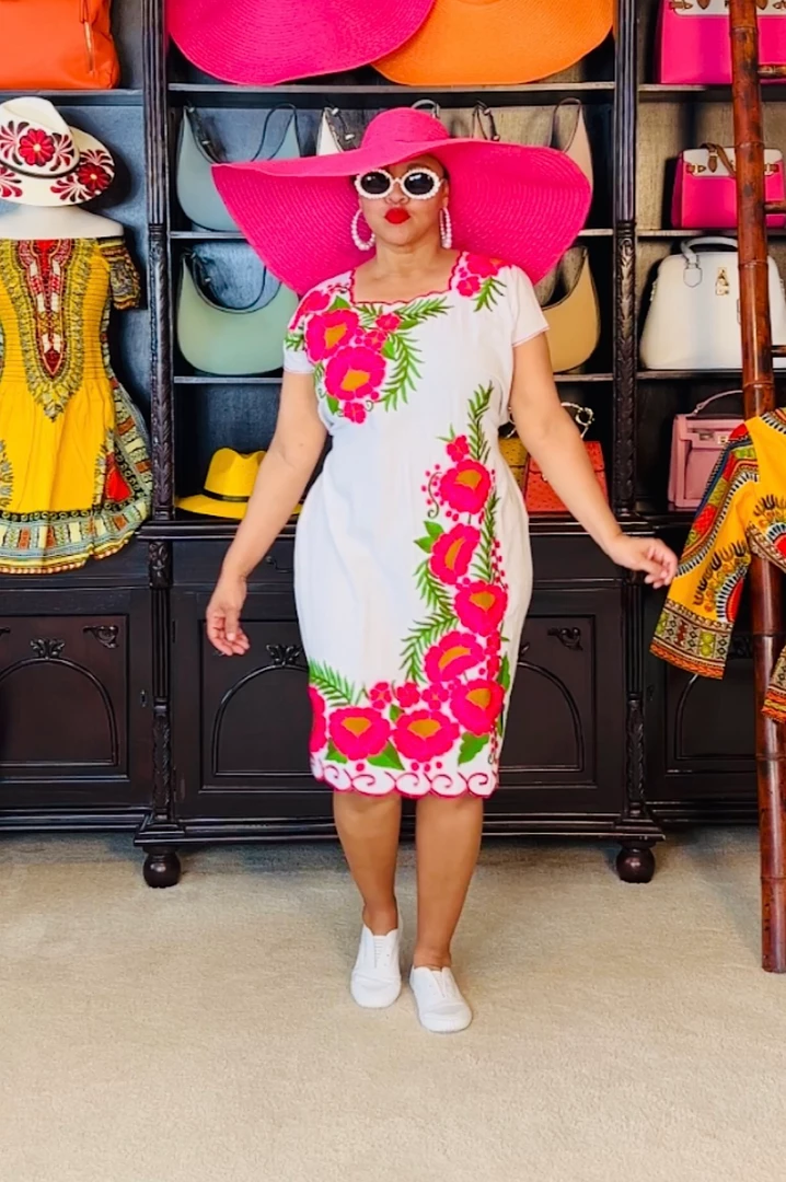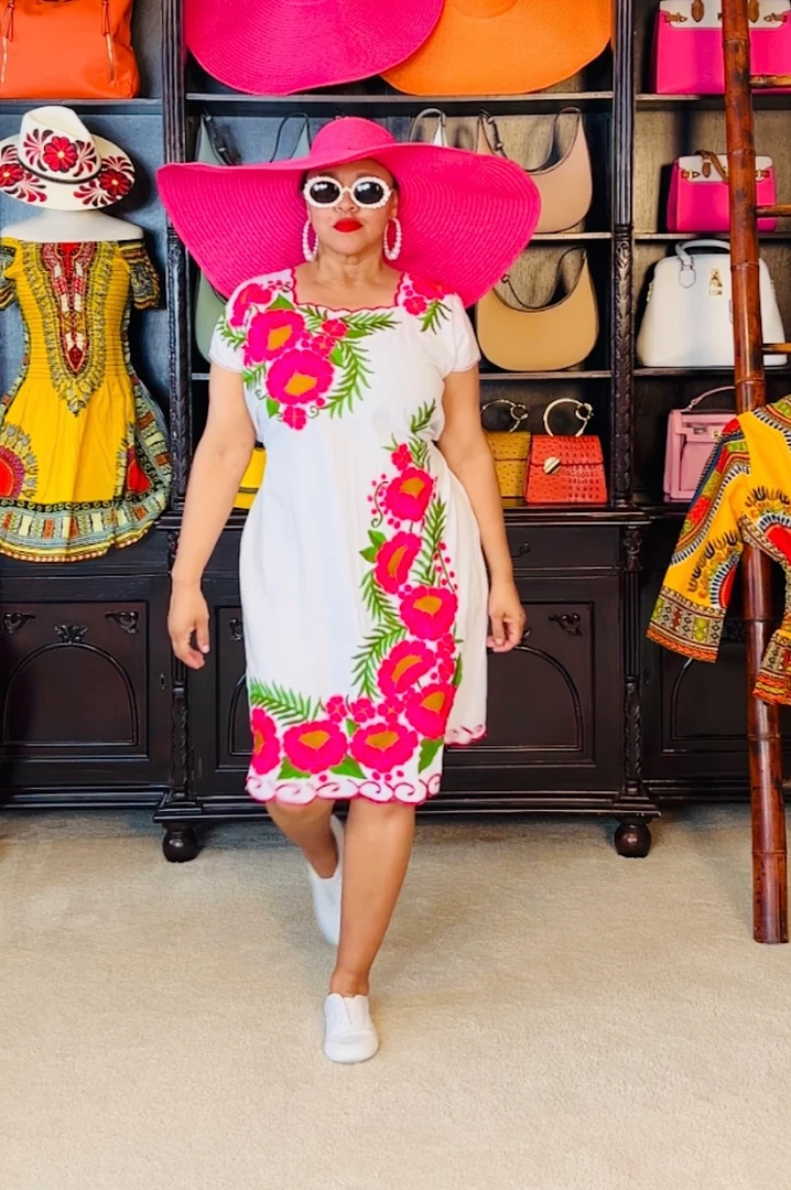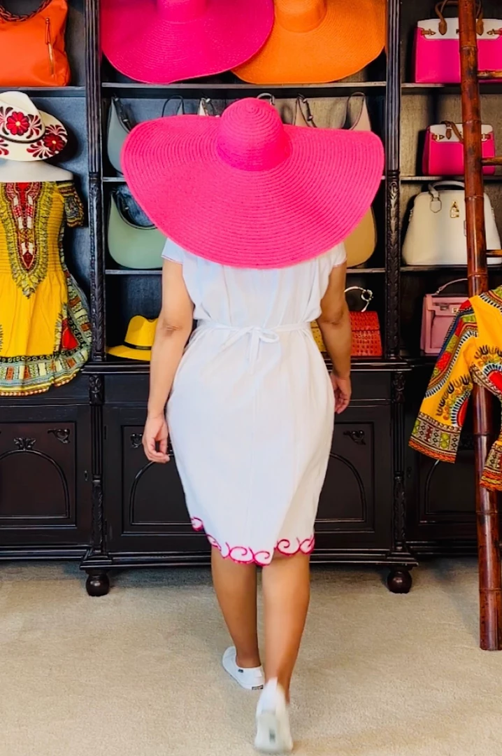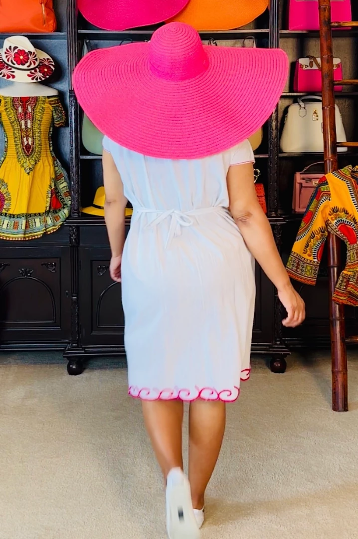 Pack this little number whenever you travel or go on vacation. White cotton dress with pink embroidered flowers. Dress is very simple and easy to wear on vacation outings/excursions or backyard pool gatherings. Would also be a great little dress for outside festivals or summertime outside lawn concerts. Dress fits loose and you can use the back ties to cinch in your waistline. Ships from Houston, Texas by Social Butterfly Collection.