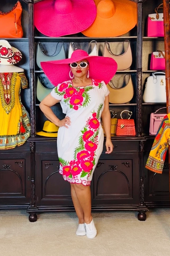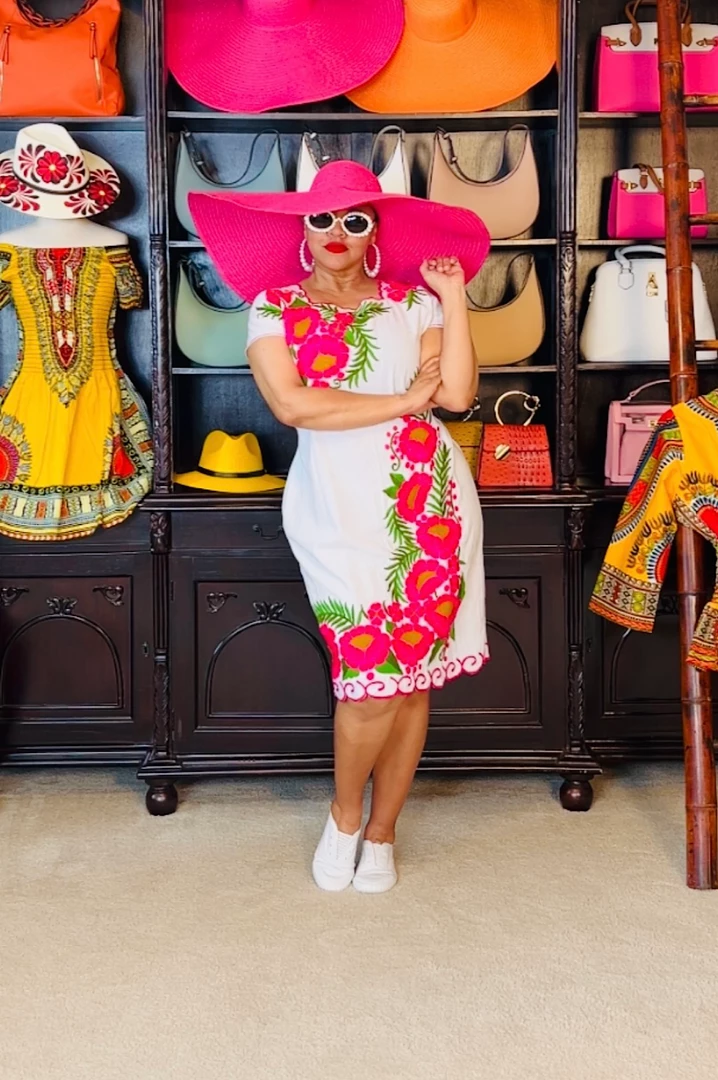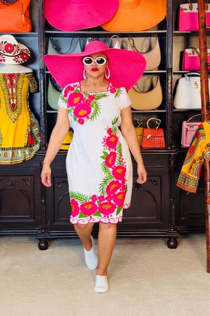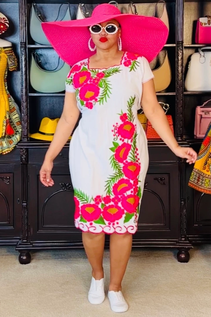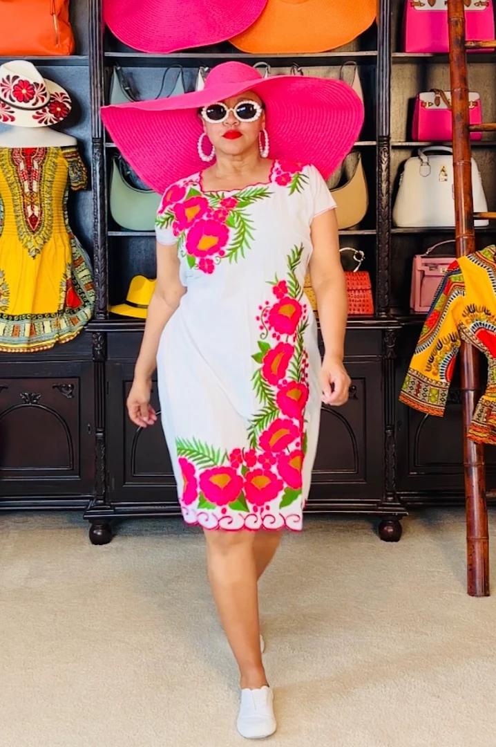 Pack this little number whenever you travel or go on vacation. White cotton dress with pink embroidered flowers. Dress is very simple and easy to wear on vacation outings/excursions or backyard pool gatherings. Would also be a great little dress for outside festivals or summertime outside lawn concerts. Dress fits loose and you can use the back ties to cinch in your waistline. Ships from Houston, Texas by Social Butterfly Collection.