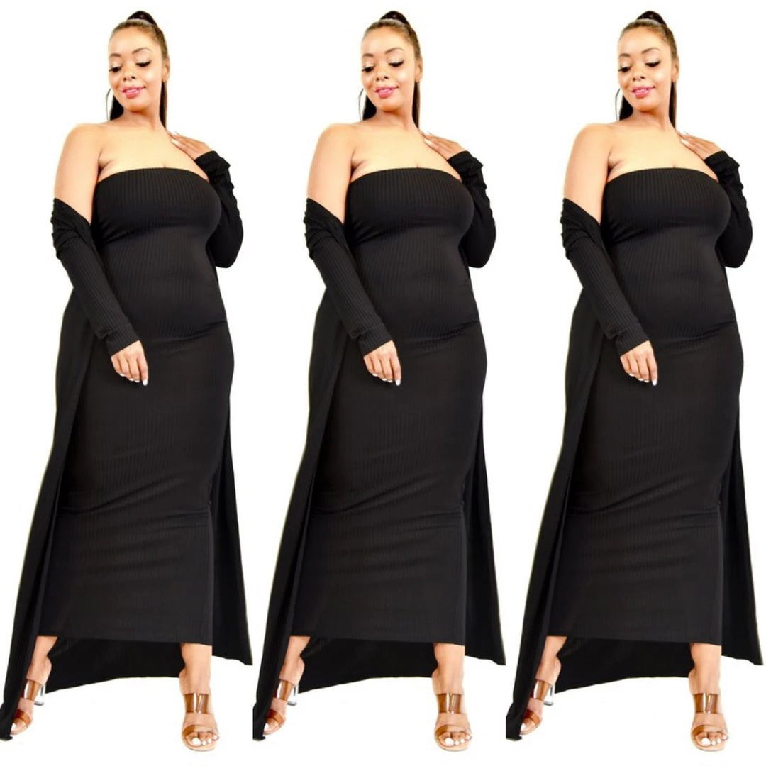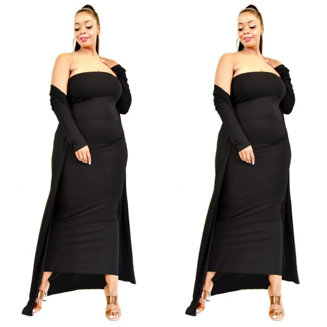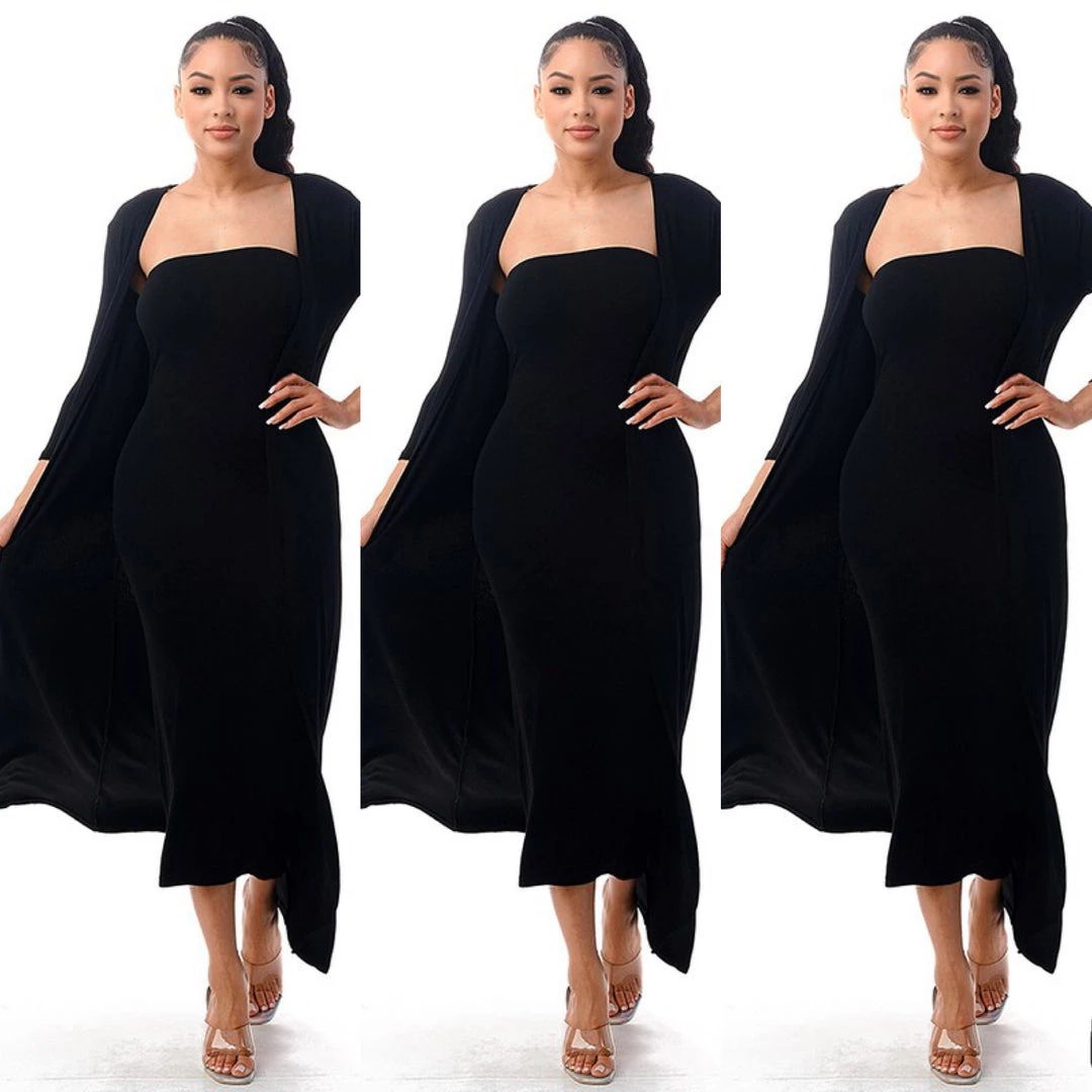 Incredibly soft and ribbed knit two piece tube dress and duster set. The dress is designed to stop well below the knees to the ankles and the duster will fall even longer in length to give you great coverage in the back. Soft to the touch with texture and ribbing. Dress is true to size and is designed to be form fitted but has great stretch. Dress is sleeveless and strapless and fits like a tube top. The duster has long sleeves that can be worn long to the wrist or pushed up to the elbows. This outfit is super comfy. You can dress it way up or surely dress casually or wear as lounger around the house when you want to be cute while entertaining at home. Please keep in mind that the dress is designed to be very form fitted and will hug every curve. The duster does fit loose and will provide coverage. Material is a cotton spandex blend with good stretch. Set comes in black, kiwi green, and light blue. Ships from Houston, Texas by Social Butterfly Collection.