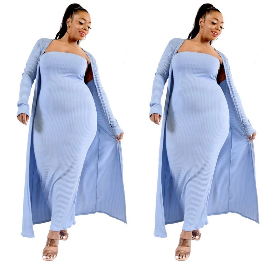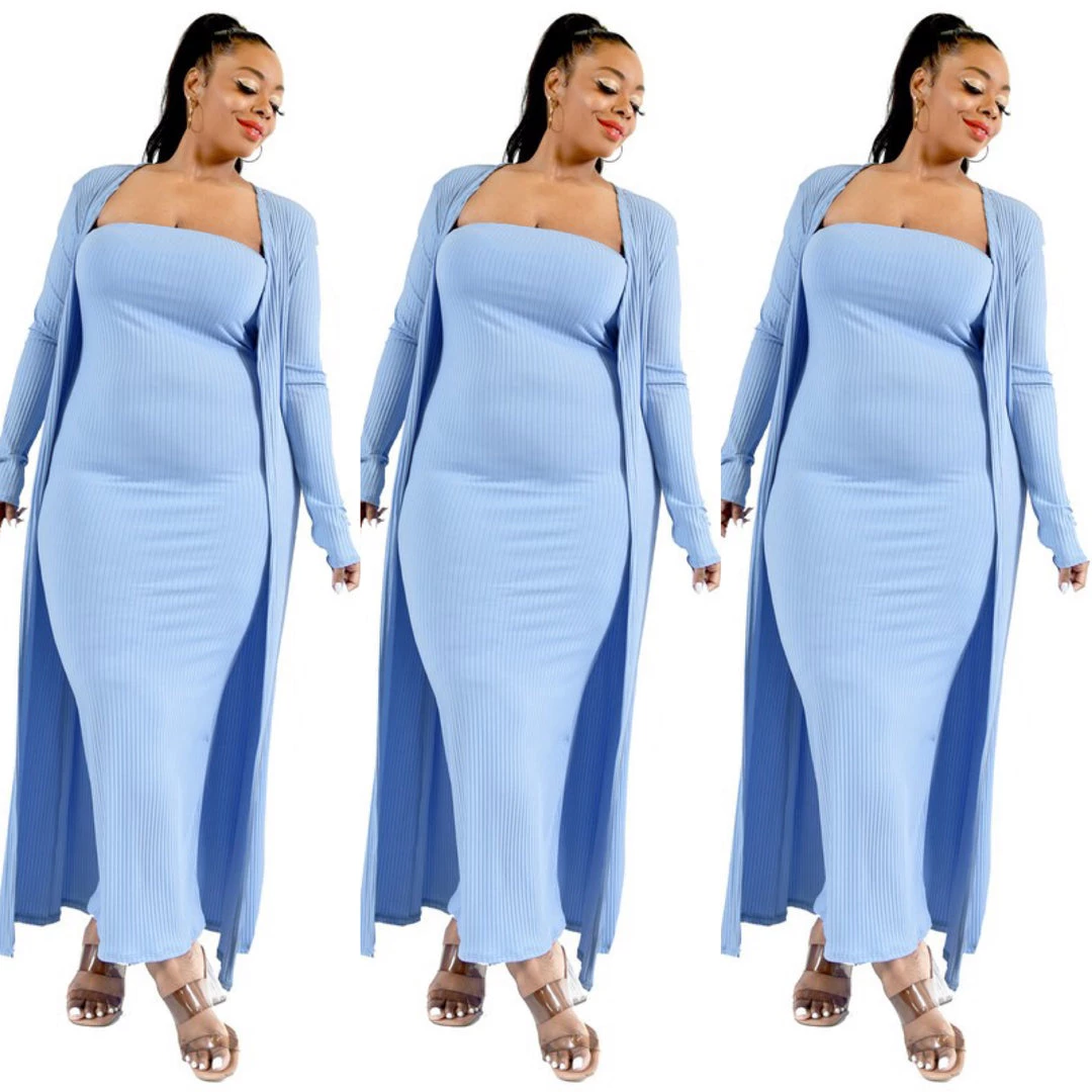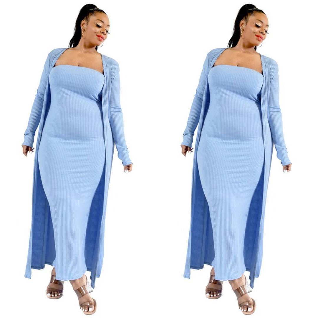 Plus Size Light Blue Two Piece Form Fitted Dress Duster Set