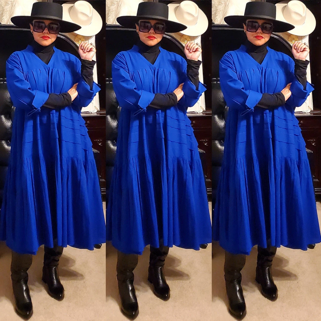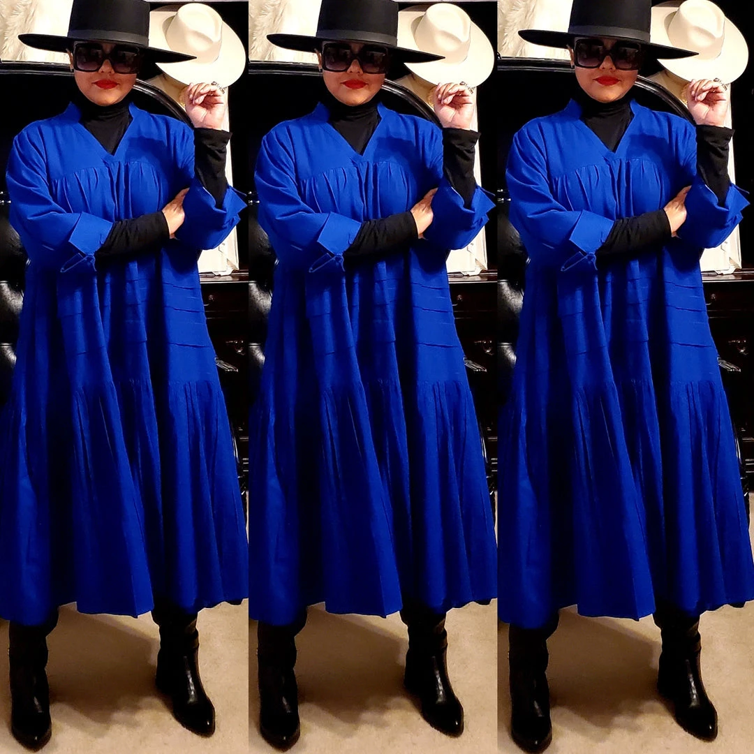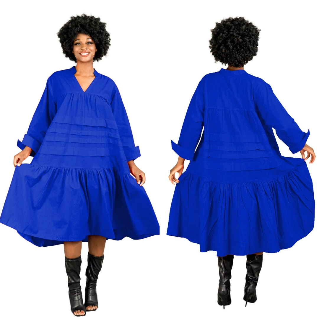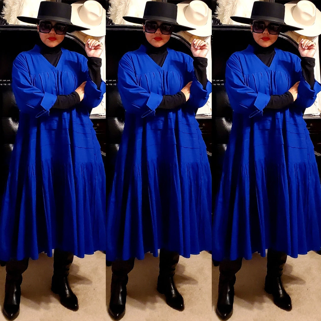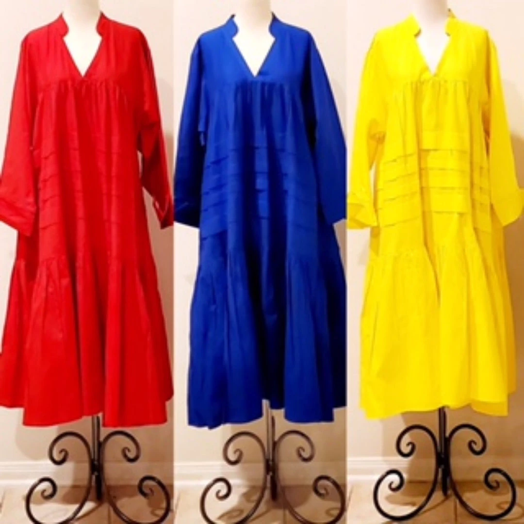 This dress is 48 inches long from shoulder to the bottom and designed to fall below the knee.. This dress will surely drop below your knees. Perfect length for church and comfort will sitting and standing to get the leg coverage some of us desire. We do have this same dress in a shorter version that measures 37 inches long. The 37 inch dress top is more short babydoll style that is perfect for shorter or more petite women or for those who prefer the shorter babydoll look. Dress fits loose and runs big in fit. If you order this dress, you will get the LONGER 45 inches dress. Fabric is perfection and fantastic for year round wear. Need to dress up but you don’t want to fade into the crowd or be over dressed either? Then wearing this beautiful below the knee bohemian style dress will surely make you stand out and be seen while still being comfortable. While everyone is looking at you, you’ll be cool, comfortable and confident because this dress brings out your true effortless style. Wear with heels or sandals and you will be good to go. Dress is very generous in sizing and is designed to fit loose and full. Sleeves are wide long length with turn up French style cuff. V neckline is very flattering. Model is 5 feet 6 inches tall and she has on size 14-16. Model has on a plain black turtle neck underneath dress and flat black boots. Dress only. Dress is available in red, yellow, blue and white.. Ships from Houston, Texas by Social Butterfly Collection.