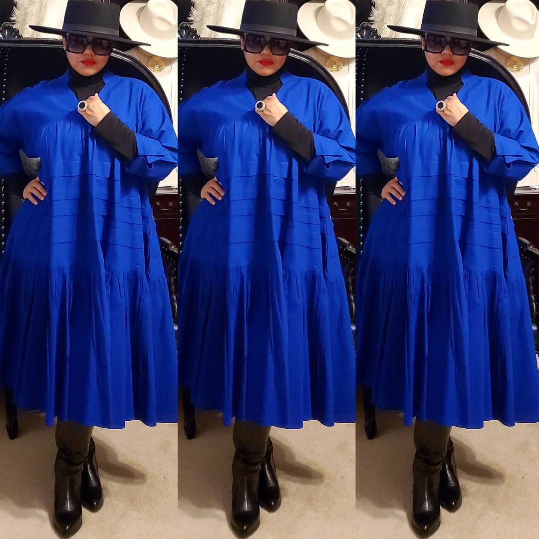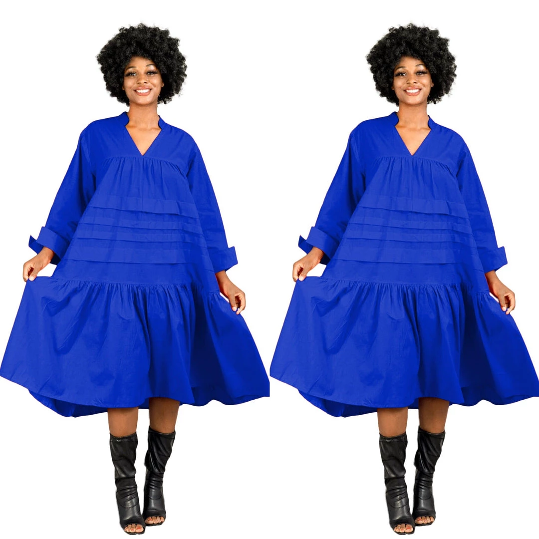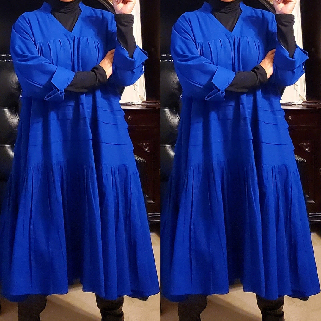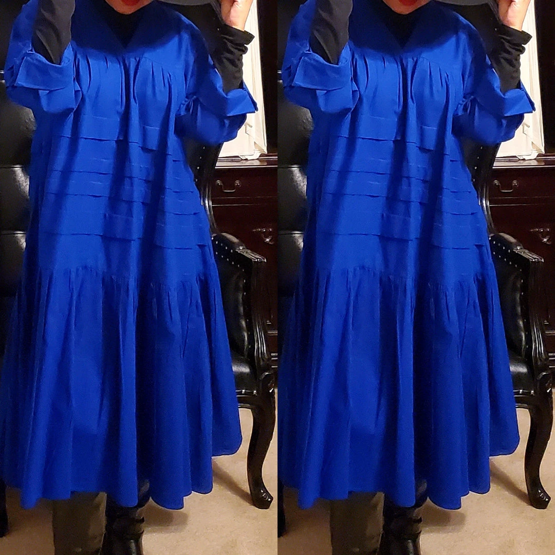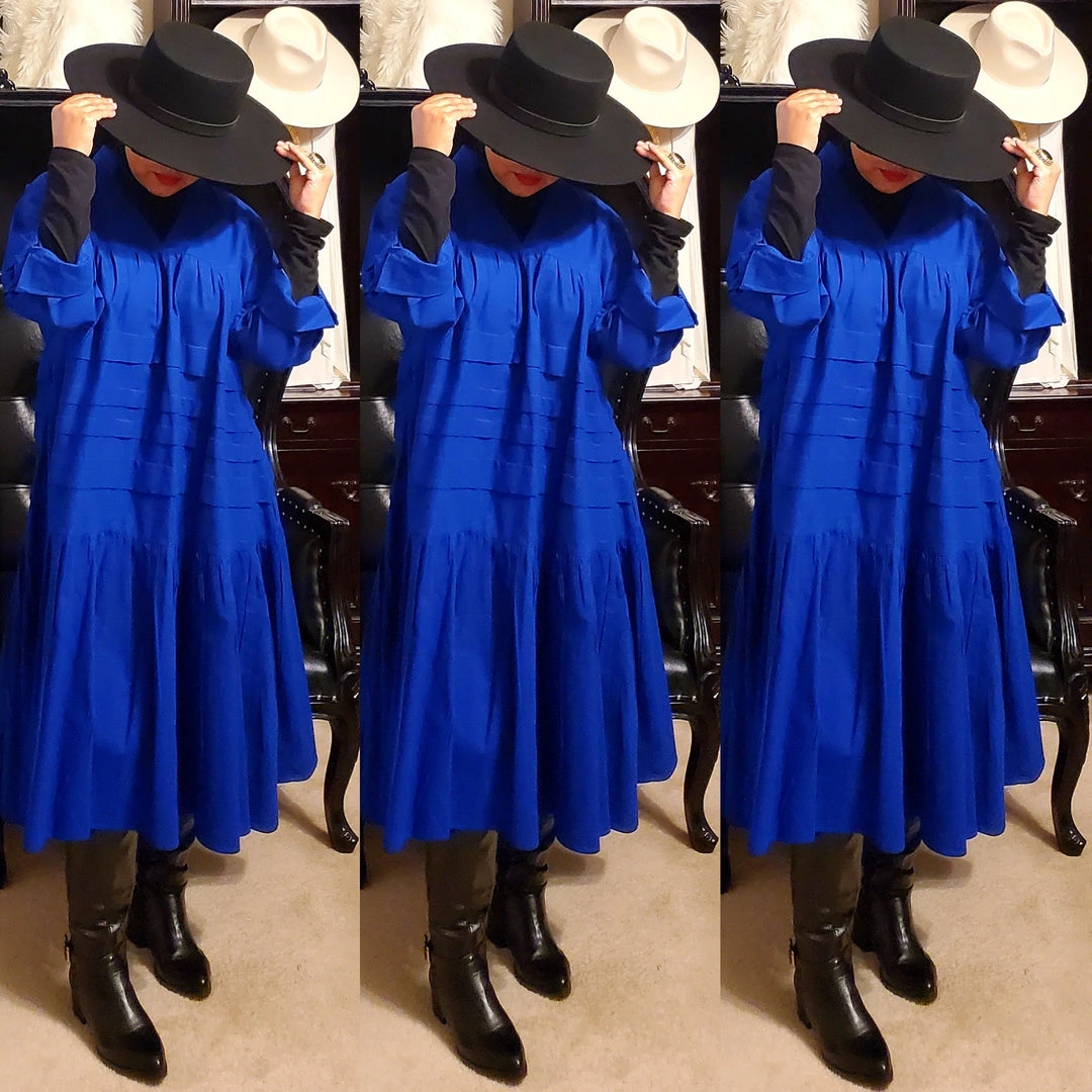 This dress is 48 inches long from shoulder to the bottom and designed to fall below the knee.. This dress will surely drop below your knees. Perfect length for church and comfort will sitting and standing to get the leg coverage some of us desire. We do have this same dress in a shorter version that measures 37 inches long. The 37 inch dress top is more short babydoll style that is perfect for shorter or more petite women or for those who prefer the shorter babydoll look. Dress fits loose and runs big in fit. If you order this dress, you will get the LONGER 45 inches dress. Fabric is perfection and fantastic for year round wear. Need to dress up but you don’t want to fade into the crowd or be over dressed either? Then wearing this beautiful below the knee bohemian style dress will surely make you stand out and be seen while still being comfortable. While everyone is looking at you, you’ll be cool, comfortable and confident because this dress brings out your true effortless style. Wear with heels or sandals and you will be good to go. Dress is very generous in sizing and is designed to fit loose and full. Sleeves are wide long length with turn up French style cuff. V neckline is very flattering. Model is 5 feet 6 inches tall and she has on size 14-16. Model has on a plain black turtle neck underneath dress and flat black boots. Dress only. Dress is available in red, yellow, blue and white.. Ships from Houston, Texas by Social Butterfly Collection.