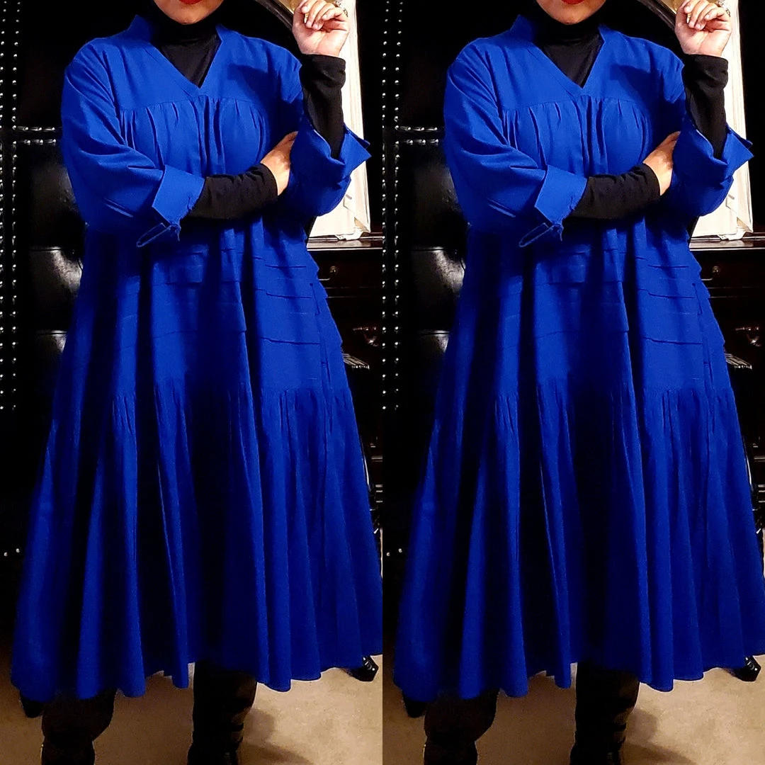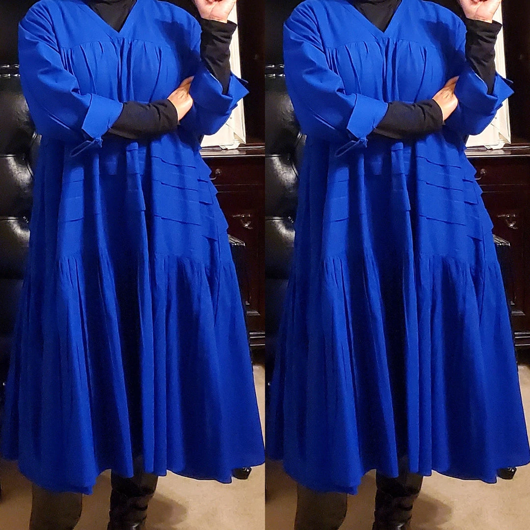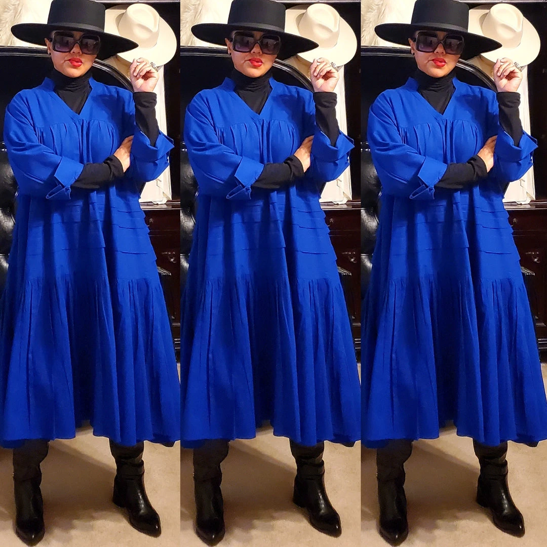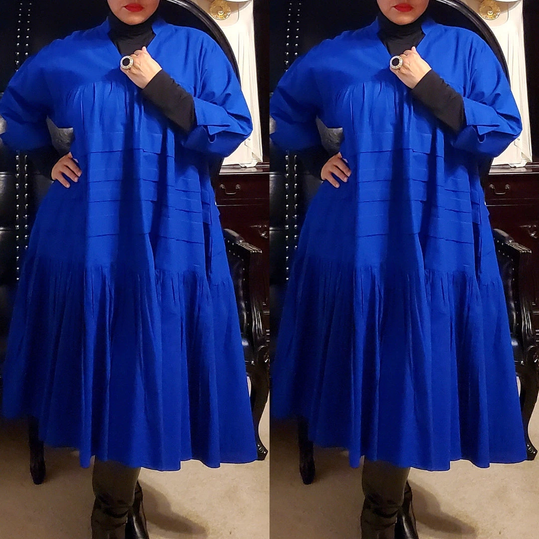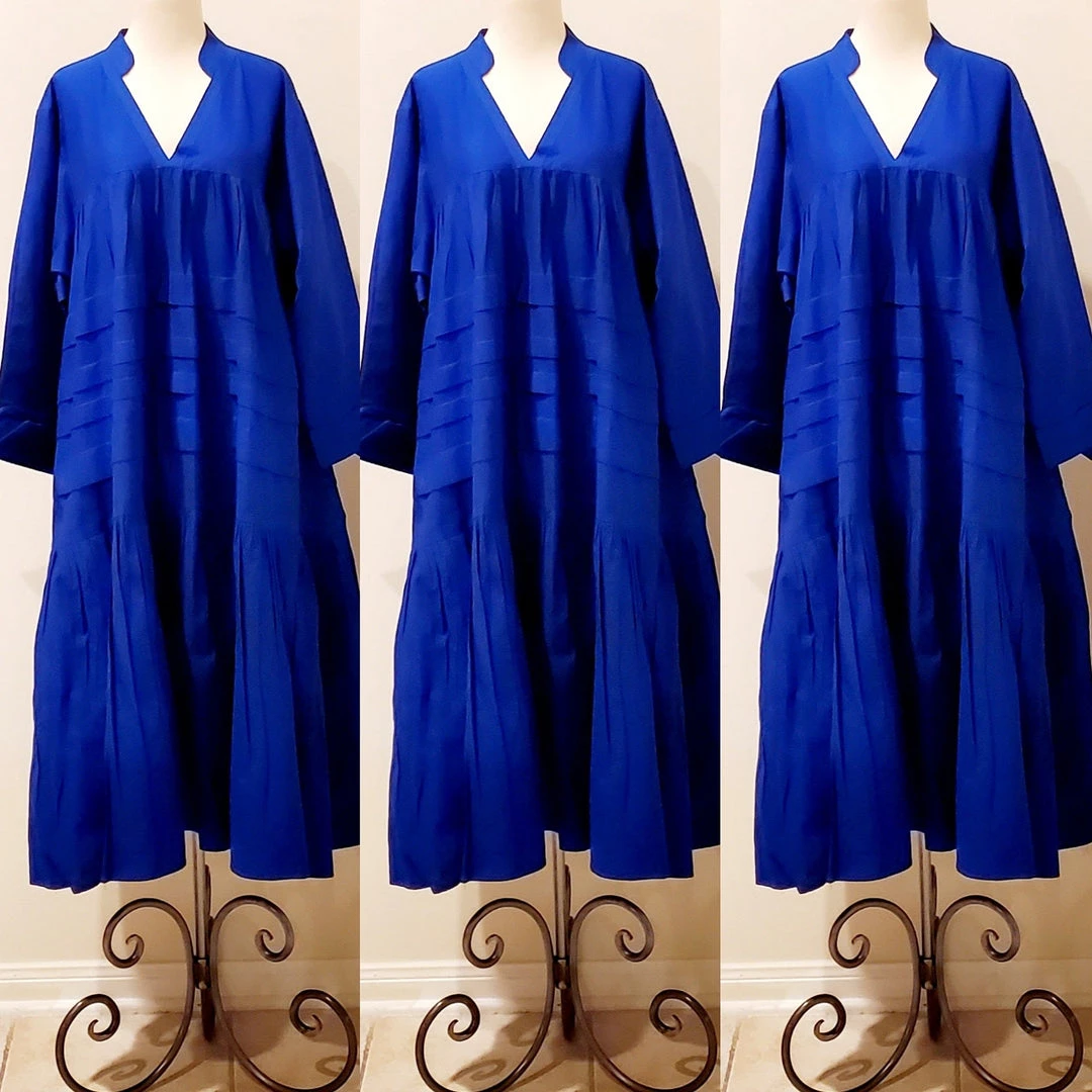 This dress is 48 inches long from shoulder to the bottom and designed to fall below the knee.. This dress will surely drop below your knees. Perfect length for church and comfort will sitting and standing to get the leg coverage some of us desire. We do have this same dress in a shorter version that measures 37 inches long. The 37 inch dress top is more short babydoll style that is perfect for shorter or more petite women or for those who prefer the shorter babydoll look. Dress fits loose and runs big in fit. If you order this dress, you will get the LONGER 45 inches dress. Fabric is perfection and fantastic for year round wear. Need to dress up but you don’t want to fade into the crowd or be over dressed either? Then wearing this beautiful below the knee bohemian style dress will surely make you stand out and be seen while still being comfortable. While everyone is looking at you, you’ll be cool, comfortable and confident because this dress brings out your true effortless style. Wear with heels or sandals and you will be good to go. Dress is very generous in sizing and is designed to fit loose and full. Sleeves are wide long length with turn up French style cuff. V neckline is very flattering. Model is 5 feet 6 inches tall and she has on size 14-16. Model has on a plain black turtle neck underneath dress and flat black boots. Dress only. Dress is available in red, yellow, blue and white.. Ships from Houston, Texas by Social Butterfly Collection.