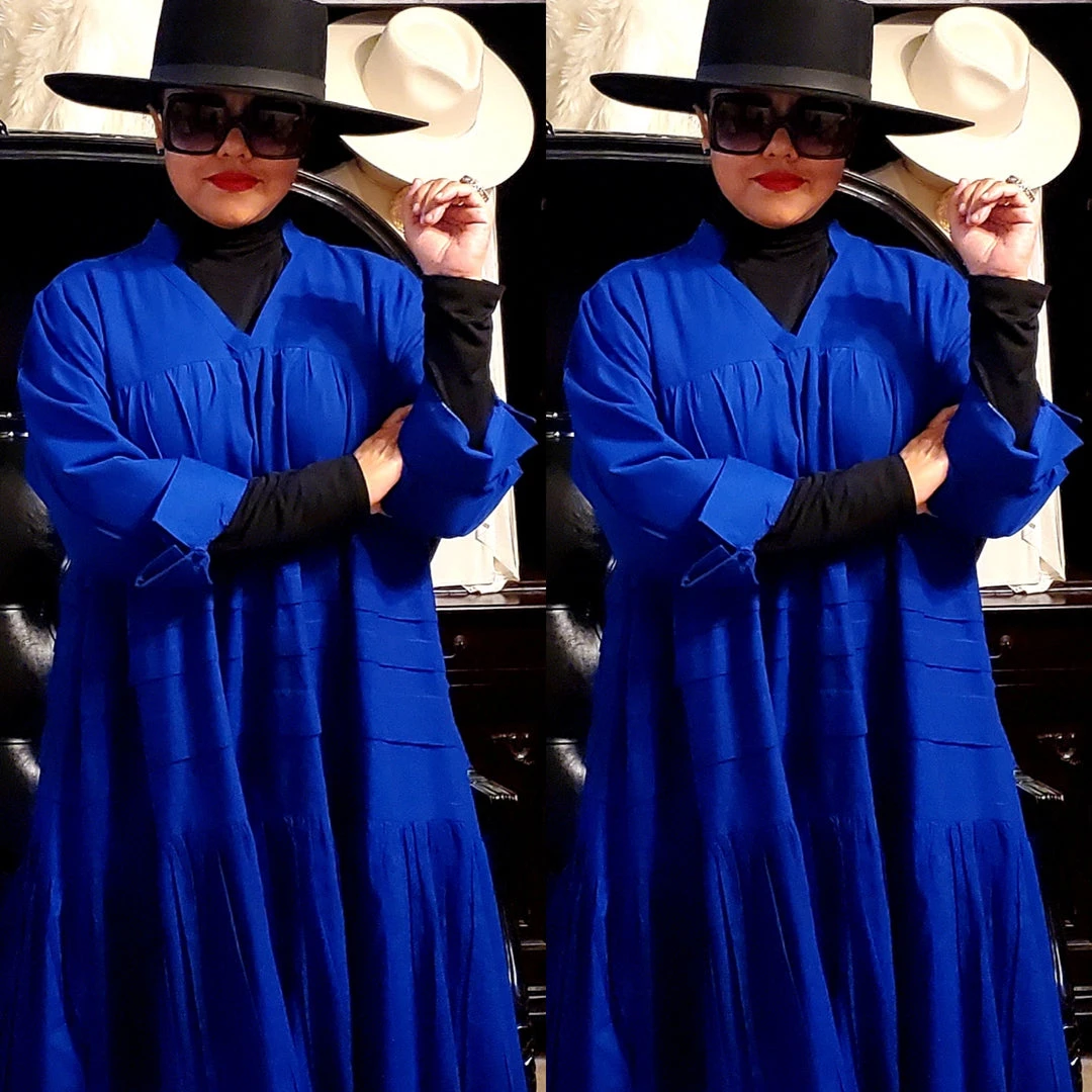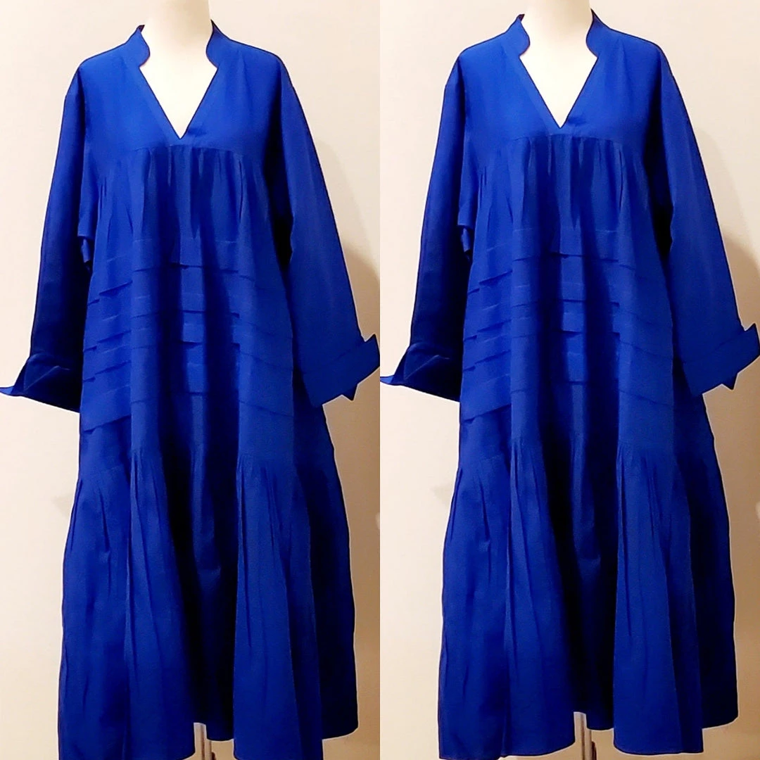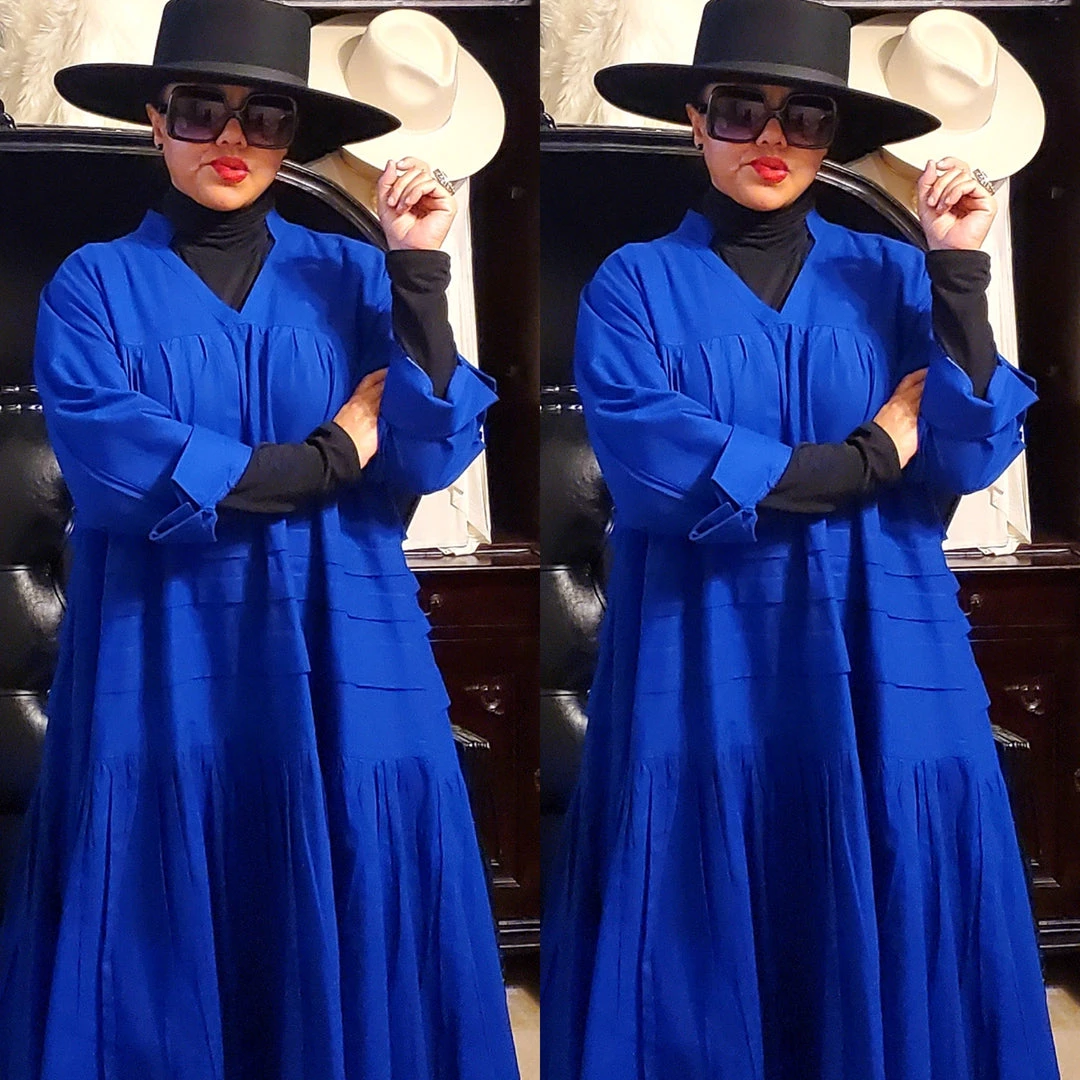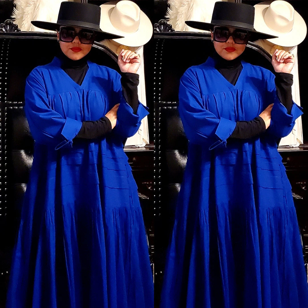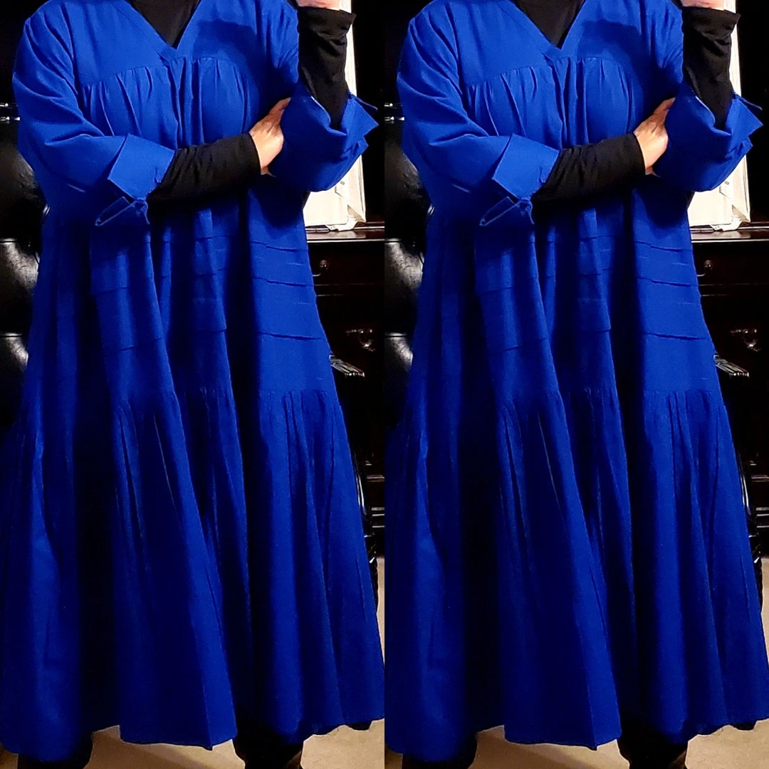 This dress is 48 inches long from shoulder to the bottom and designed to fall below the knee.. This dress will surely drop below your knees. Perfect length for church and comfort will sitting and standing to get the leg coverage some of us desire. We do have this same dress in a shorter version that measures 37 inches long. The 37 inch dress top is more short babydoll style that is perfect for shorter or more petite women or for those who prefer the shorter babydoll look. Dress fits loose and runs big in fit. If you order this dress, you will get the LONGER 45 inches dress. Fabric is perfection and fantastic for year round wear. Need to dress up but you don’t want to fade into the crowd or be over dressed either? Then wearing this beautiful below the knee bohemian style dress will surely make you stand out and be seen while still being comfortable. While everyone is looking at you, you’ll be cool, comfortable and confident because this dress brings out your true effortless style. Wear with heels or sandals and you will be good to go. Dress is very generous in sizing and is designed to fit loose and full. Sleeves are wide long length with turn up French style cuff. V neckline is very flattering. Model is 5 feet 6 inches tall and she has on size 14-16. Model has on a plain black turtle neck underneath dress and flat black boots. Dress only. Dress is available in red, yellow, blue and white.. Ships from Houston, Texas by Social Butterfly Collection.