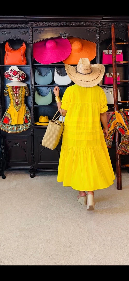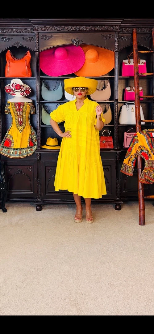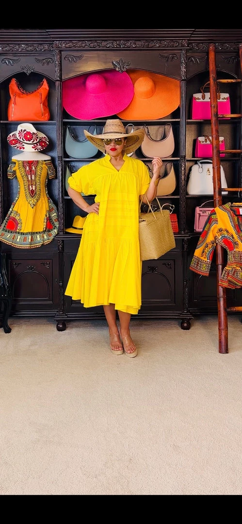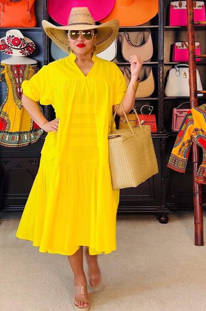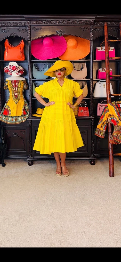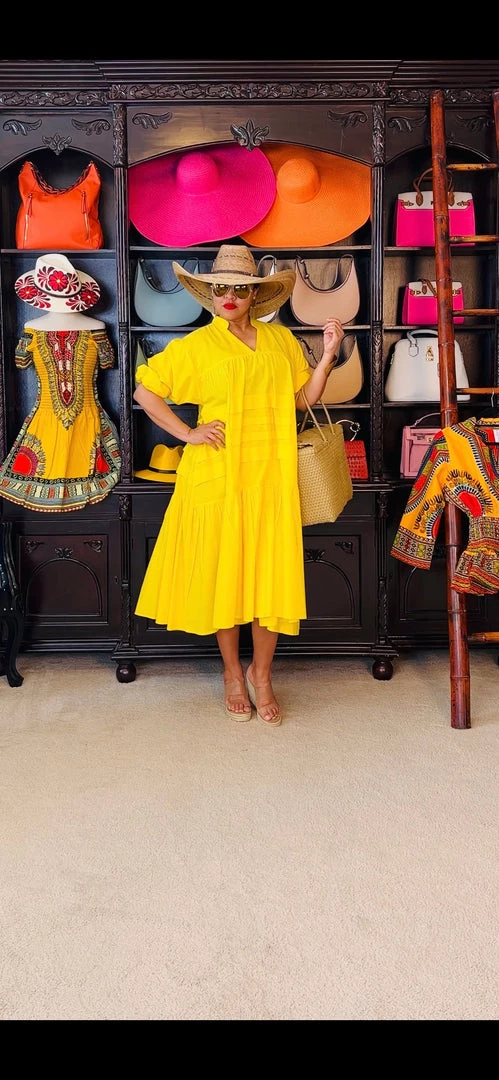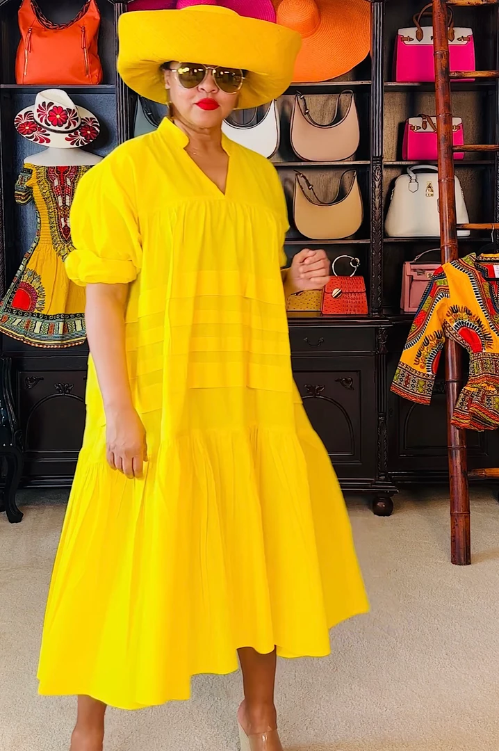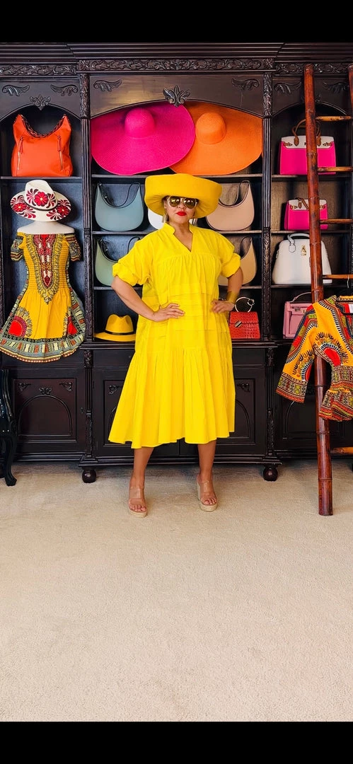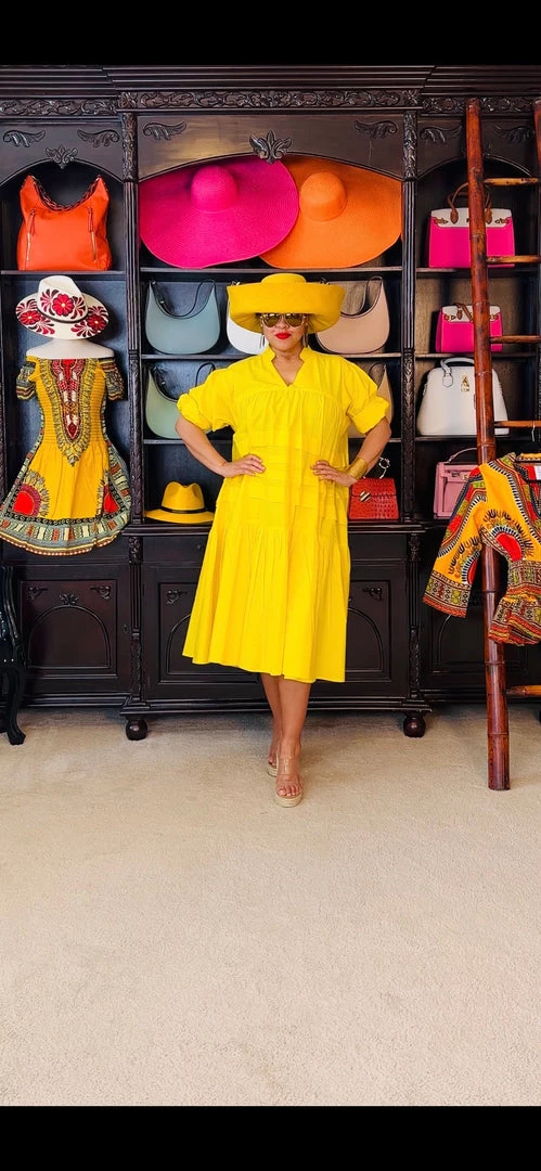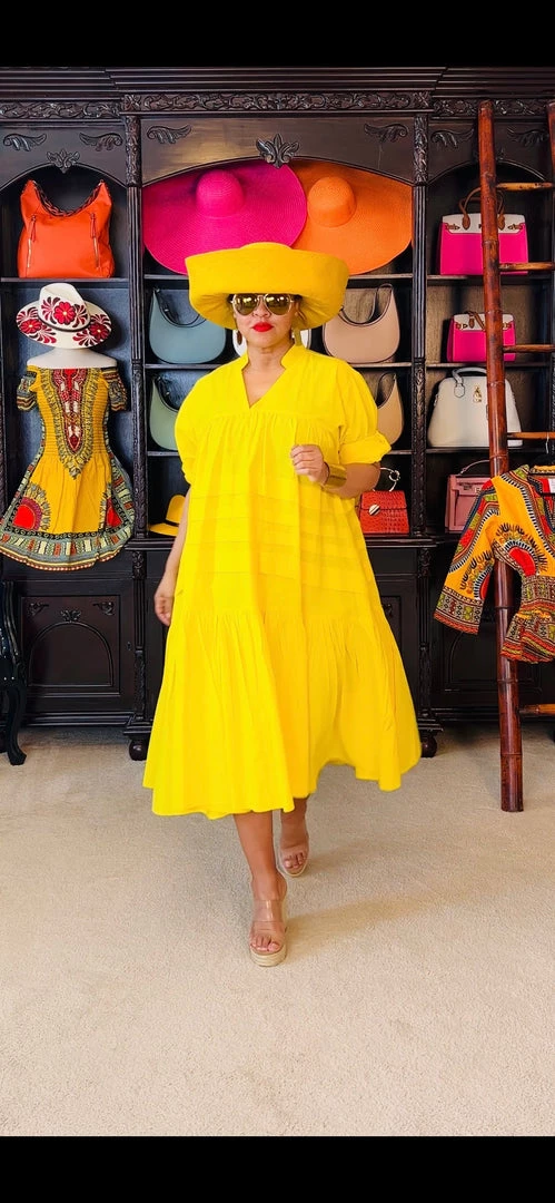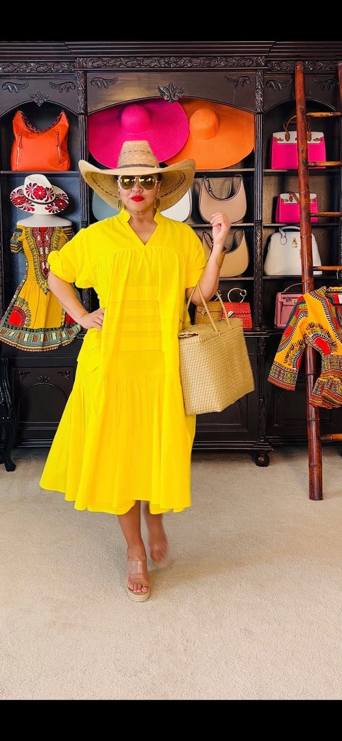 This dress is 48 inches long from shoulder to the bottom and is designed to fall below the knee. This dress will surely drop below your knees. Perfect length for church and comfort will sitting and standing to get the leg coverage some of us desire. We do have this same dress in a shorter version that measures 37 inches long. The 37 inch dress top is more short babydoll style that is perfect for shorter or more petite women or for those who prefer the shorter babydoll look. Babydoll length could also be worn as a tunic top over leggings, pants or jeans. If you order this dress, you will get the LONGER 45 inches dress. Fabric is perfection and fantastic for year round wear. Need to dress up but you don’t want to fade into the crowd or be over dressed either? Then wearing this beautiful below the knee bohemian style dress will surely make you stand out and be seen while still being comfortable. While everyone is looking at you, you’ll be cool, comfortable and confident because this dress brings out your true effortless style. Wear with heels or sandals and you will be good to go. Dress is very generous in sizing and is designed to fit loose and full. Sleeves are wide long length with turn up French style cuff. V neckline is very flattering. Dress is available in red, yellow, blue and white. Ships from Houston, Texas by Social Butterfly Collection.