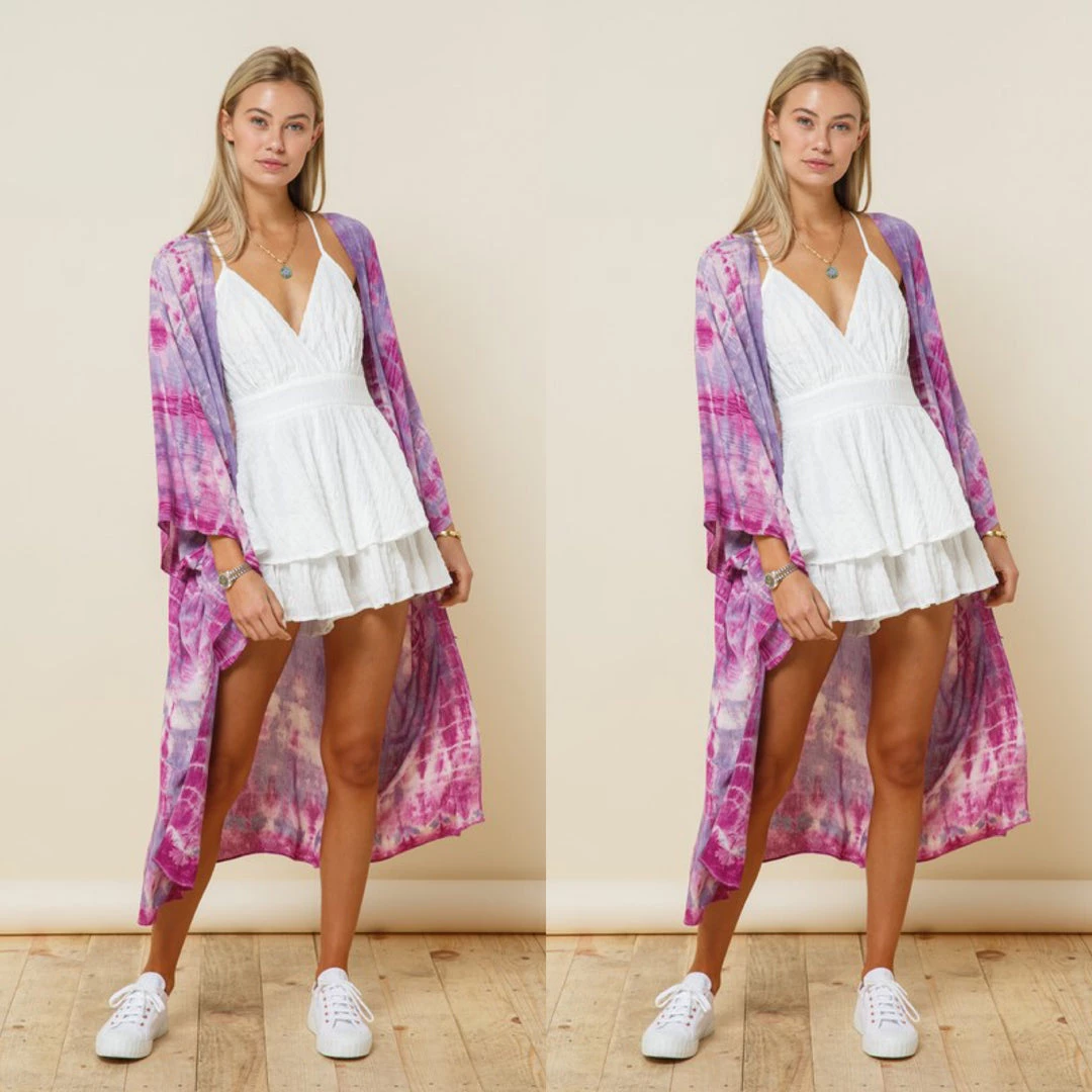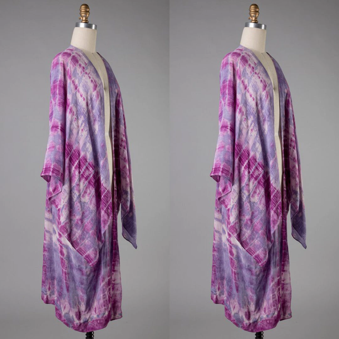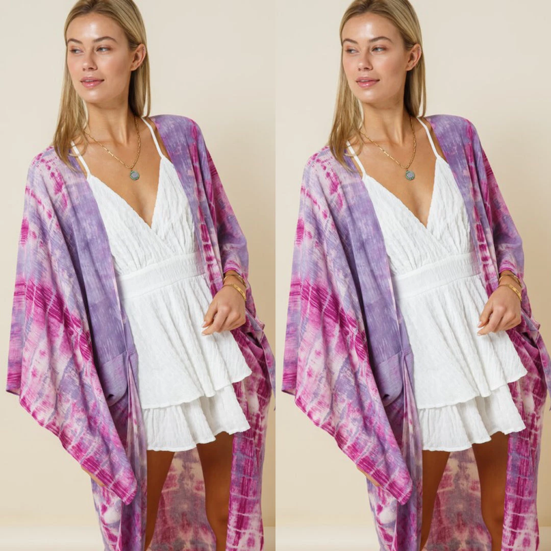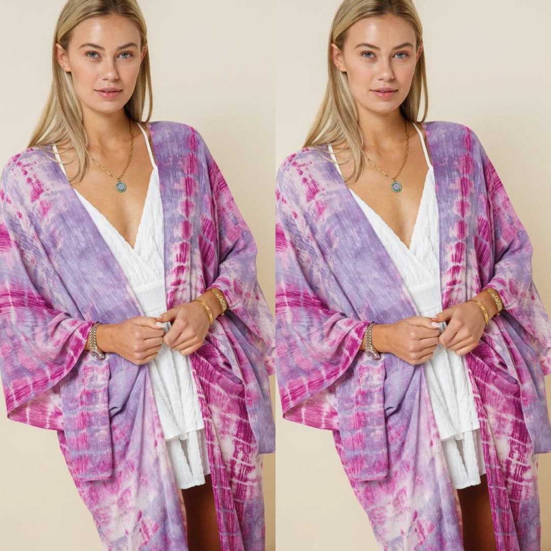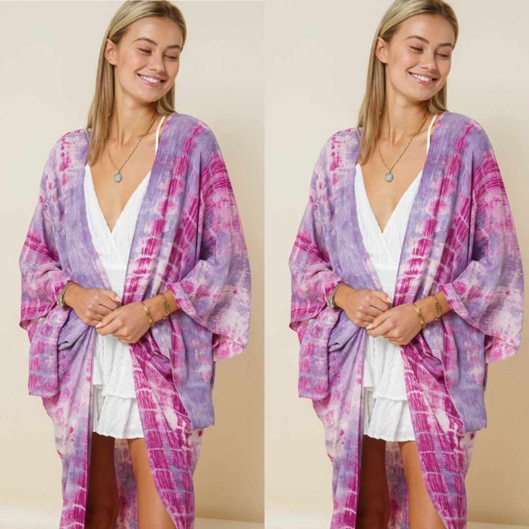 Social Butterfly Collection Purple Pink Tie Dye Kimono Sleeve Sheer Duster New Arrivals