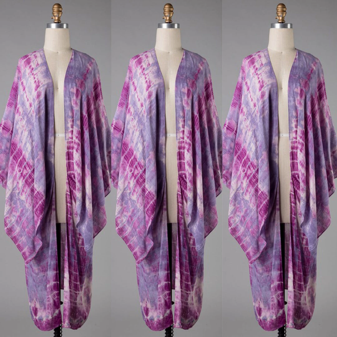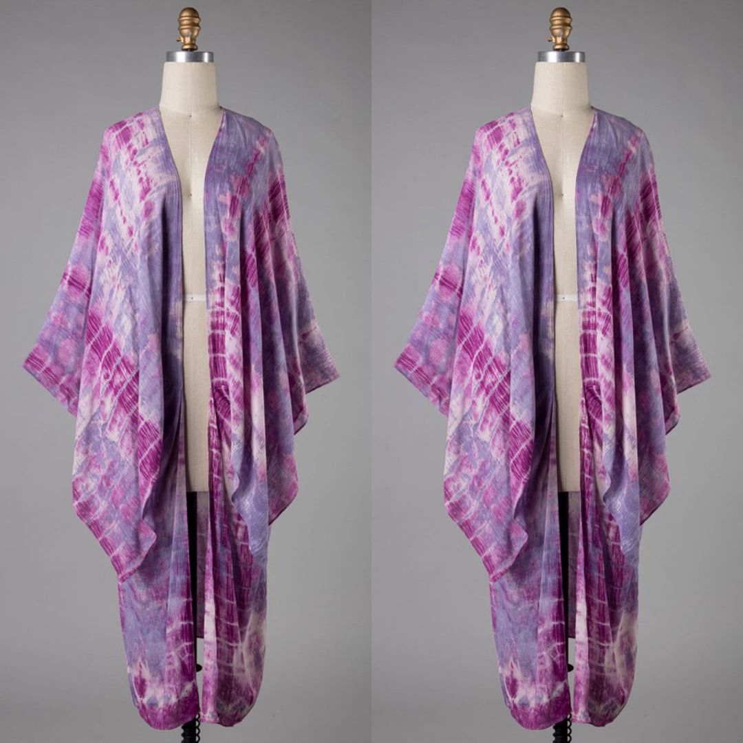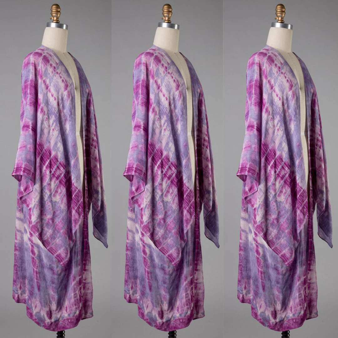 True kimono style wide sleeves. Lightweight duster with purple and pink color tie dye detailing. Sleeves are very wide kimono style. Perfect cover up to go with a wide variety of other pieces like jeans or strapless jumpsuits. Looks great free flowing or maybe cinch it around the waist with one of our kimono style wrap belts. Fabric is super soft and packable that would also be perfect for traveling to take on vacation. Ships from Houston Texas by Social Butterfly Collection.