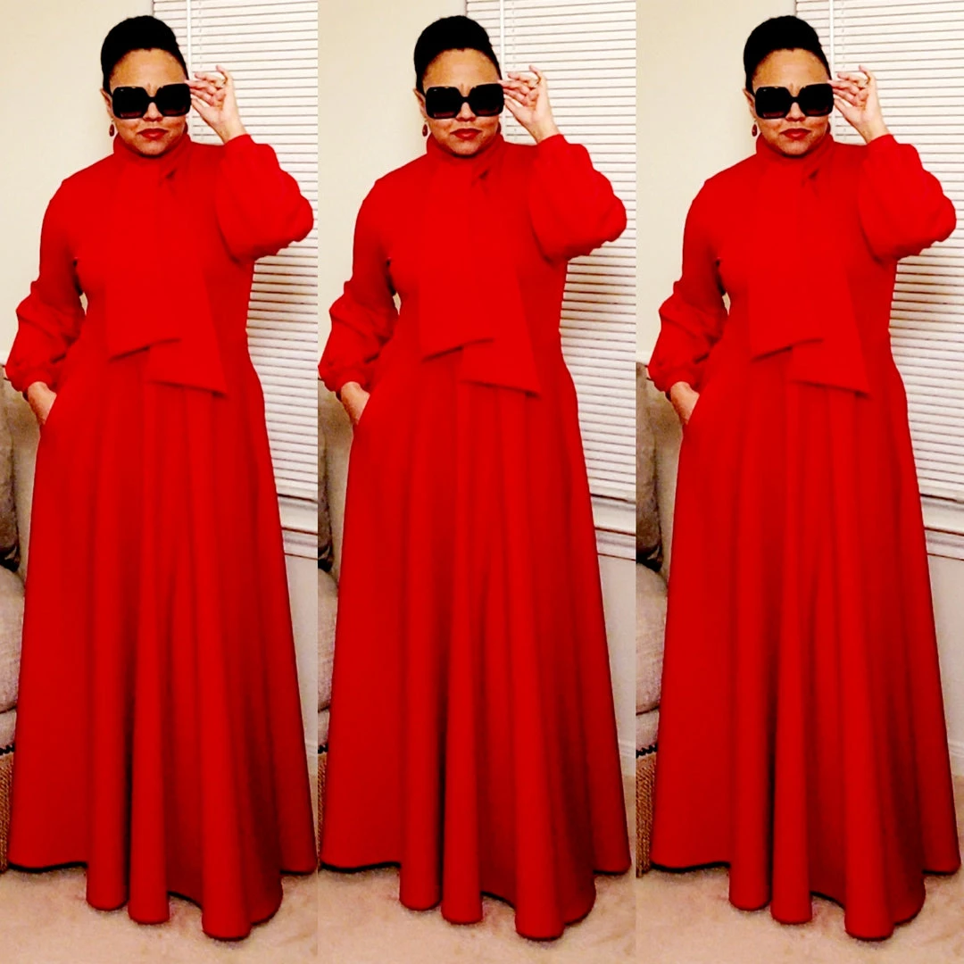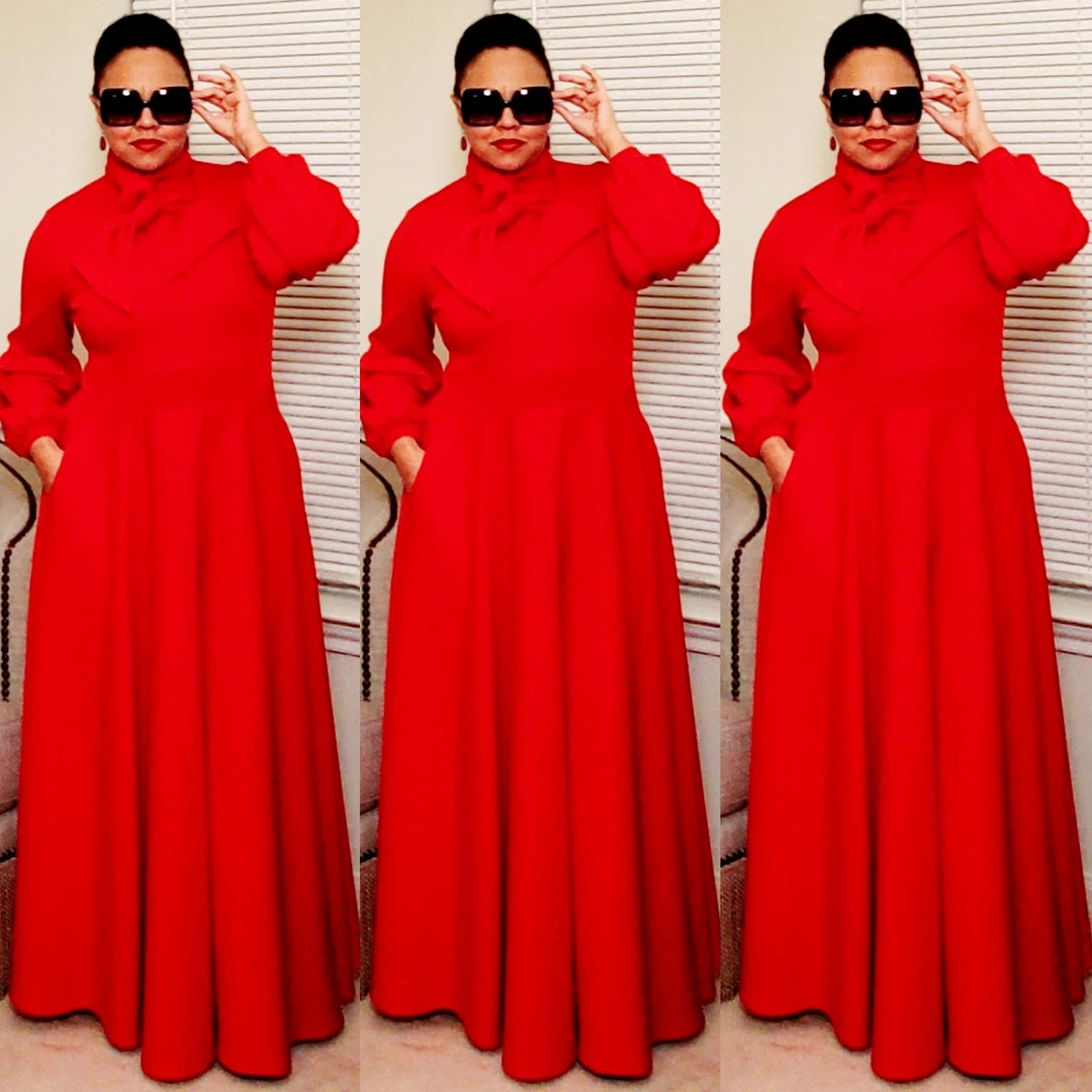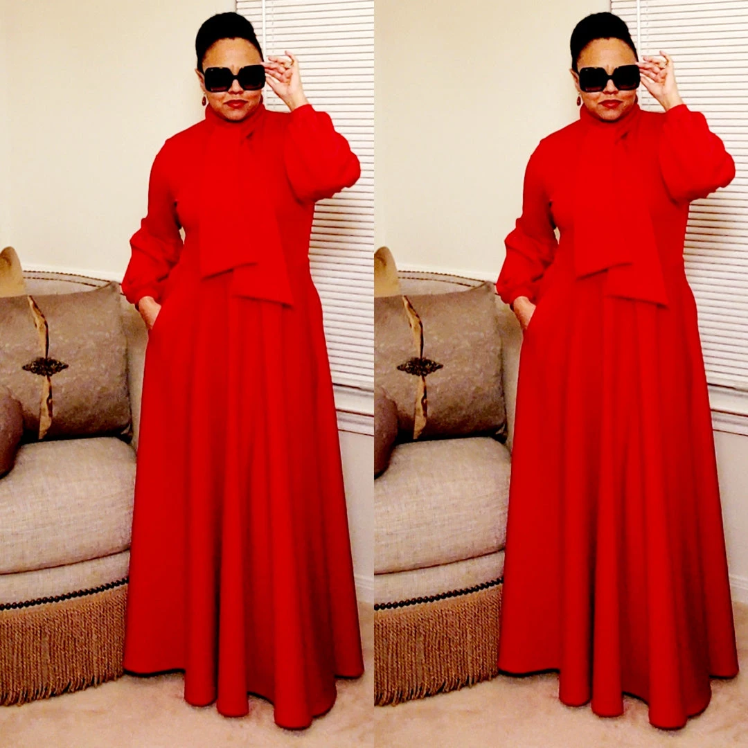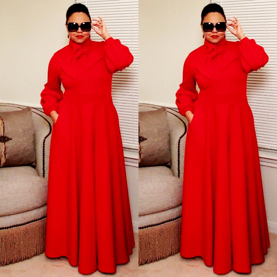 Dress can be worn with the necktie styled in various ways or if you prefer to wear without the necktie just simply fold the neckline inward to create a V Neckline. Please see photos of how we created a plain neckline. The necktie was simply folded and place inside the dress to hang loose inside and now with a simple neckline, you can add necklaces. We also created a simpler longer necktie as well as a shorter triple knotted necktie. Dress gives you versatility of how to wear the necktie area. This classic, high necktie style paired with the long, silhouette style gives you a modest and beautiful choice for your special occasion wear. The long, tapered tie on the front adds a touch of class, while the fit brings just the right amount of sophistication to this incredible dress. Dress runs true to size and the fabric is a stretchy blend of polyester and spandex. Perfect dress for a variety of events. Fabric is perfect medium weight and the dress has hidden side pockets. Bottom of the dress has plenty of room and is generous in sizing. Top of the dress is more fitted than the bottom, so when selecting size for this one, it would be best to choose size based on your top body size or bust and arms. Material does have stretch. If you are top heavy and need more room for your arms, stomach or bust then we suggest going up a size but other than that the dress is true to size and fits well. We suggest going up a size only if you want more room in the stomach, arm or bust section. The bottom of the dress is very loose. Ships from Houston, Texas by Social Butterfly Collection.